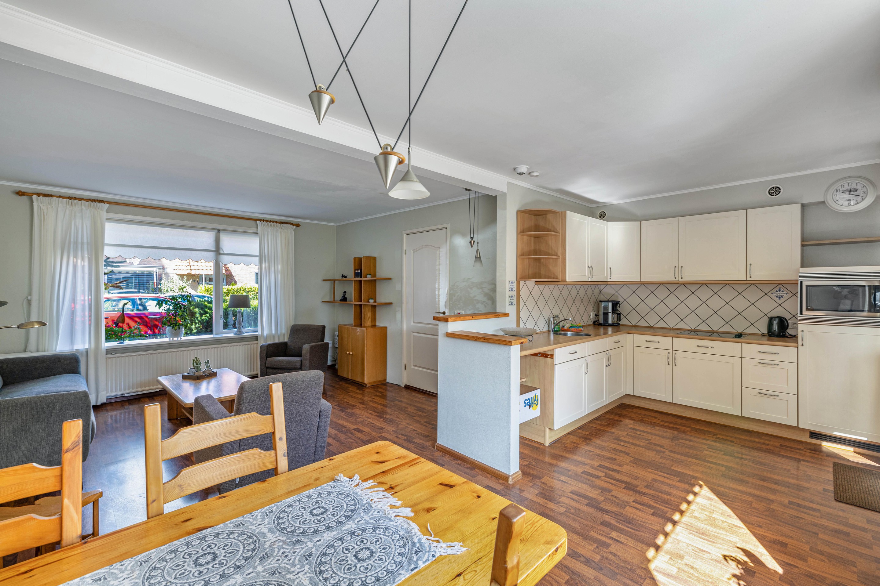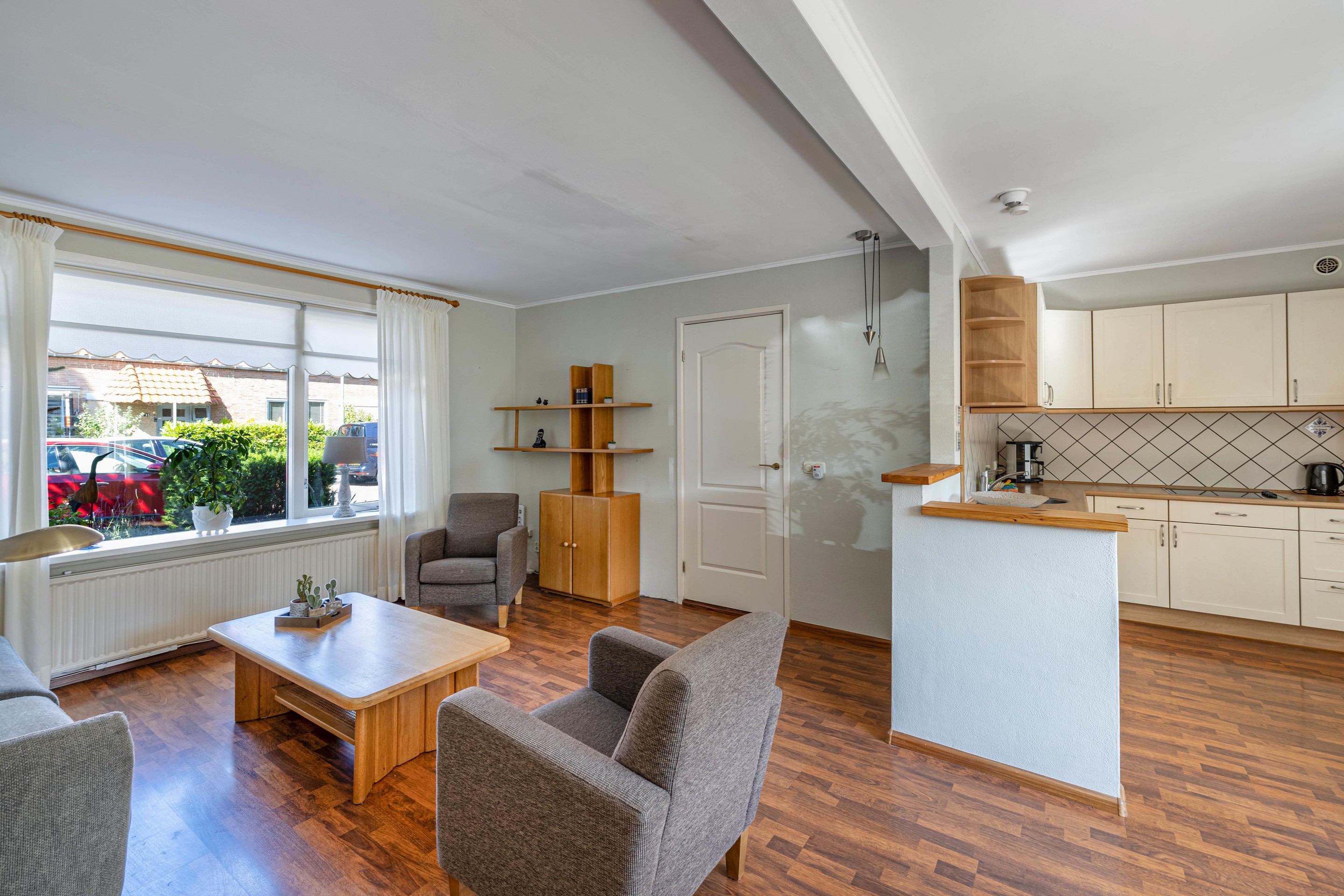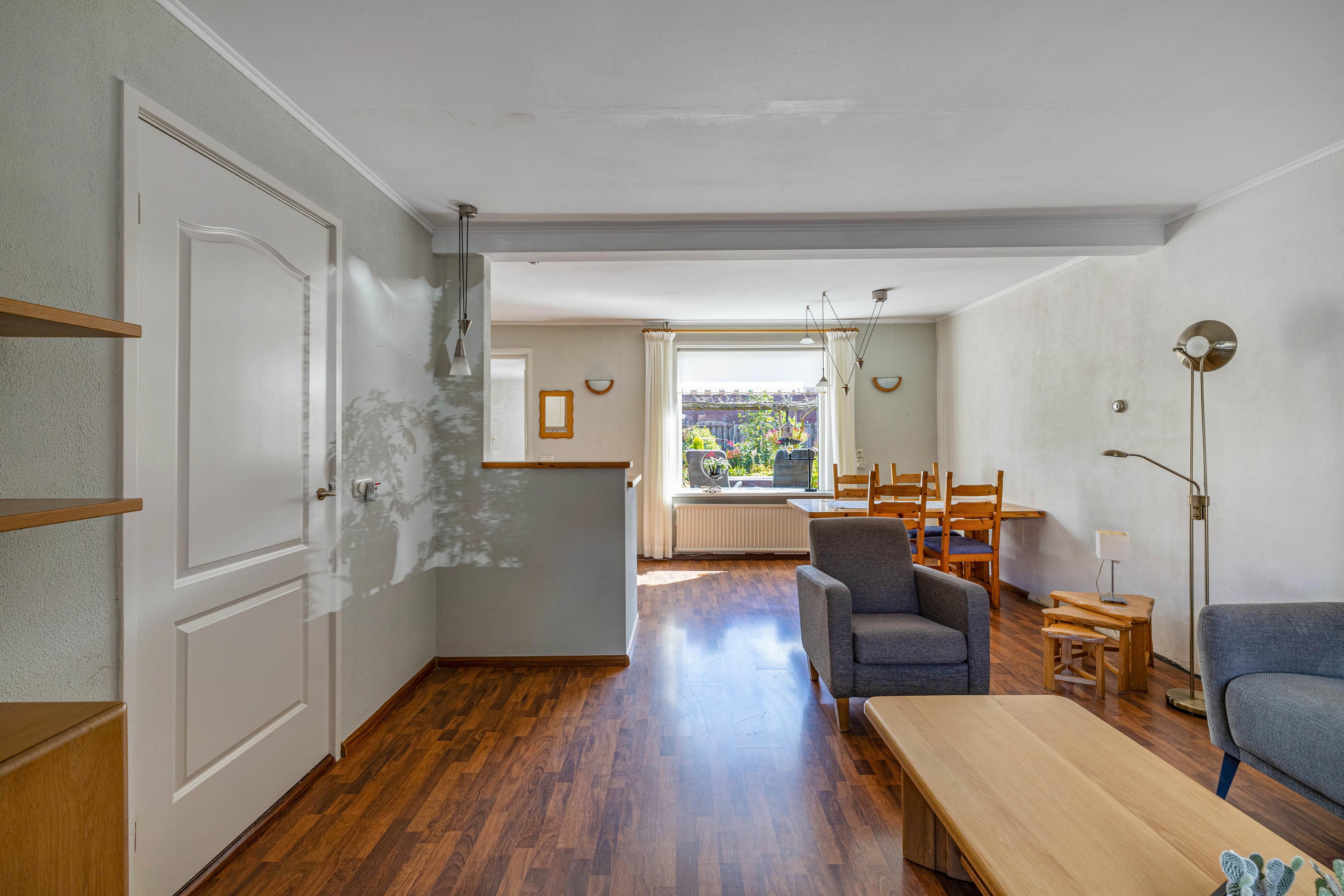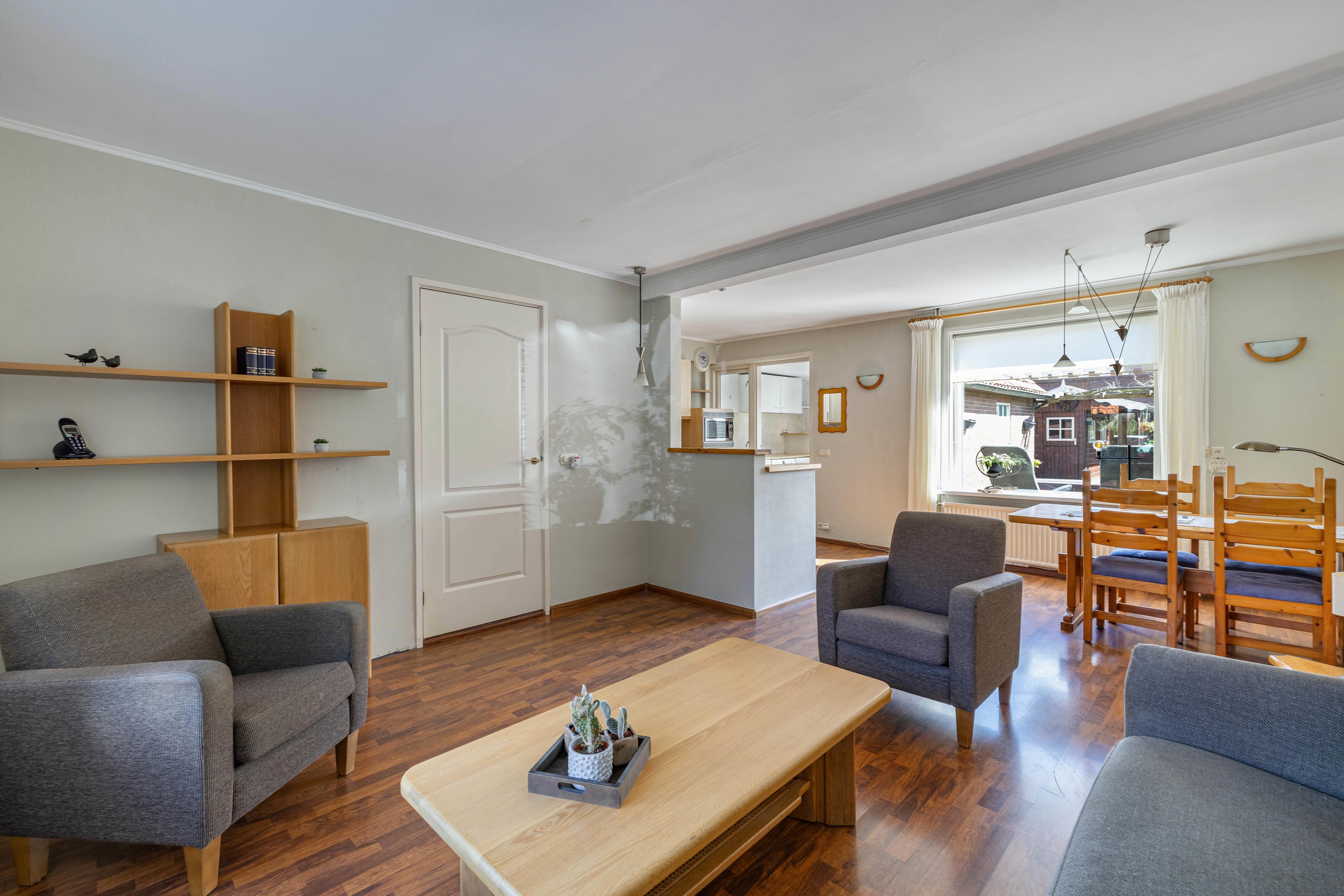 De woonkamer is verdeeld in een zitgedeelte aan de voorzijde en een eetgedeelte aan de achterzijde.