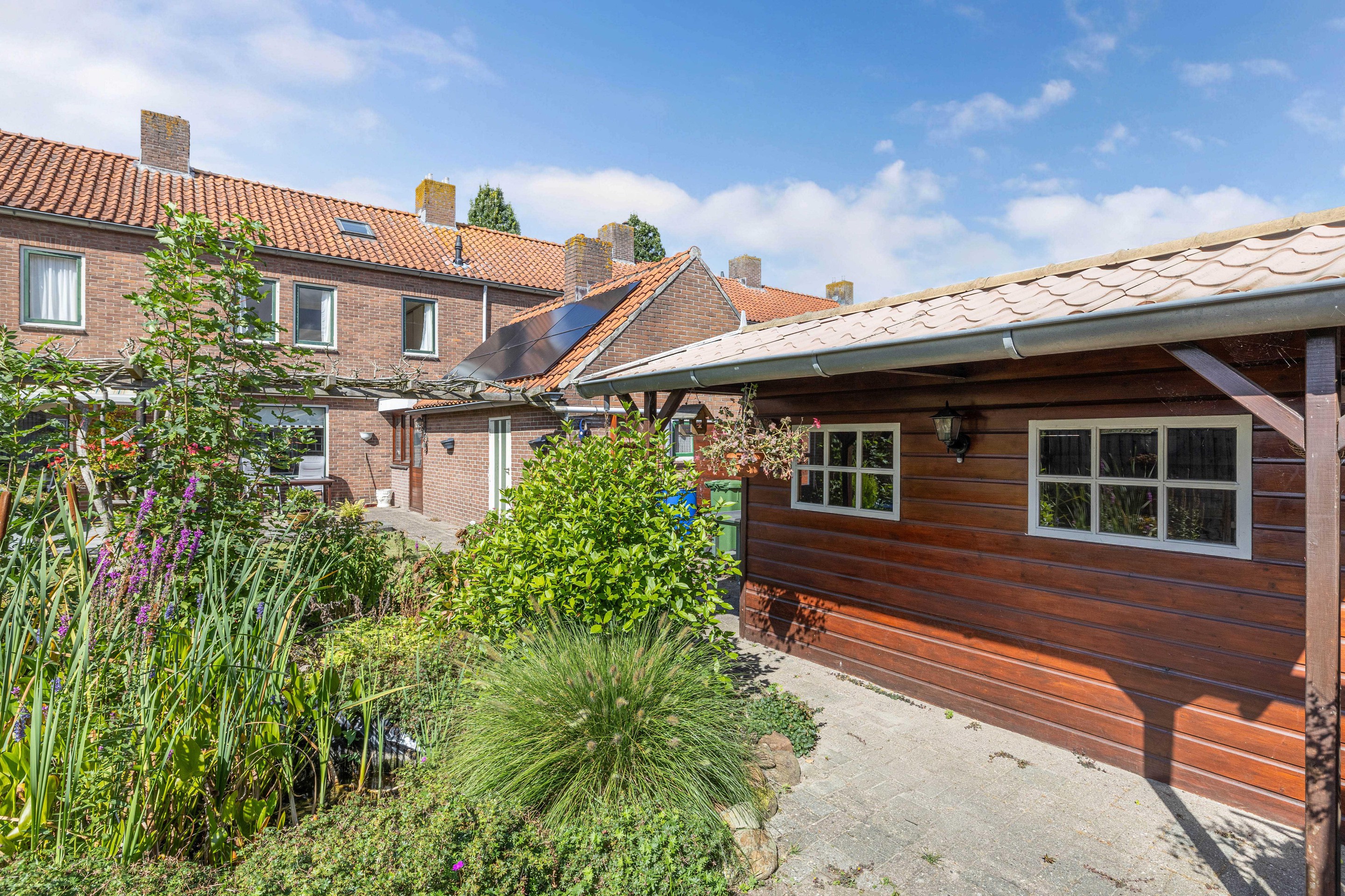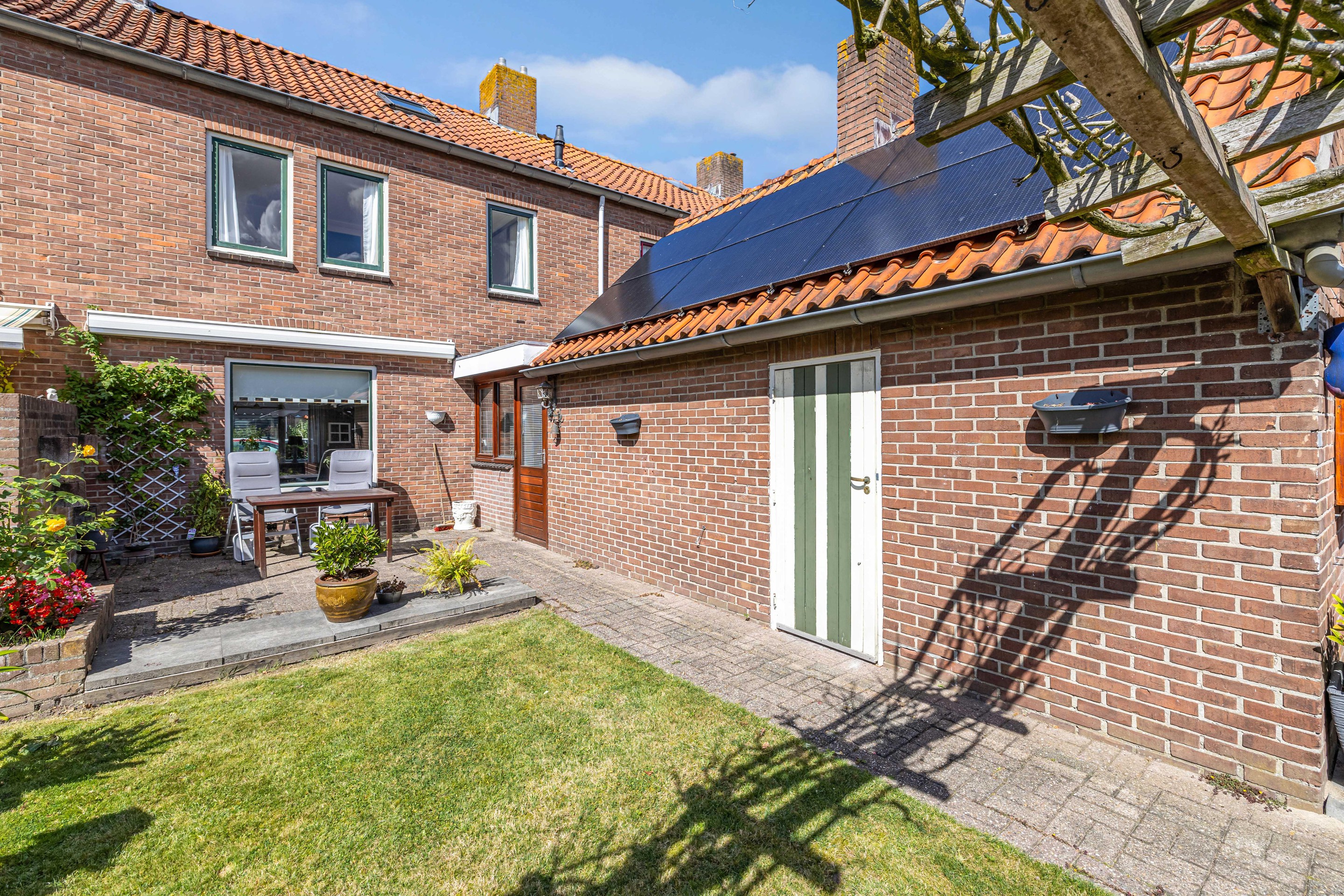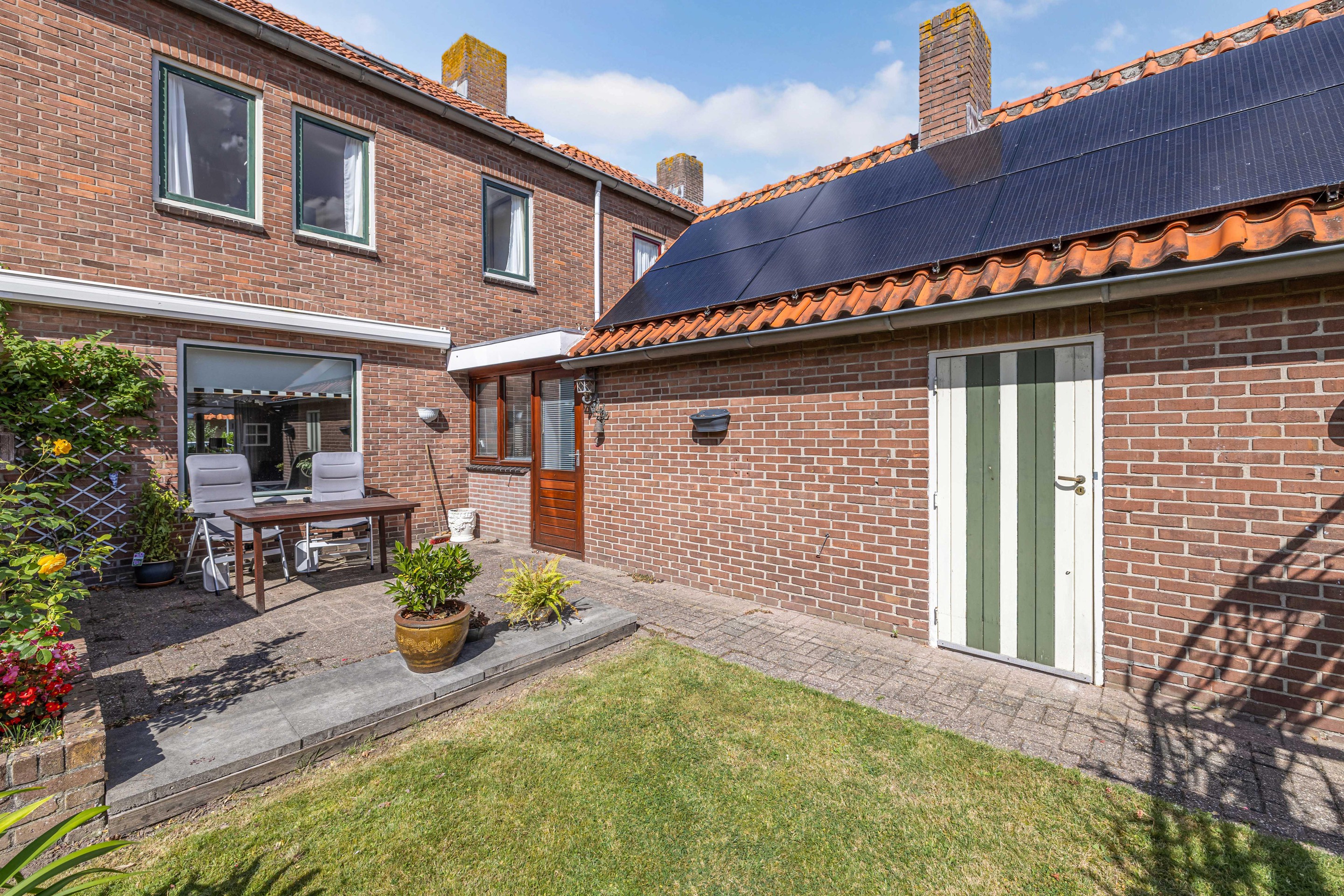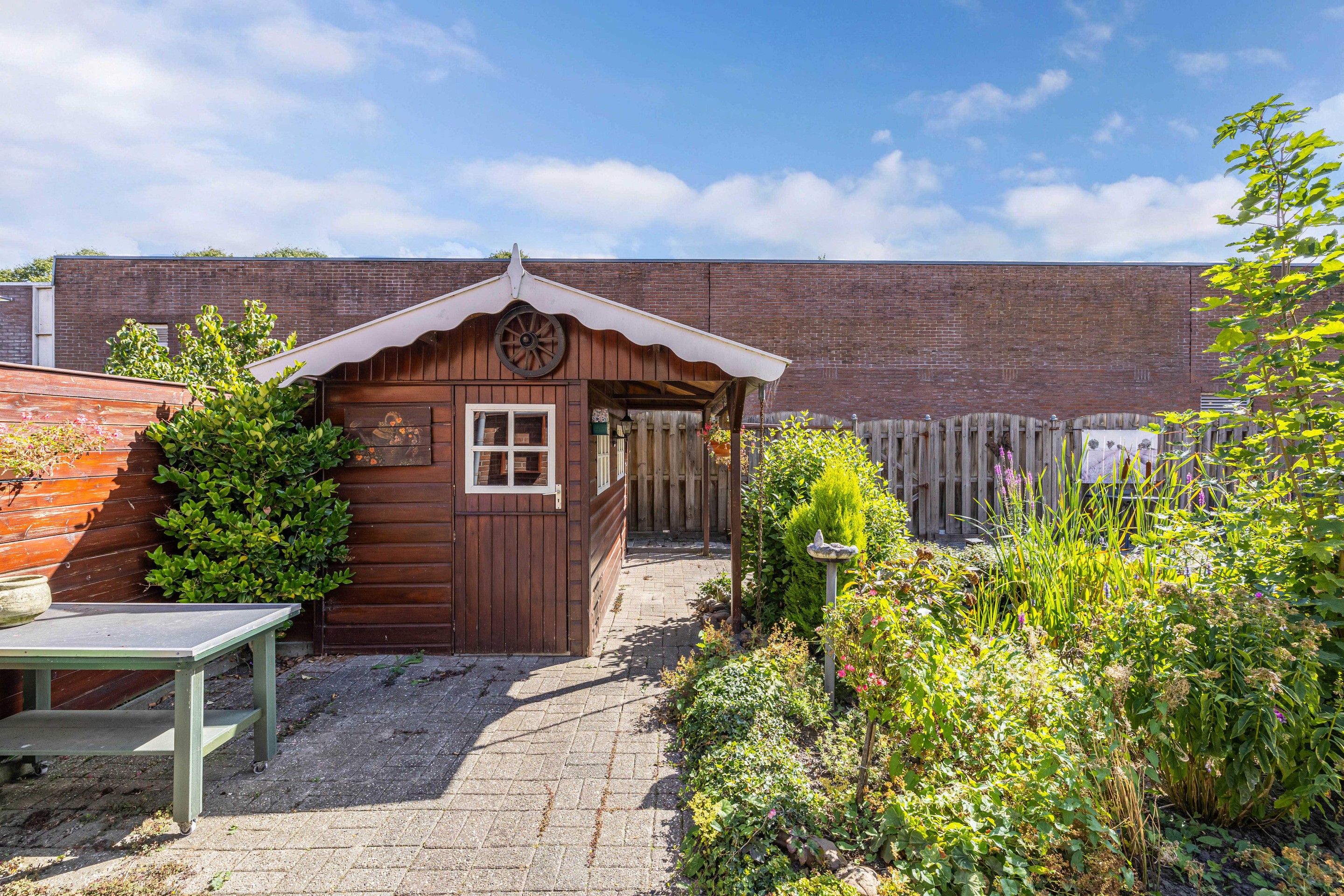 Via de bijkeuken kom je in de tuin terecht. Er zijn geen directe achterburen. De groene open achtertuin bevindt zich aan de oostkant. De tuin is ook te bereiken via de steeg achterom. Achter in de tuin bevindt zich een vrijstaande houten berging met overkapping. Ook is er een aangebouwde stenen berging. Aan de achterzijde van de woning is een elektrisch terrasscherm.
