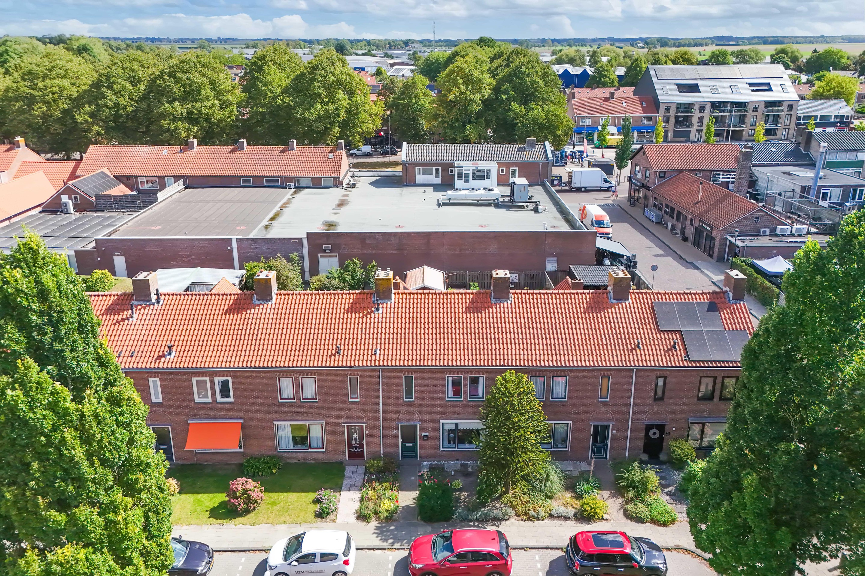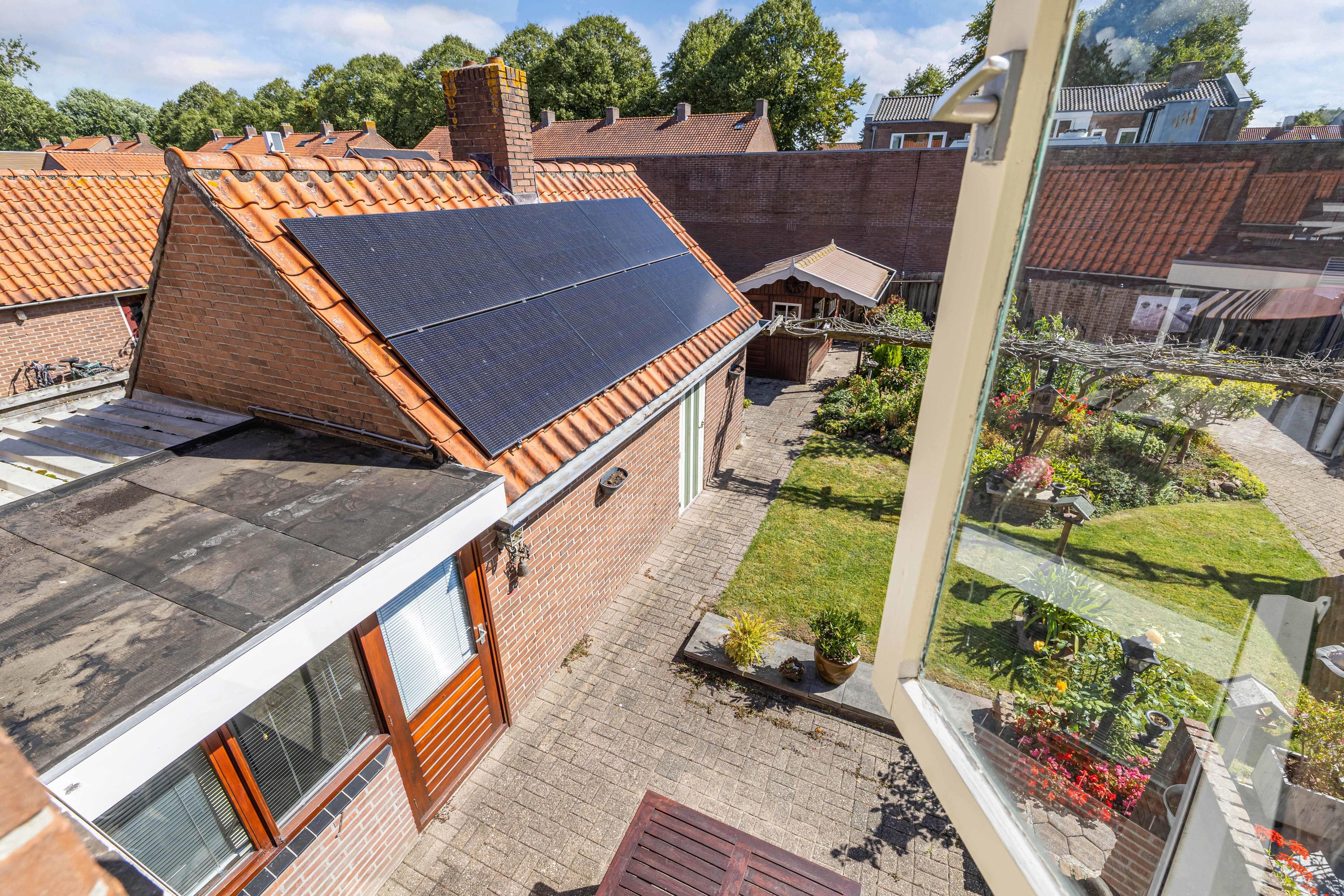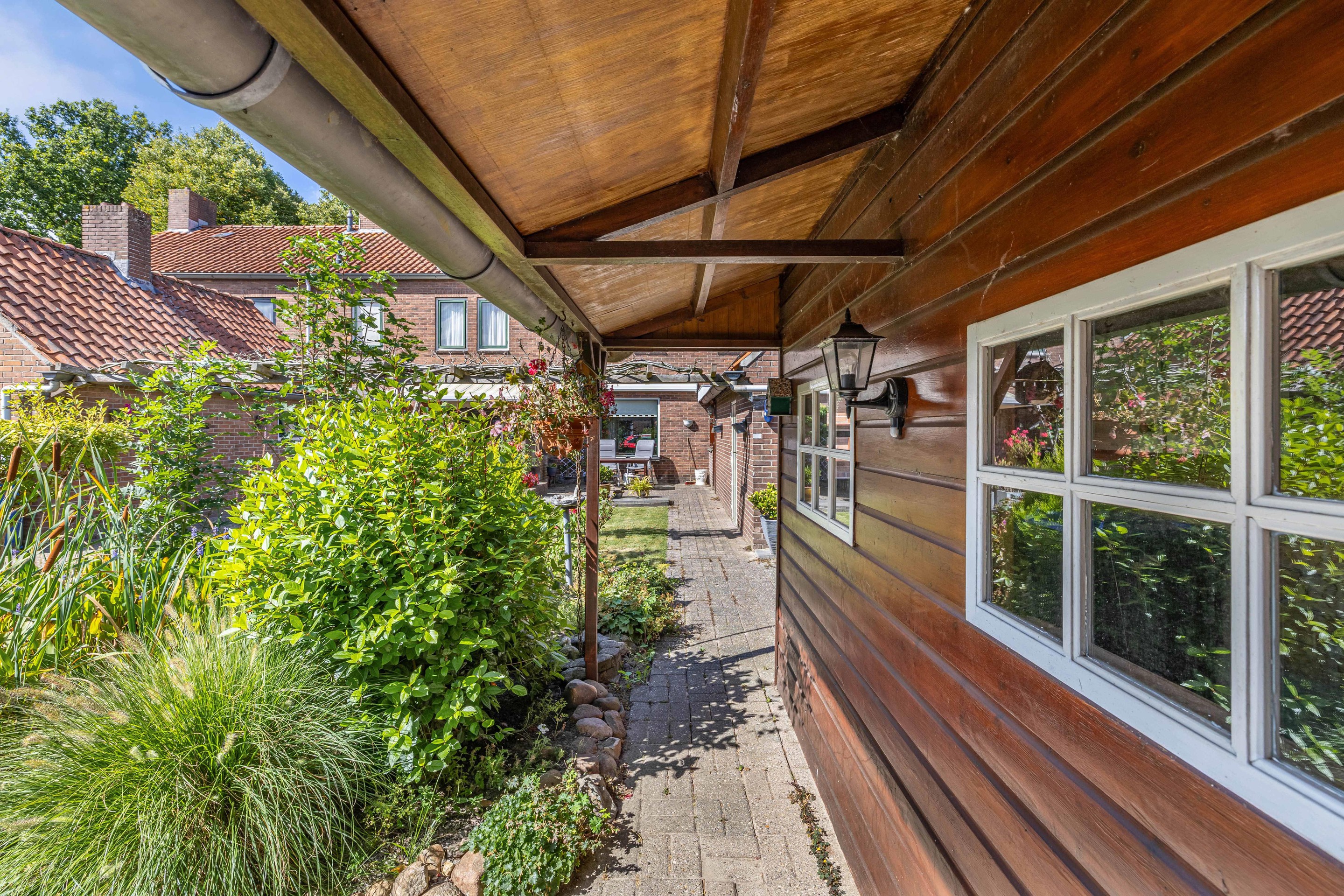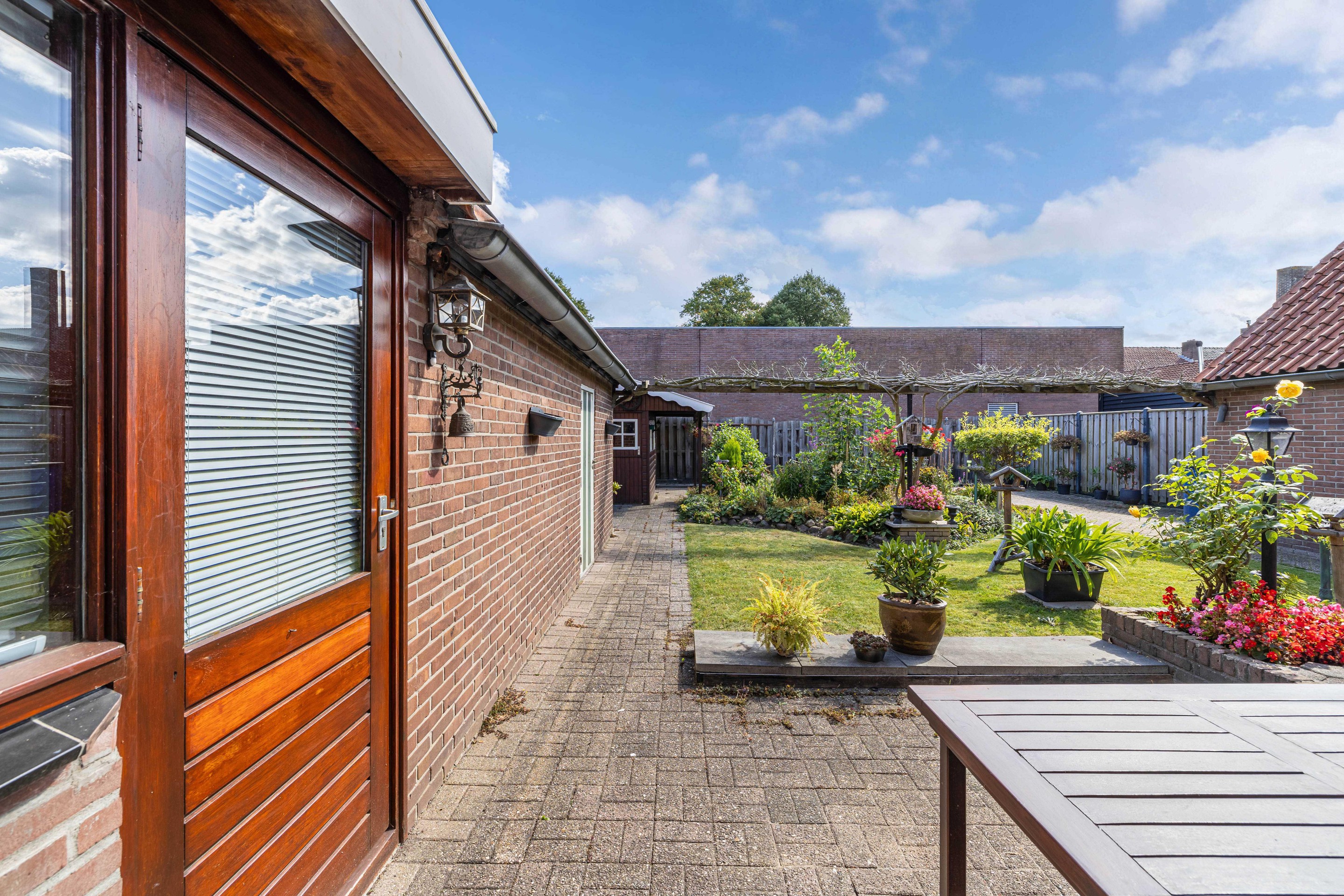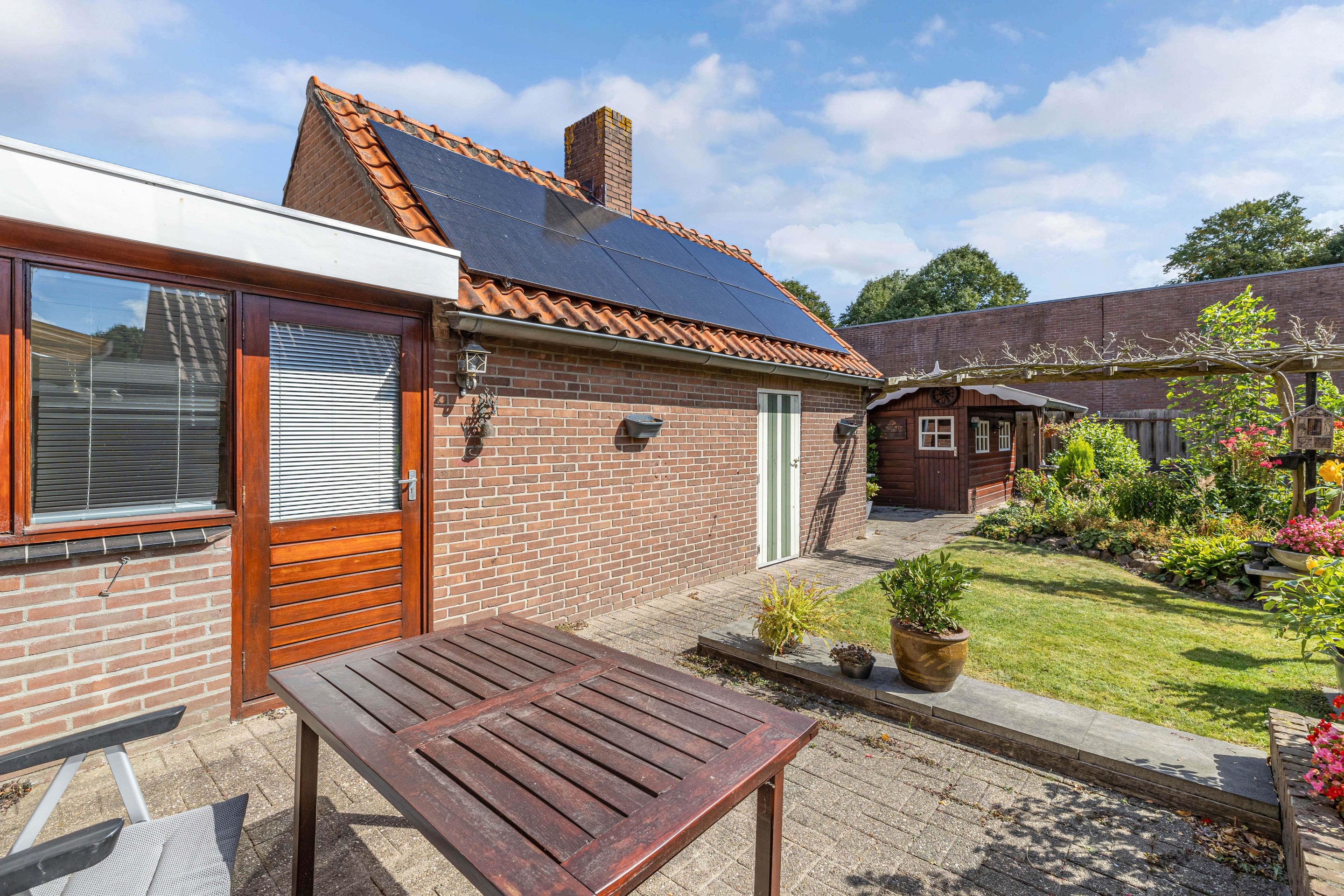 Via de bijkeuken kom je in de tuin terecht. Er zijn geen directe achterburen. De groene open achtertuin bevindt zich aan de oostkant. De tuin is ook te bereiken via de steeg achterom. Achter in de tuin bevindt zich een vrijstaande houten berging met overkapping. Ook is er een aangebouwde stenen berging. Aan de achterzijde van de woning is een elektrisch terrasscherm.