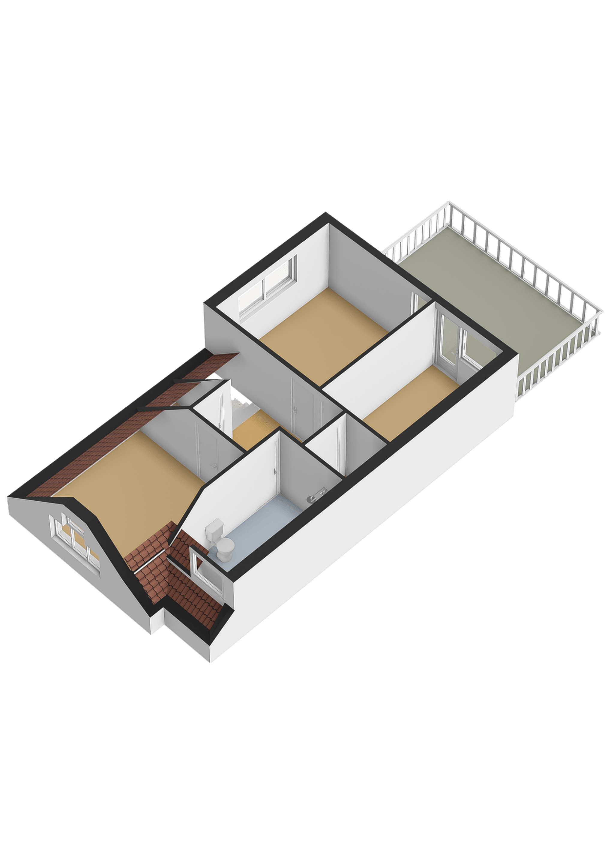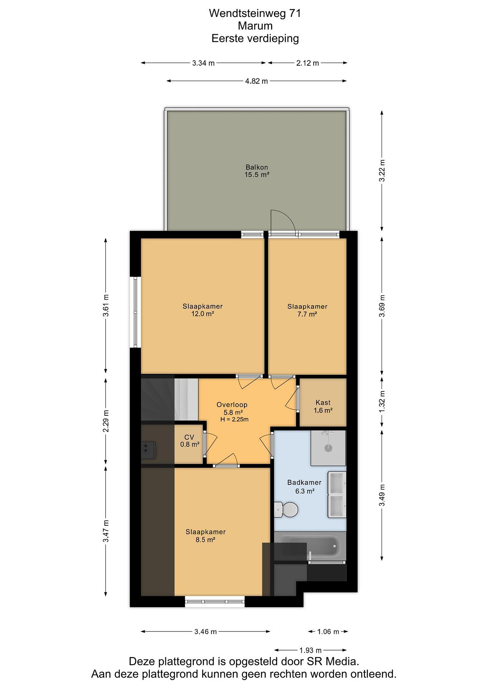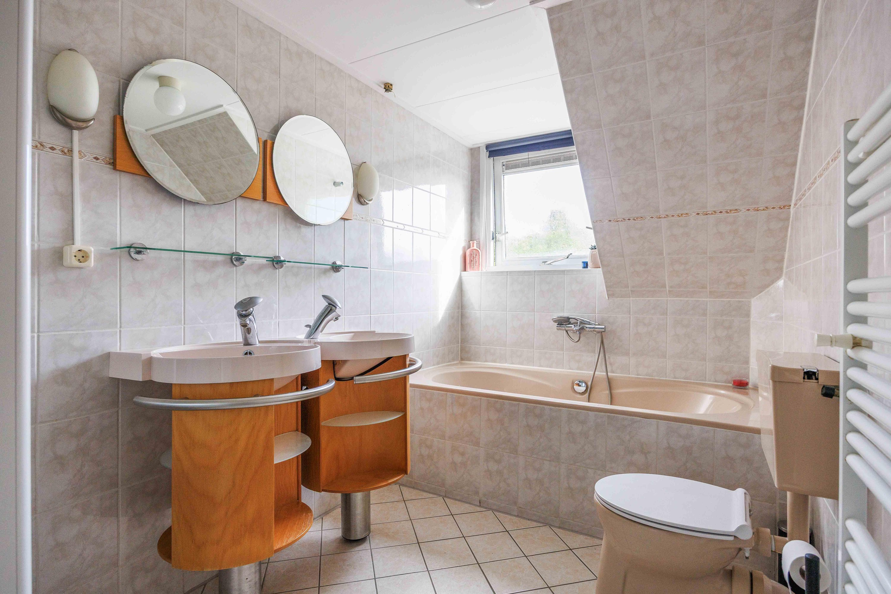 In de woonkamer is de trapopgang naar de eerste verdieping te vinden middels een kleine hal. Op de bovenverdieping bevinden zich drie slaapkamers, de badkamer en een kast voor extra opslagruimte. De badkamer is voorzien van een dubbele wastafel, ligbad, douche en toilet. Een van de slaapkamers heeft een eigen toegang tot een ruim balkon/dakterras, waar u kunt genieten van de zon of een rustige avond.