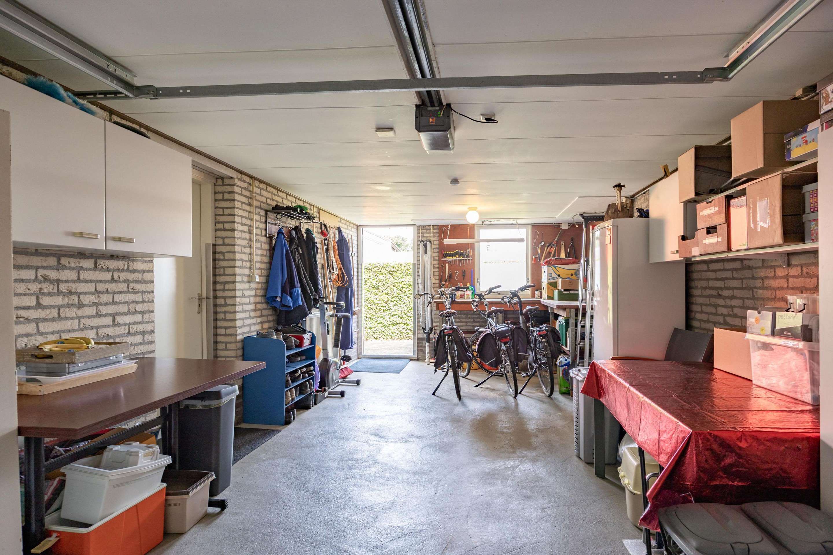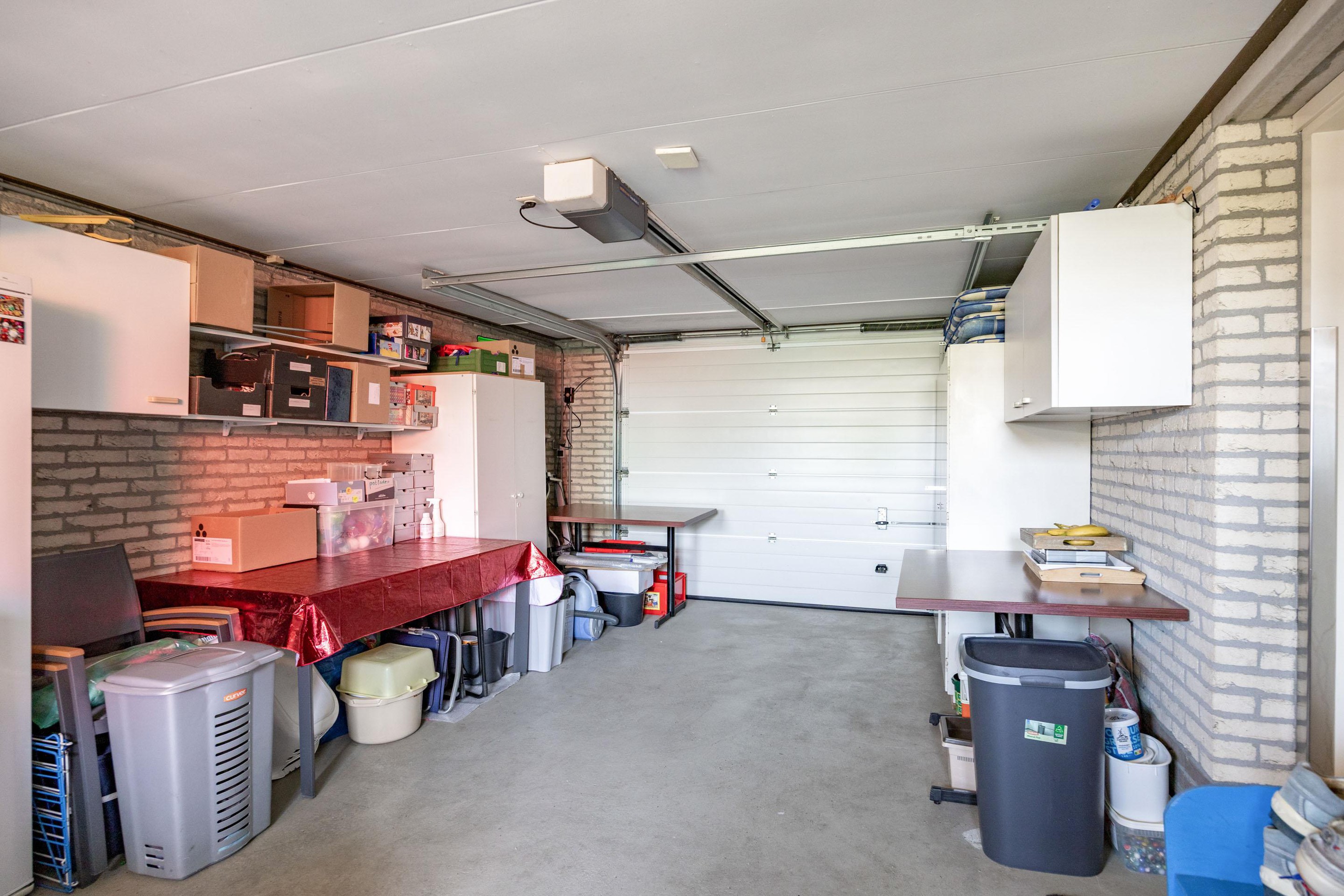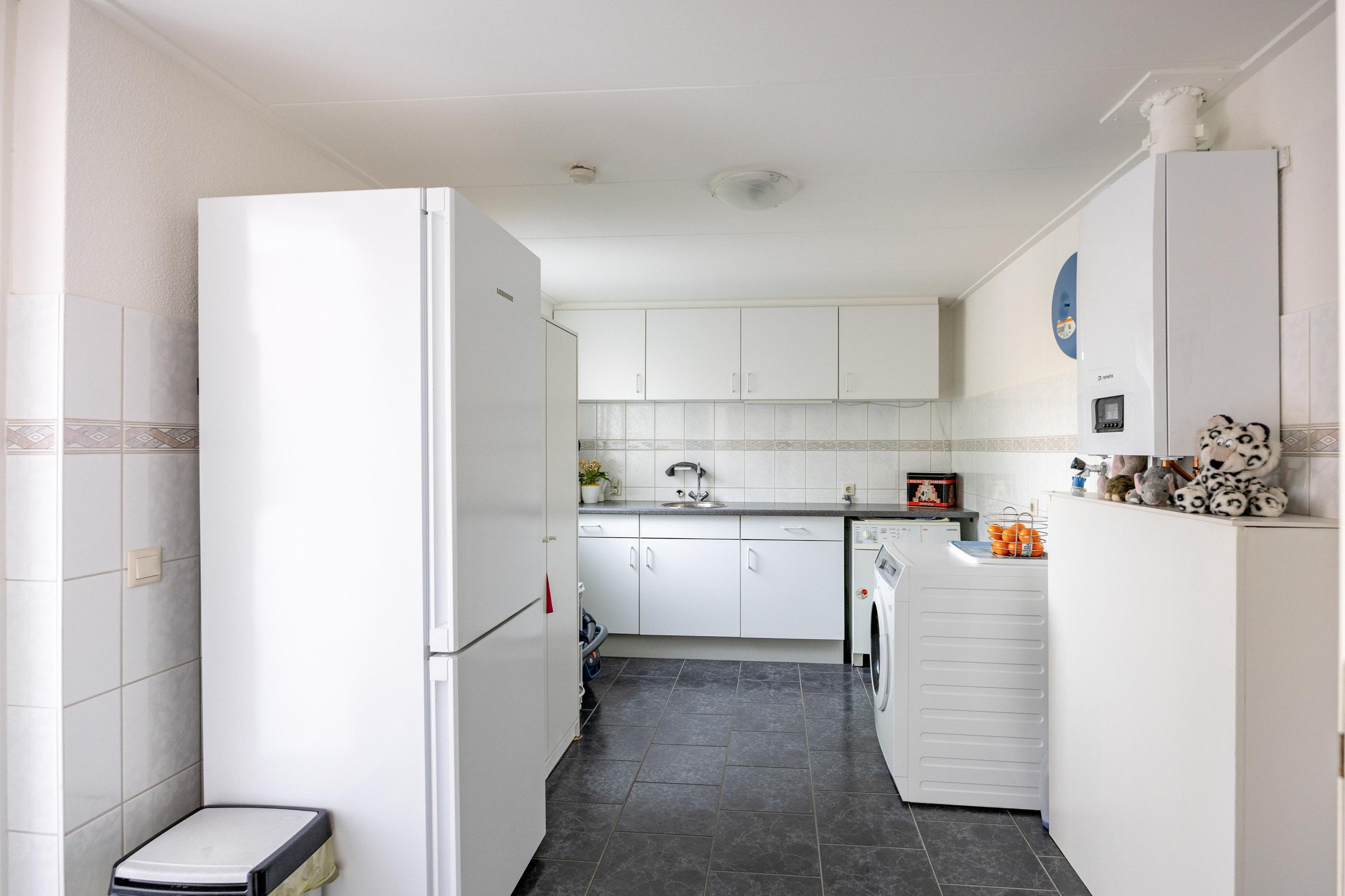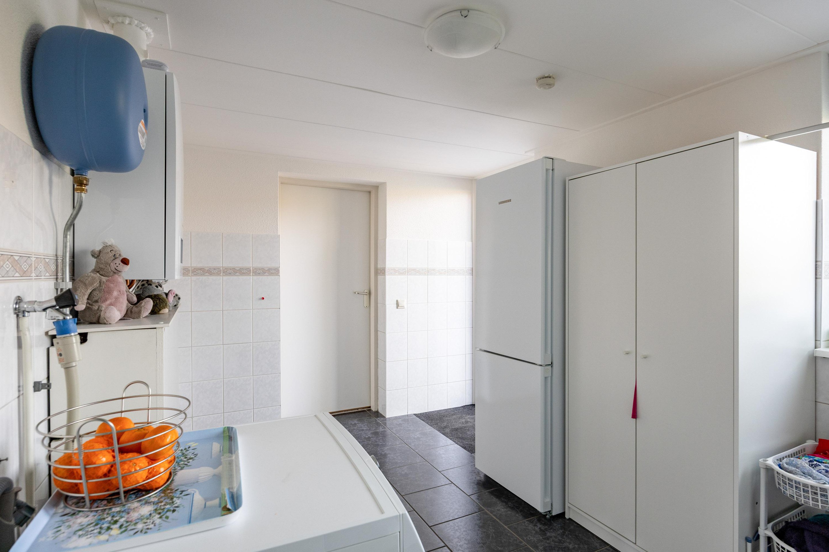 Aansluitend vindt u de ruime bijkeuken, met extra aanrecht, de cv-installatie en aansluitingen voor wasmachine en droger. Vanuit de bijkeuken is er toegang tot de grote aangebouwde garage, die is uitgerust met een elektrische deur. Zowel vanuit de garage als vanuit de bijkeuken bereikt u de besloten achtertuin.