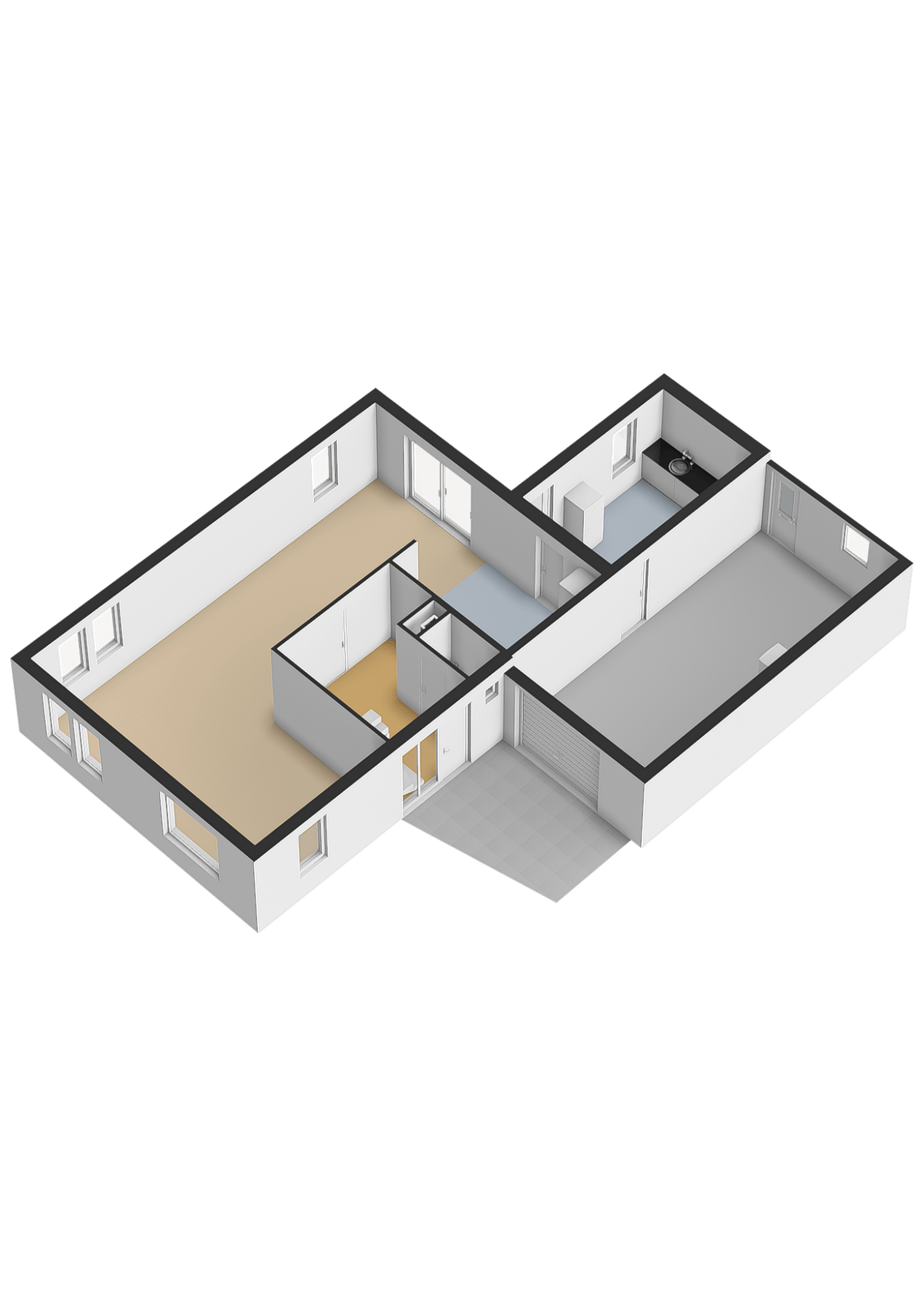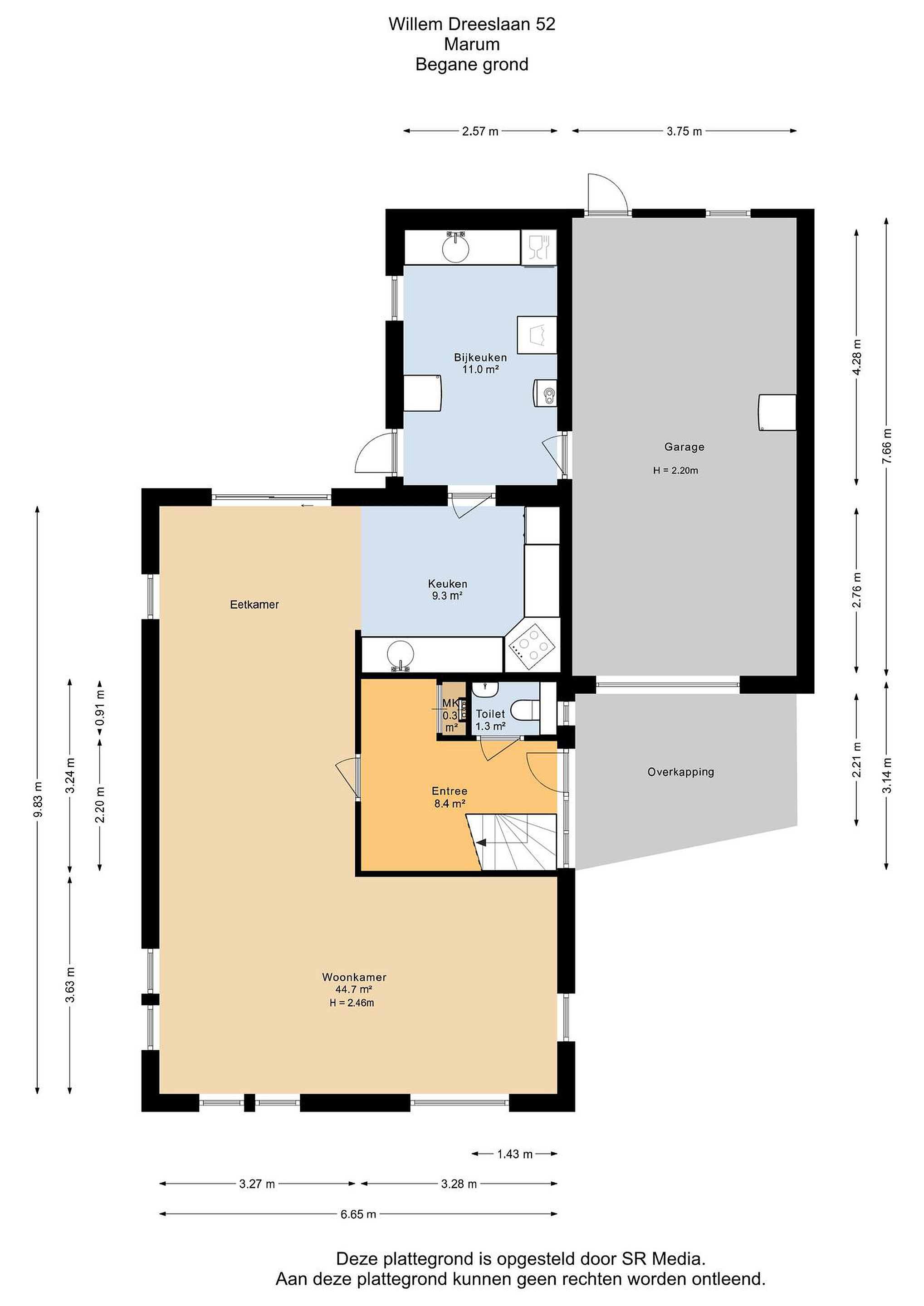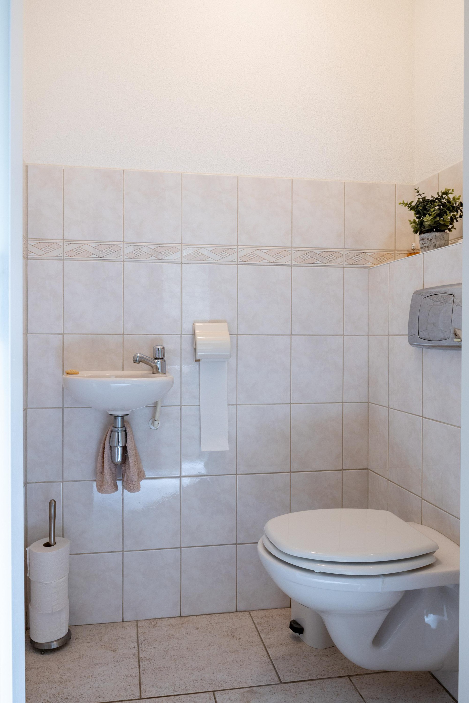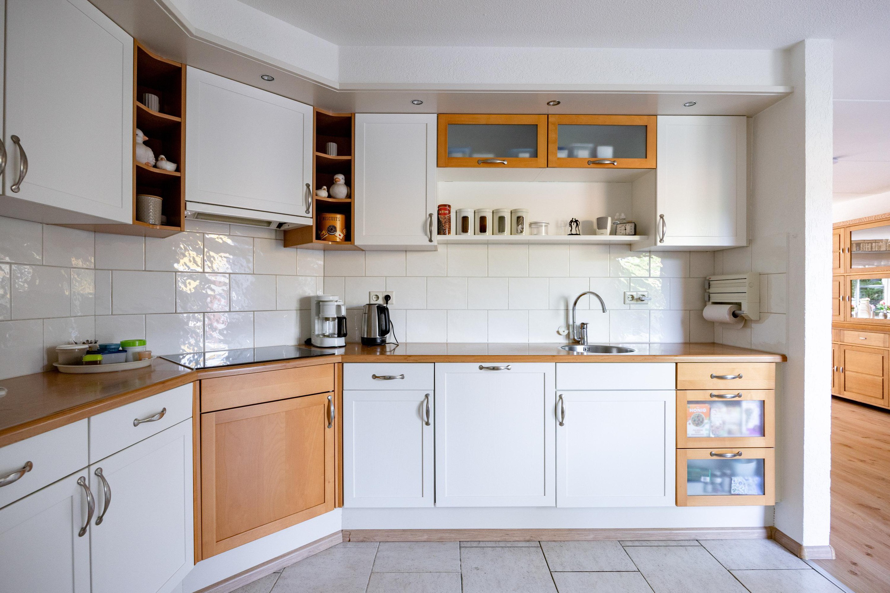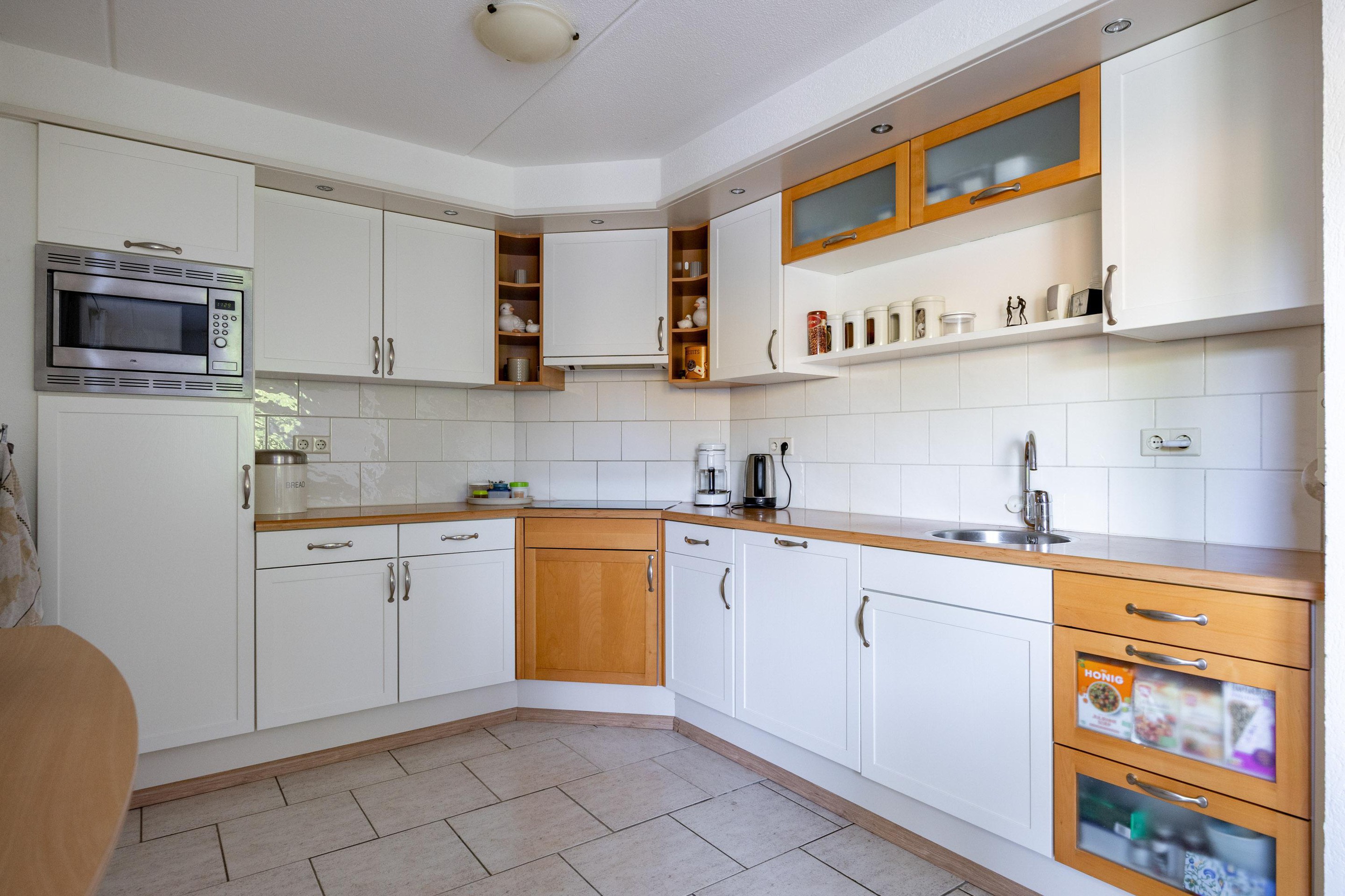 Aansluitend vindt u de ruime bijkeuken, met extra aanrecht, de cv-installatie en aansluitingen voor wasmachine en droger. Vanuit de bijkeuken is er toegang tot de grote aangebouwde garage, die is uitgerust met een elektrische deur. Zowel vanuit de garage als vanuit de bijkeuken bereikt u de besloten achtertuin.