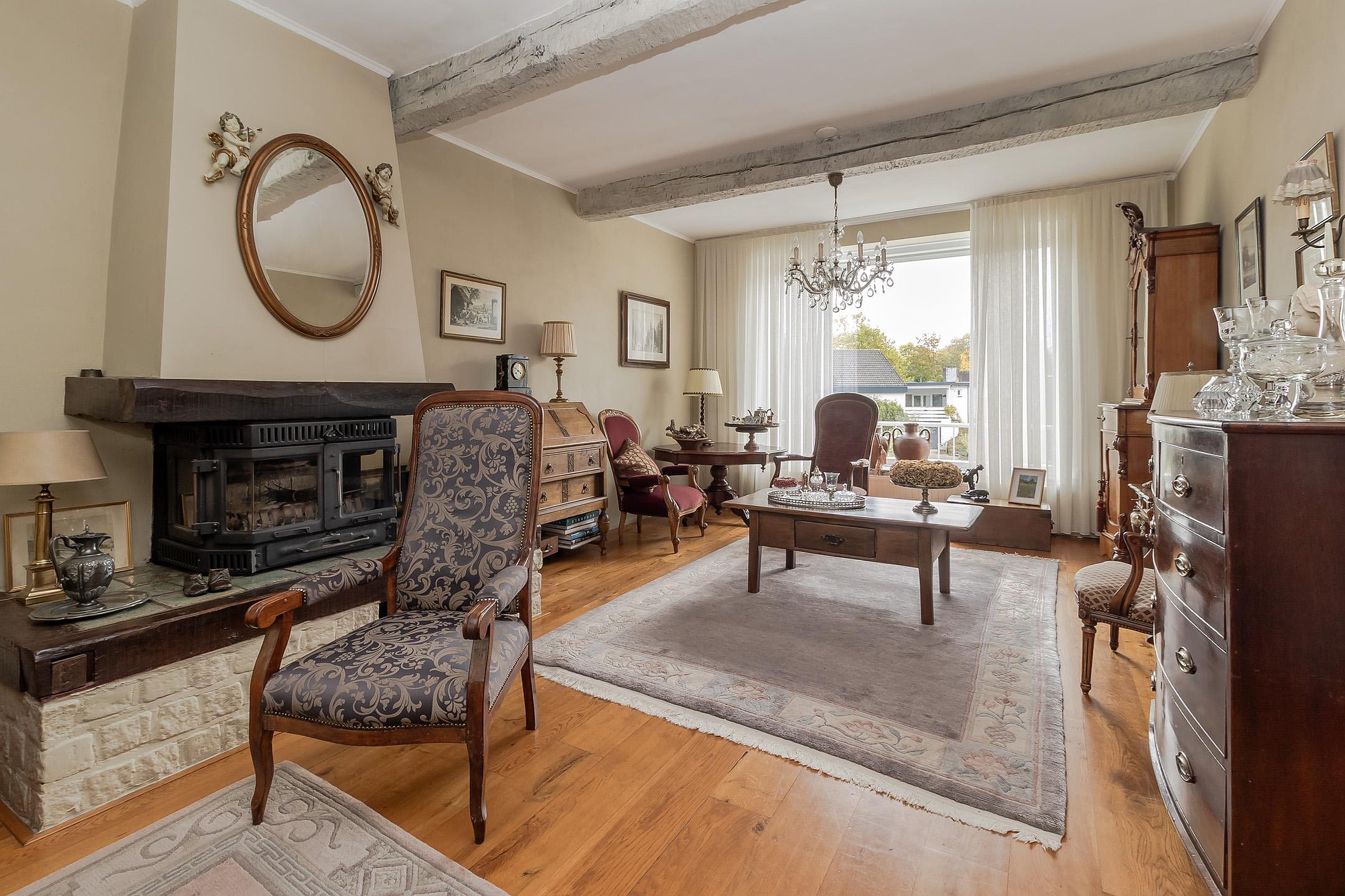 - Doorzon woonkamer (circa 28 m2) voorzien van een houten vloer en een schouw met haard. Een grote raampartij aan de voorzijde zorgt voor veel lichtinval. Doordat de woning hoger gelegen is, geniet je hier van privacy en een fraai zicht op het straatbeeld.