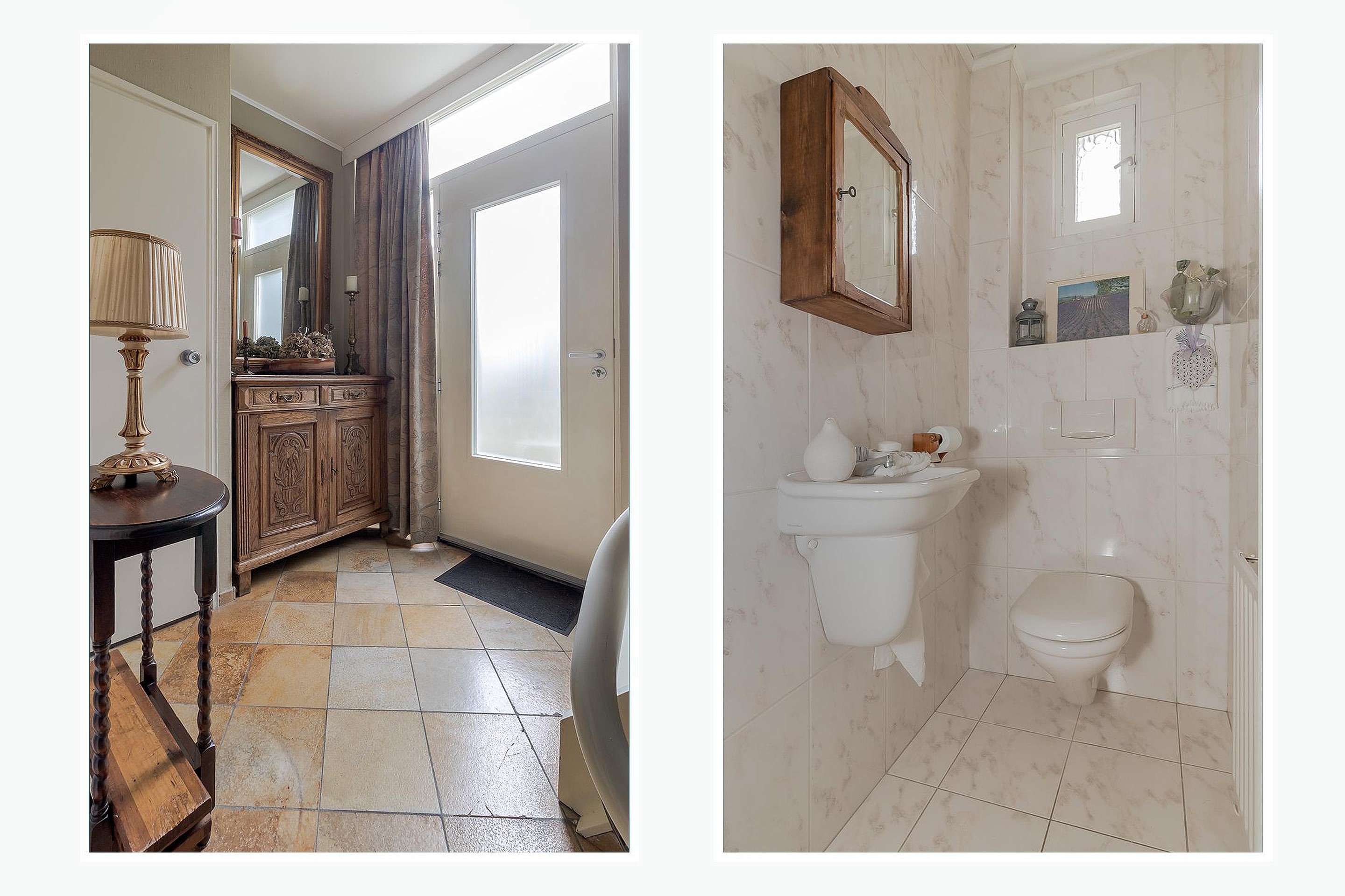 - Entree met trapopgang naar de eerste verdieping, toegang tot de provisiekelder, zekeringenkast en geheel betegelde toiletruimte met wandcloset en fonteintje.