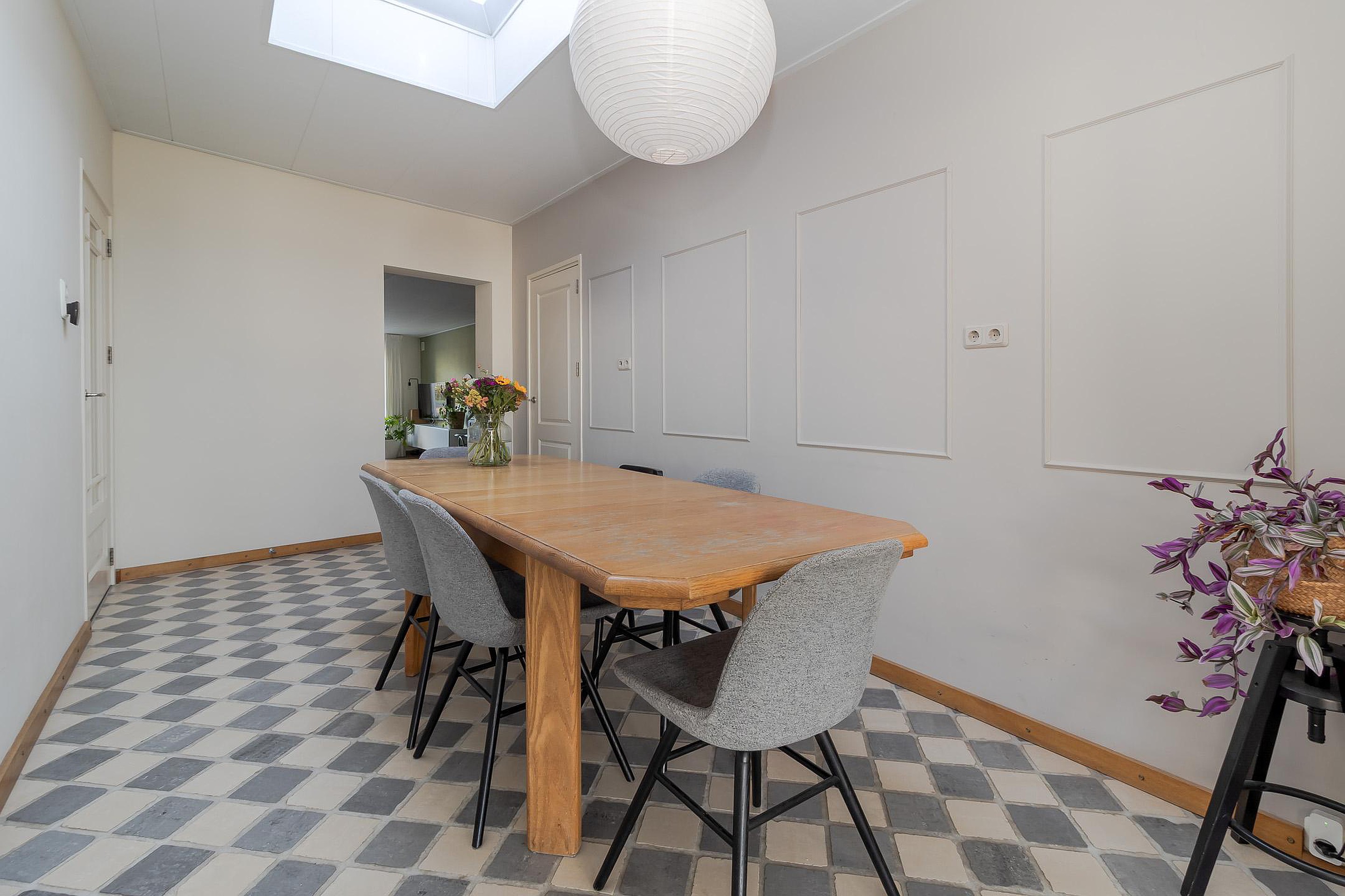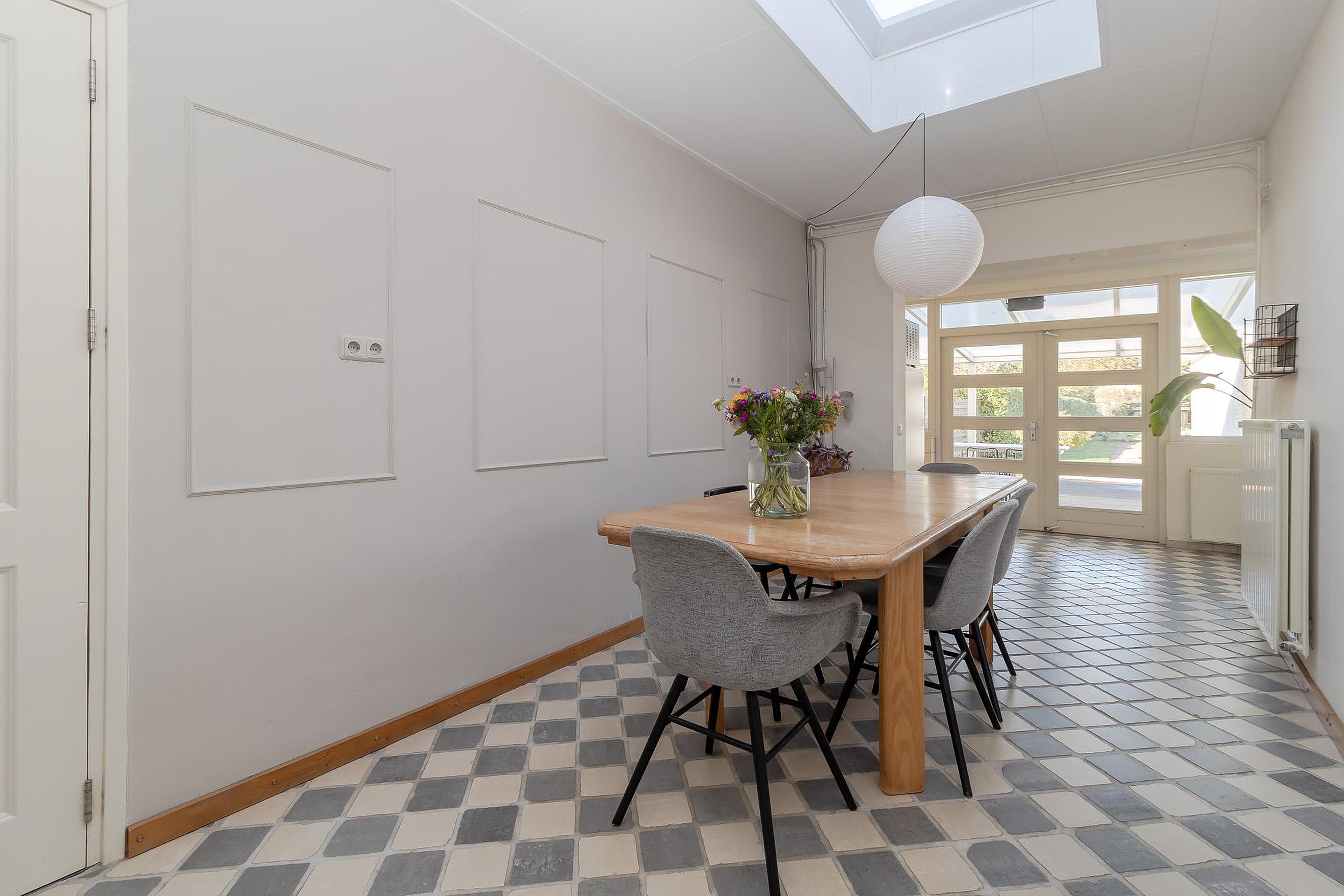 - Vanuit de entree loop je de eetkamer in, het middelpunt van de woning. Je oog valt via de openslaande tuindeuren direct op de diepe tuin. Het eetgedeelte (circa 13 m2) is voorzien van een plavuizen vloer en krijgt extra daglichtinval via een lichtkoepel.