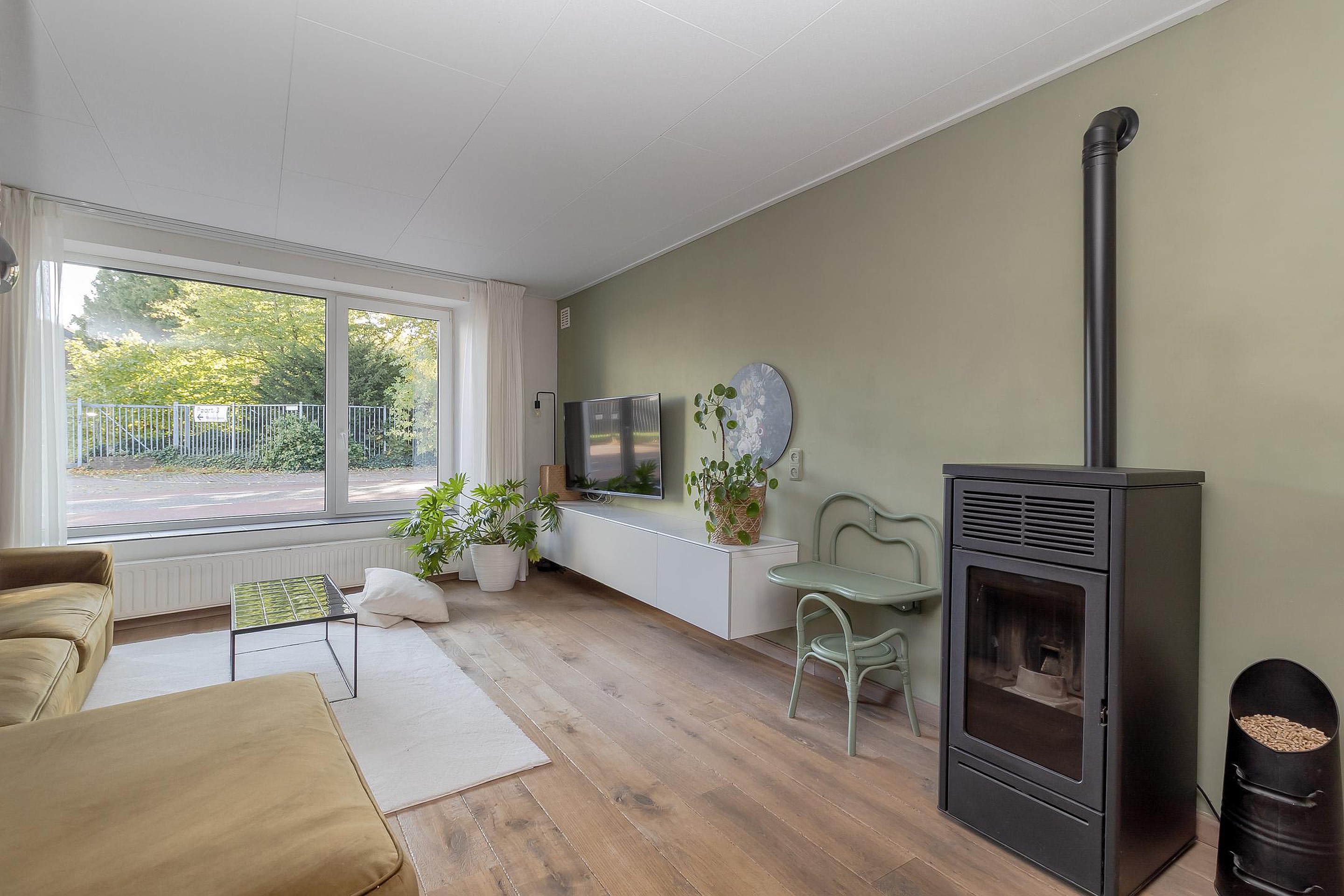 - De sfeervolle woonkamer (circa 24 m2) is gelegen aan de voorzijde van de woning en voorzien van een houten vloer. Een pelletkachel zorgt voor gezelligheid en warmte op koude dagen.