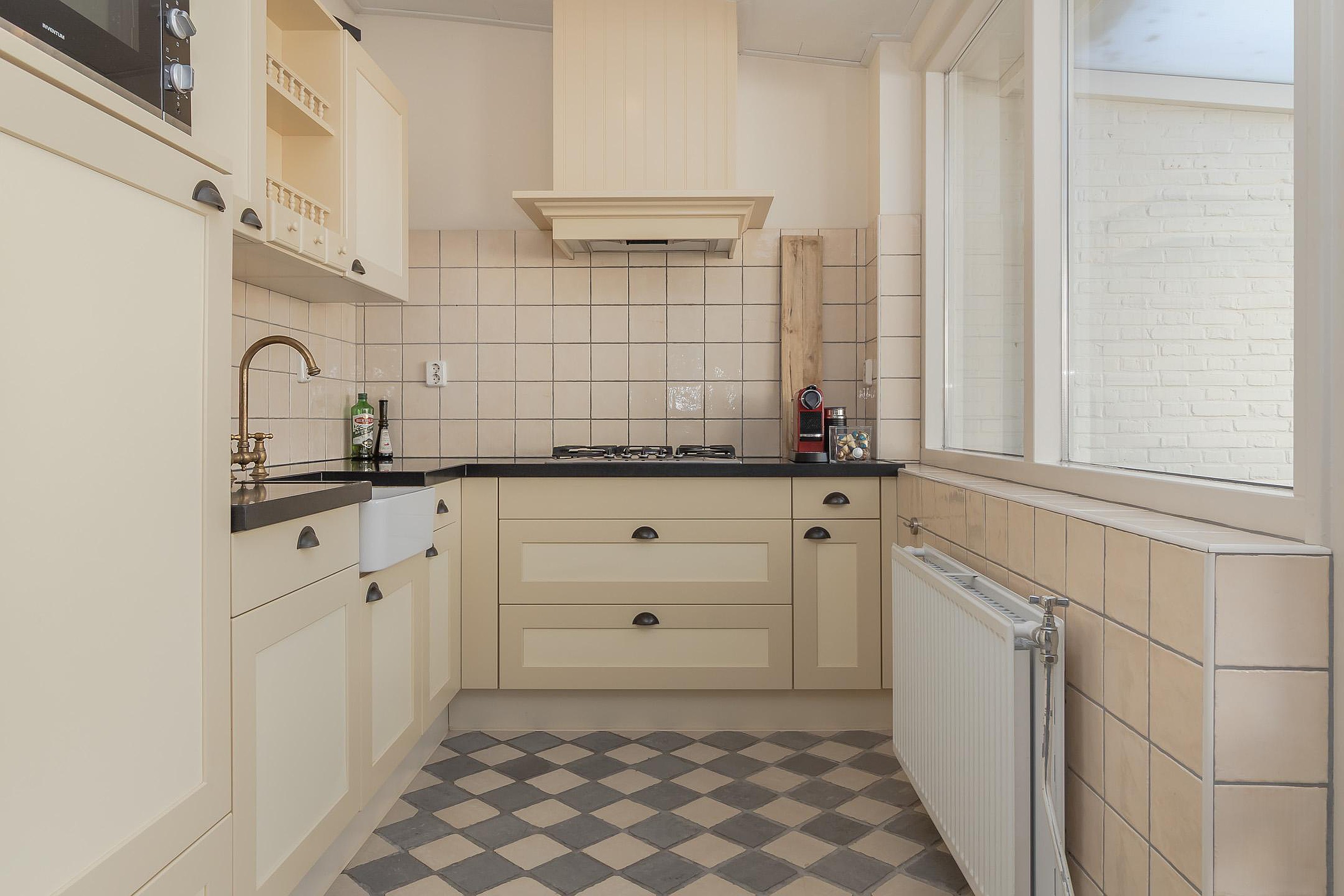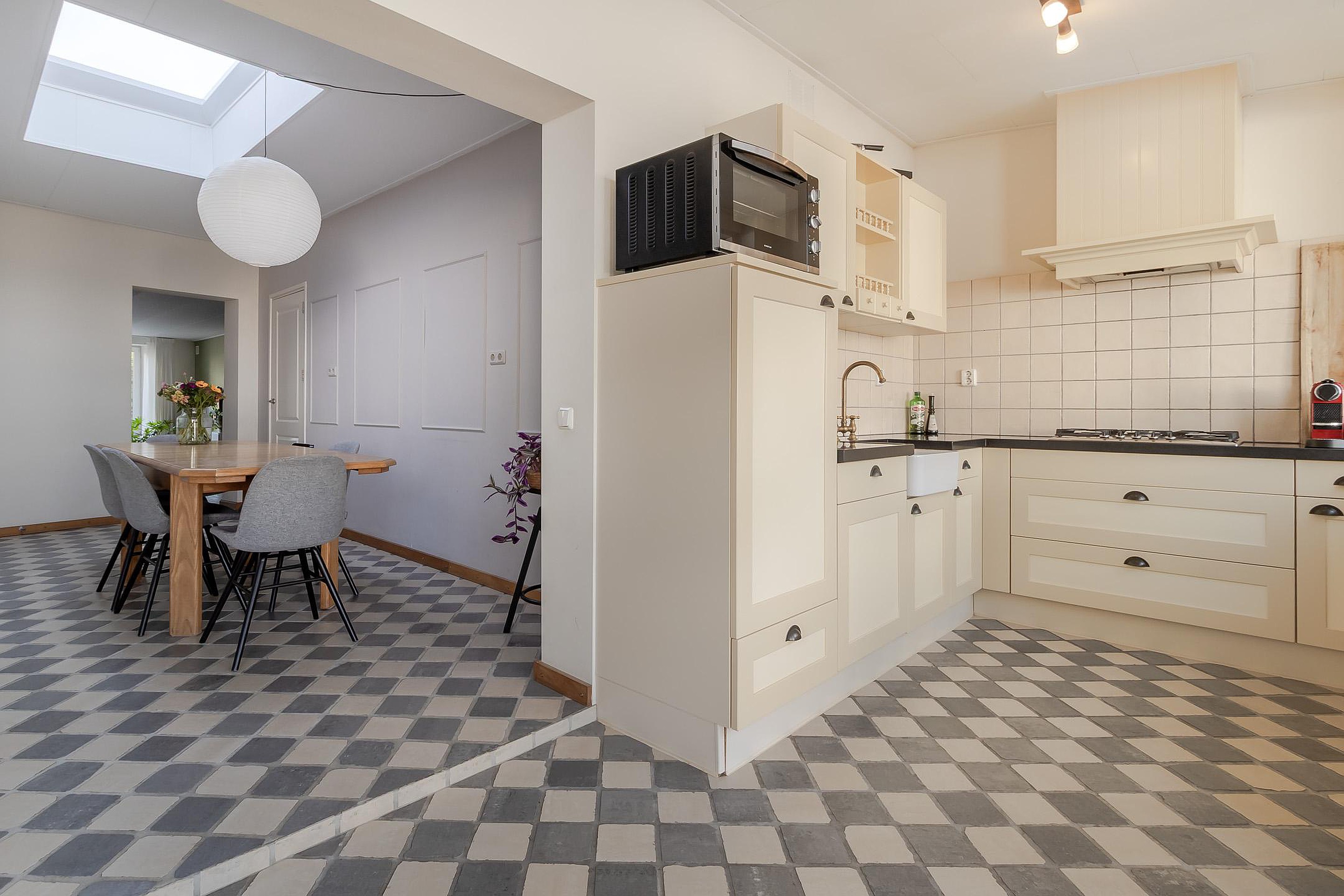 - De open keuken (circa 12 m2) is voorzien van een keukeninstallatie met landelijke uitstraling en de volgende apparatuur: 5-pits gaskookplaat met wokbrander, schouw met afzuigkap, vaatwasser en koelkast. Grote raampartijen en openslaande tuindeuren zorgen voor veel lichtinval en optimaal tuincontact.