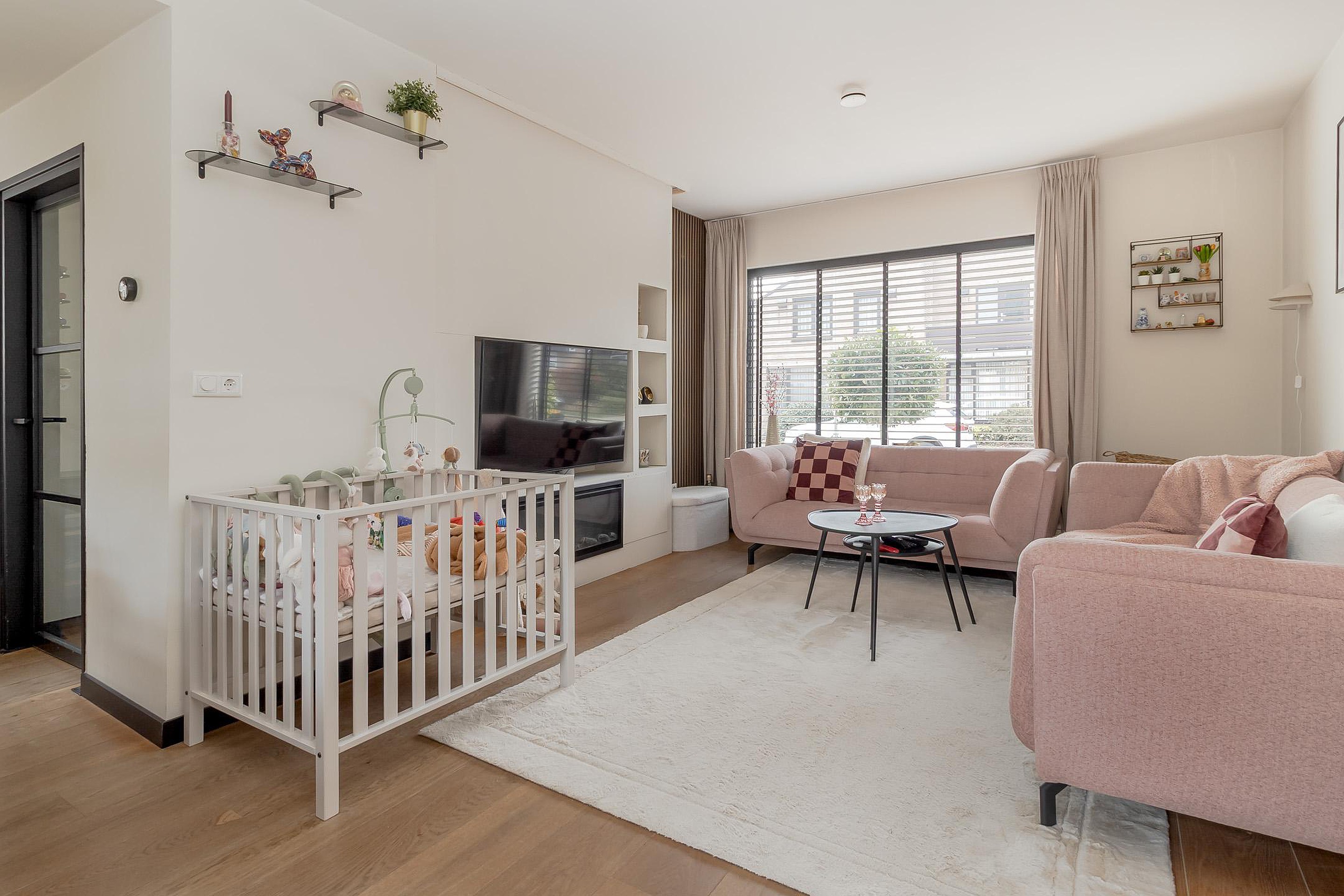 - L-vormige woonkamer (circa 33 m2) voorzien van een eikenhouten plankenvloer en fraaie cinewall. Een grote raampartij aan de voorzijde, voorzien van zonwering, zorgt voor veel lichtinval. Aan de achterzijde zorgen openslaande tuindeuren voor optimaal tuincontact.