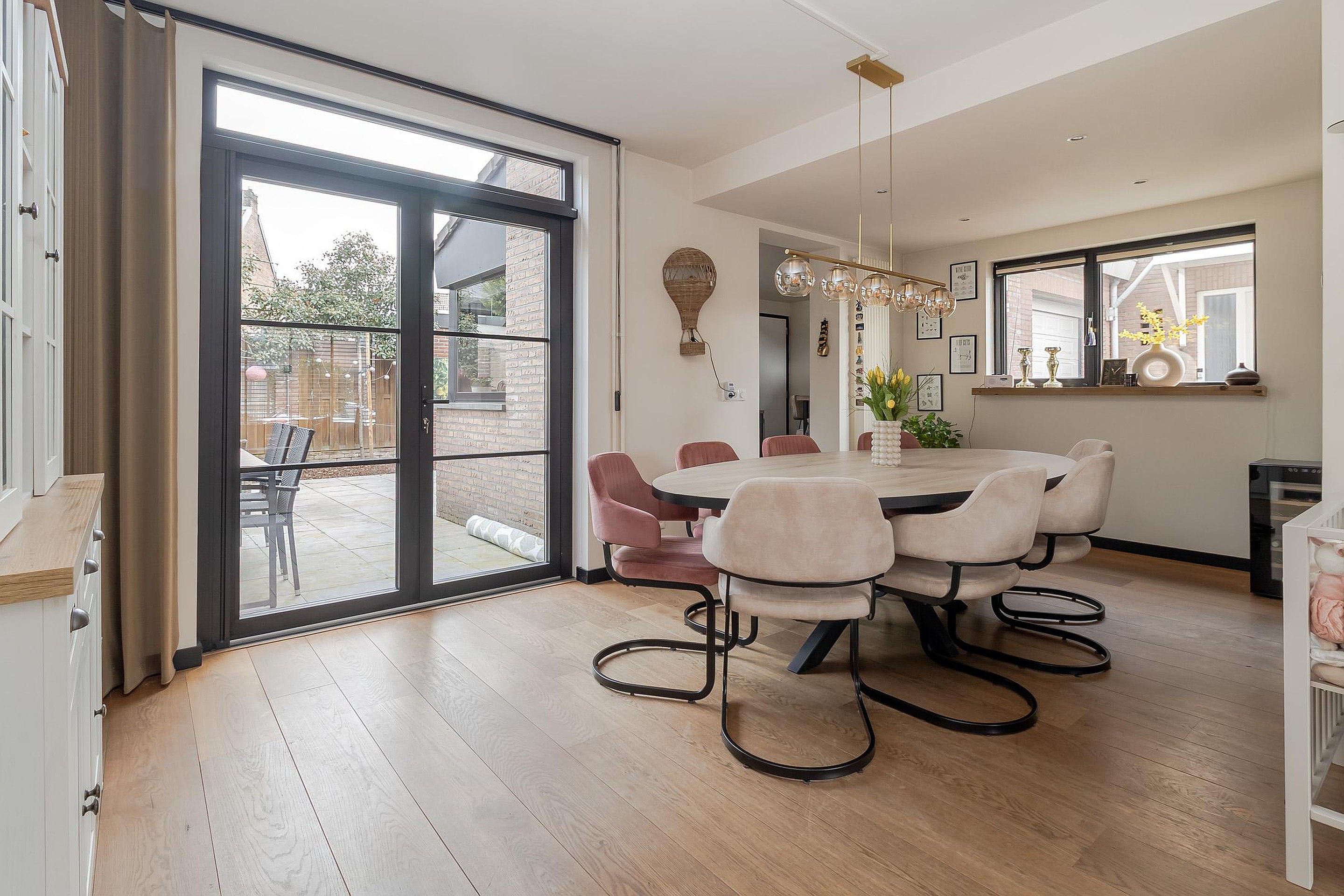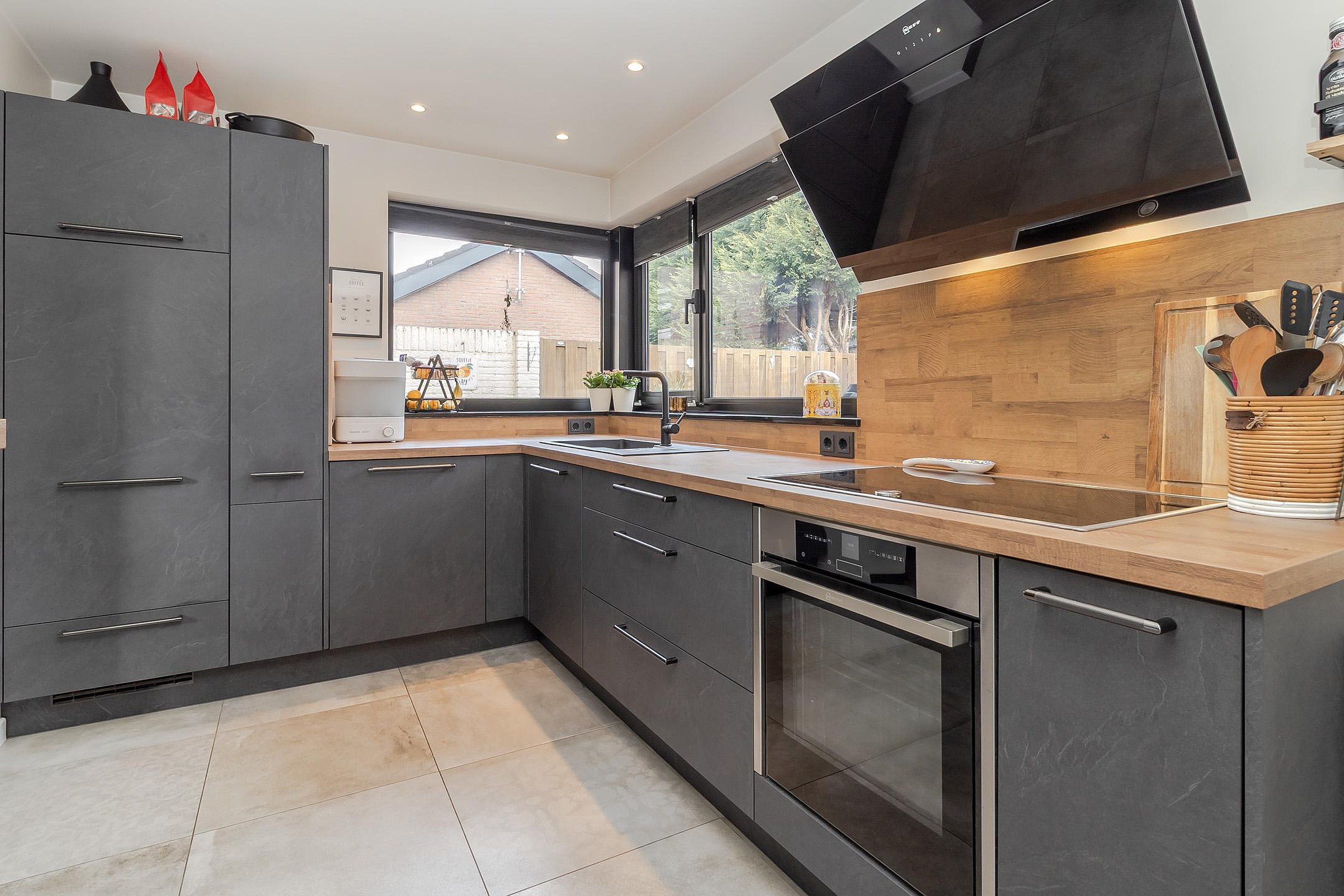 - Semi-open keuken (circa 10,5 m2) voorzien van een tegelvloer en een keukeninstallatie in hoekopstelling m.o.m. een inductiekookplaat, afzuigkap, oven, vaatwasser, koelkast en handige apothekerskast. Een grote raampartij zorgt voor veel lichtinval en tuincontact.
