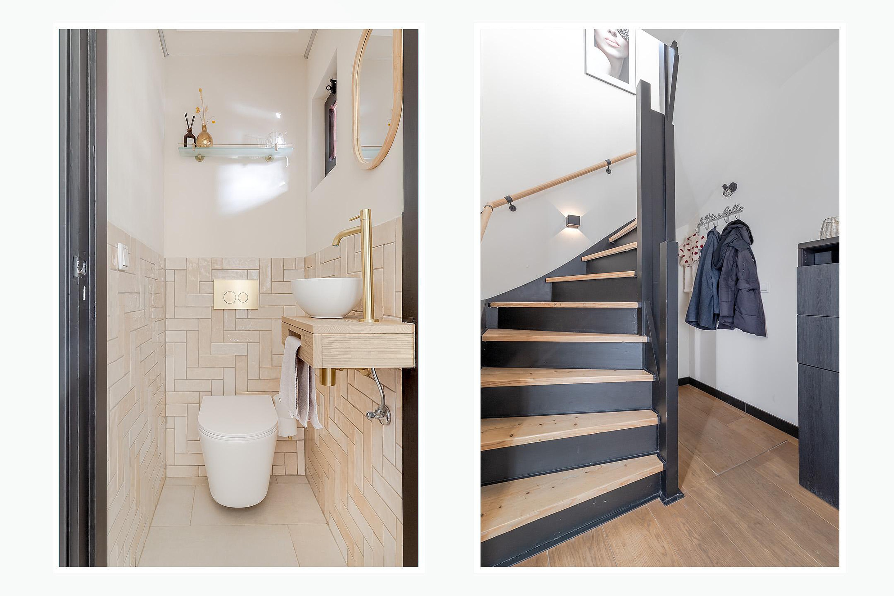 - Moderne deels betegelde toiletruimte met wandcloset en fonteintje. Deze toiletruimte is in 2024 geheel vernieuwd.