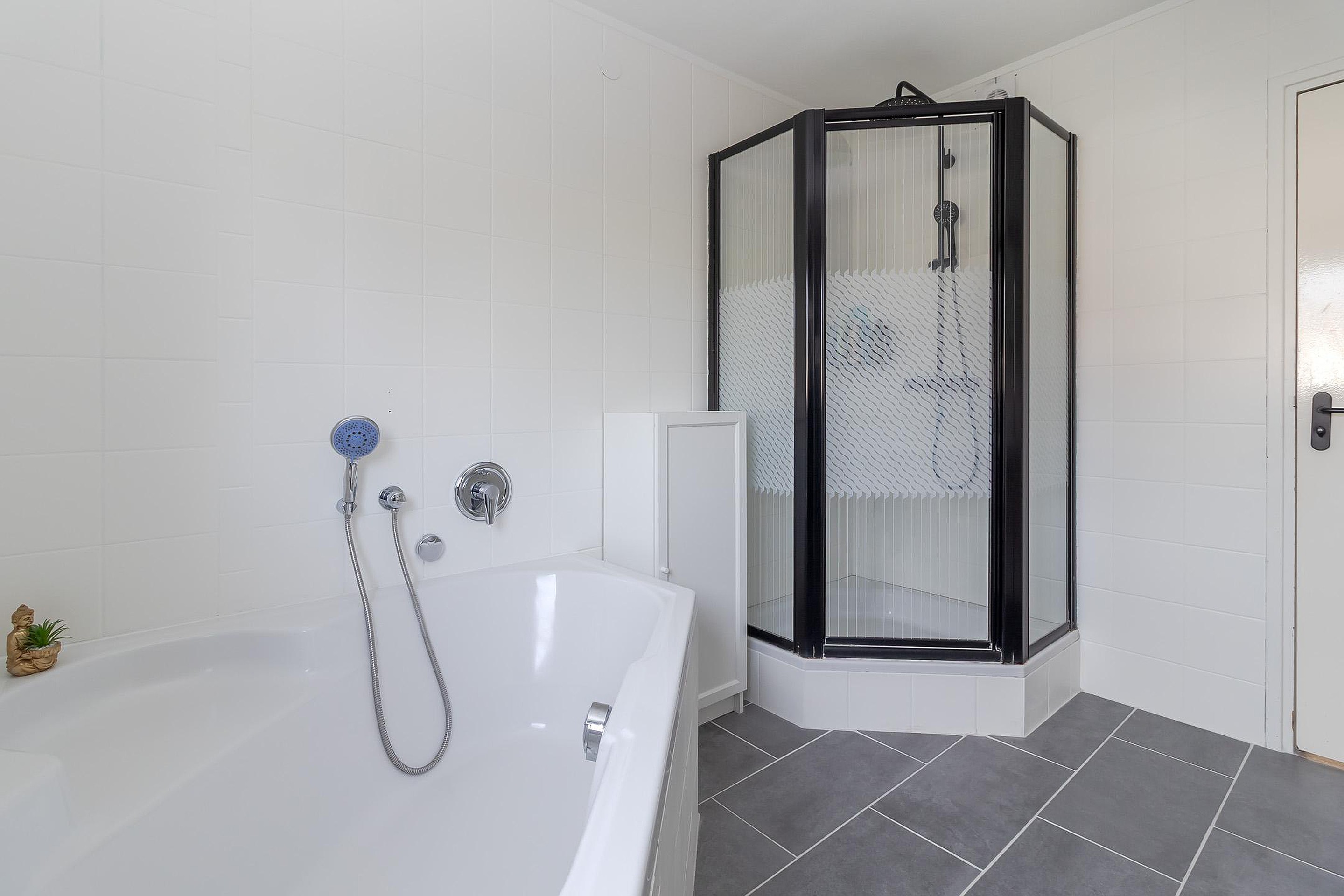- Geheel betegelde badkamer (circa 7 m2) met hoekbad, douchecabine, wastafel en design radiator.