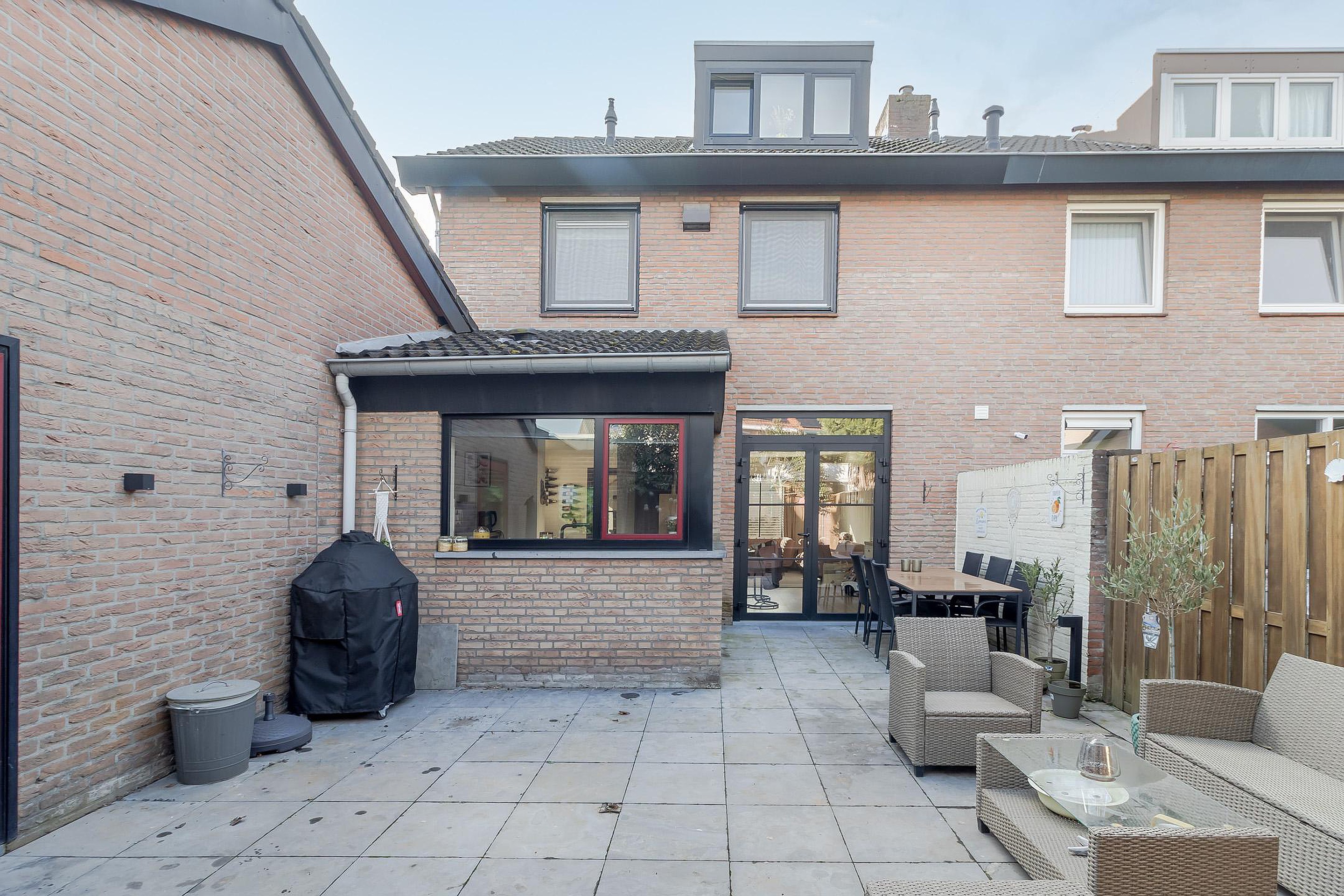 - De achtertuin is onderhoudsvriendelijk aangelegd en nagenoeg geheel betegeld. Leibomen zorgen voor wat groen en privacy. De tuin heeft een achterom via de berging.