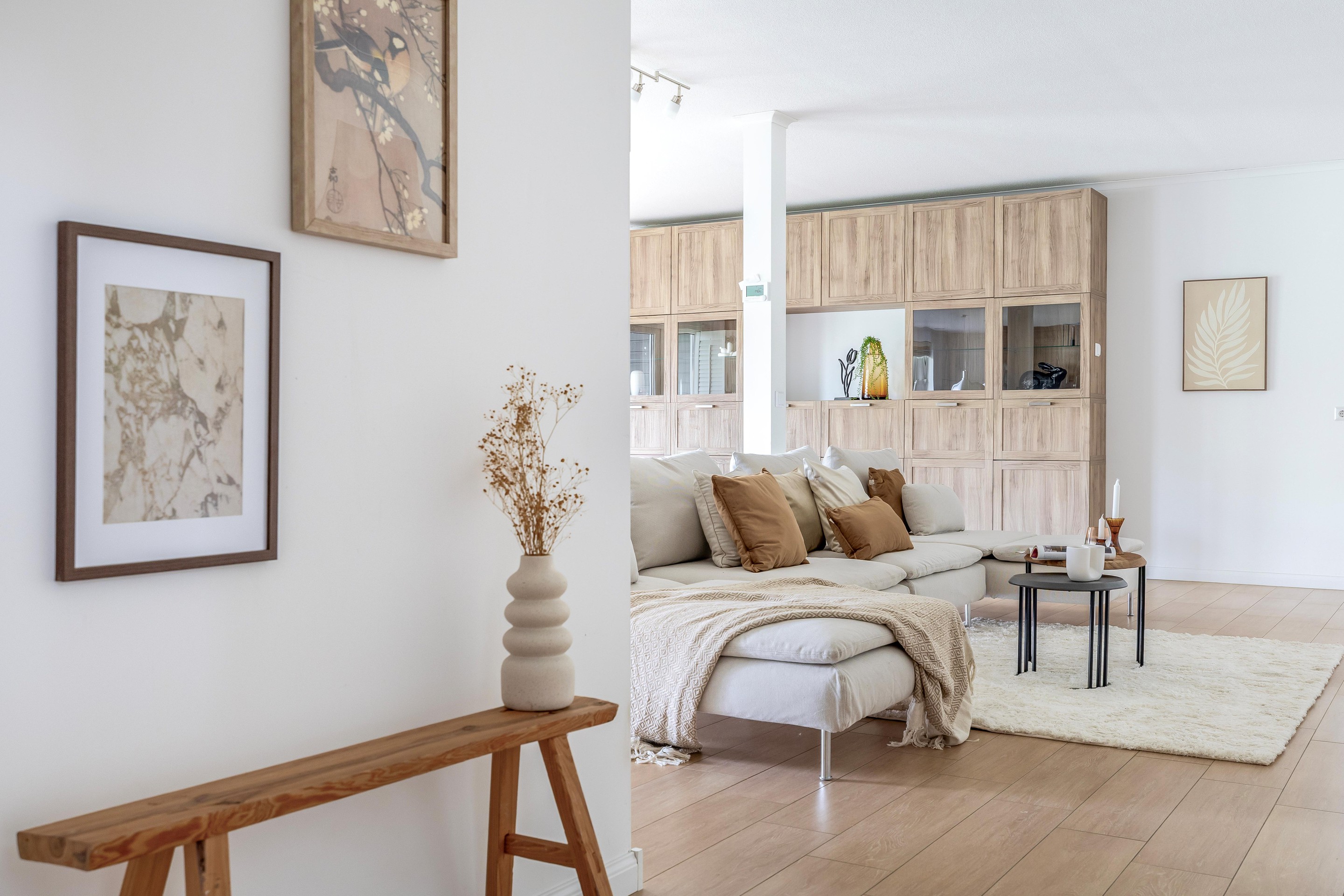 Plavuizen vloer v.v. vloerverwarming, dubbel openslaande deuren en een vaste kastenwand.