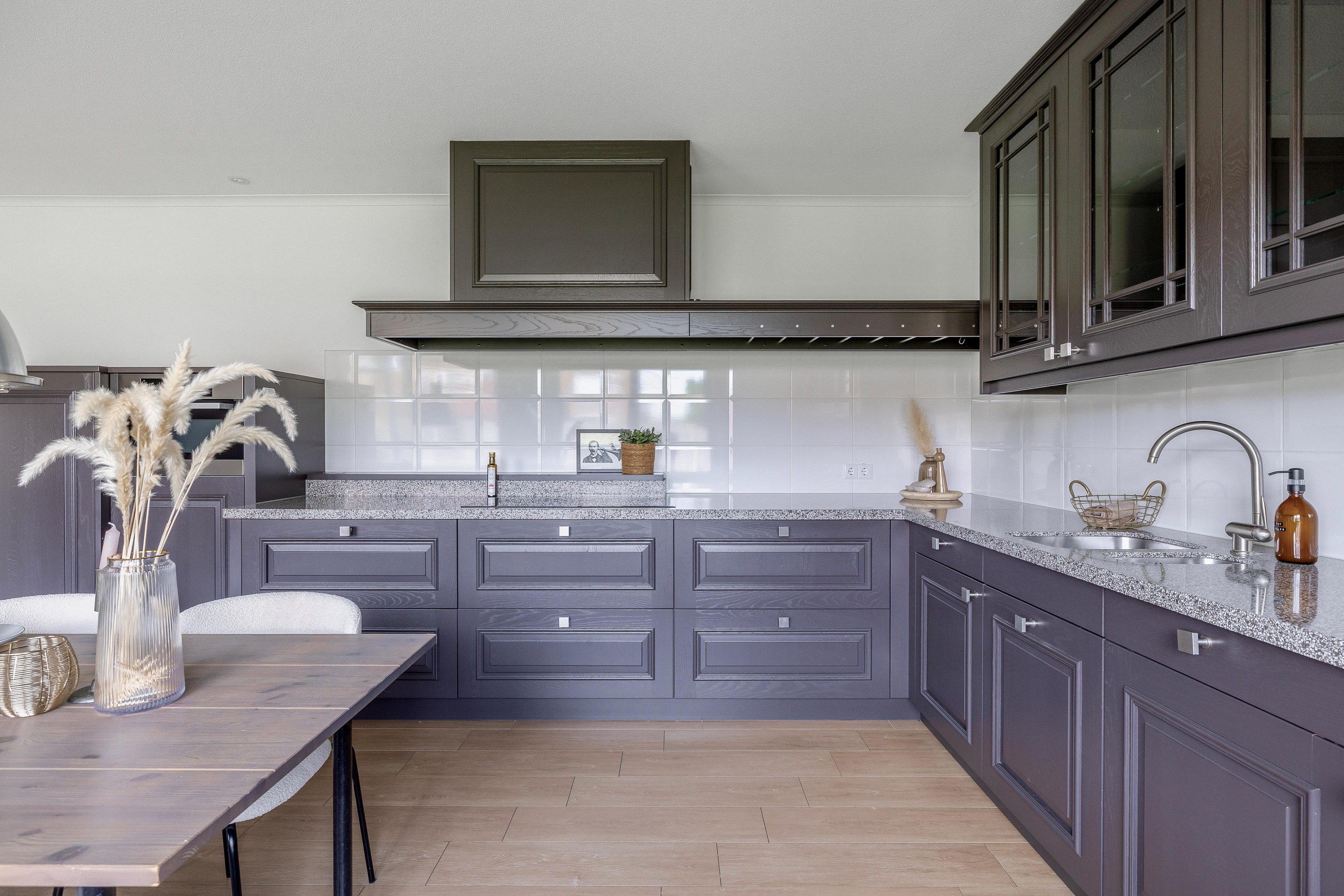 Plavuizen vloer v.v. vloerverwarming, inductiekookplaat, 3 fase, vaatwasser, close-in boiler, stoomoven, koelkast, vriezer, combimagnetron, afzuigkap en composiet werkblad