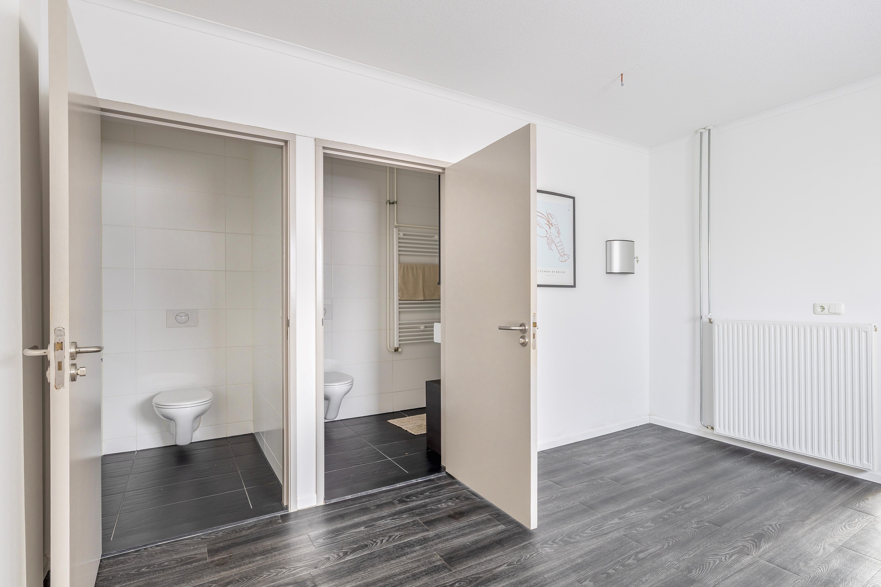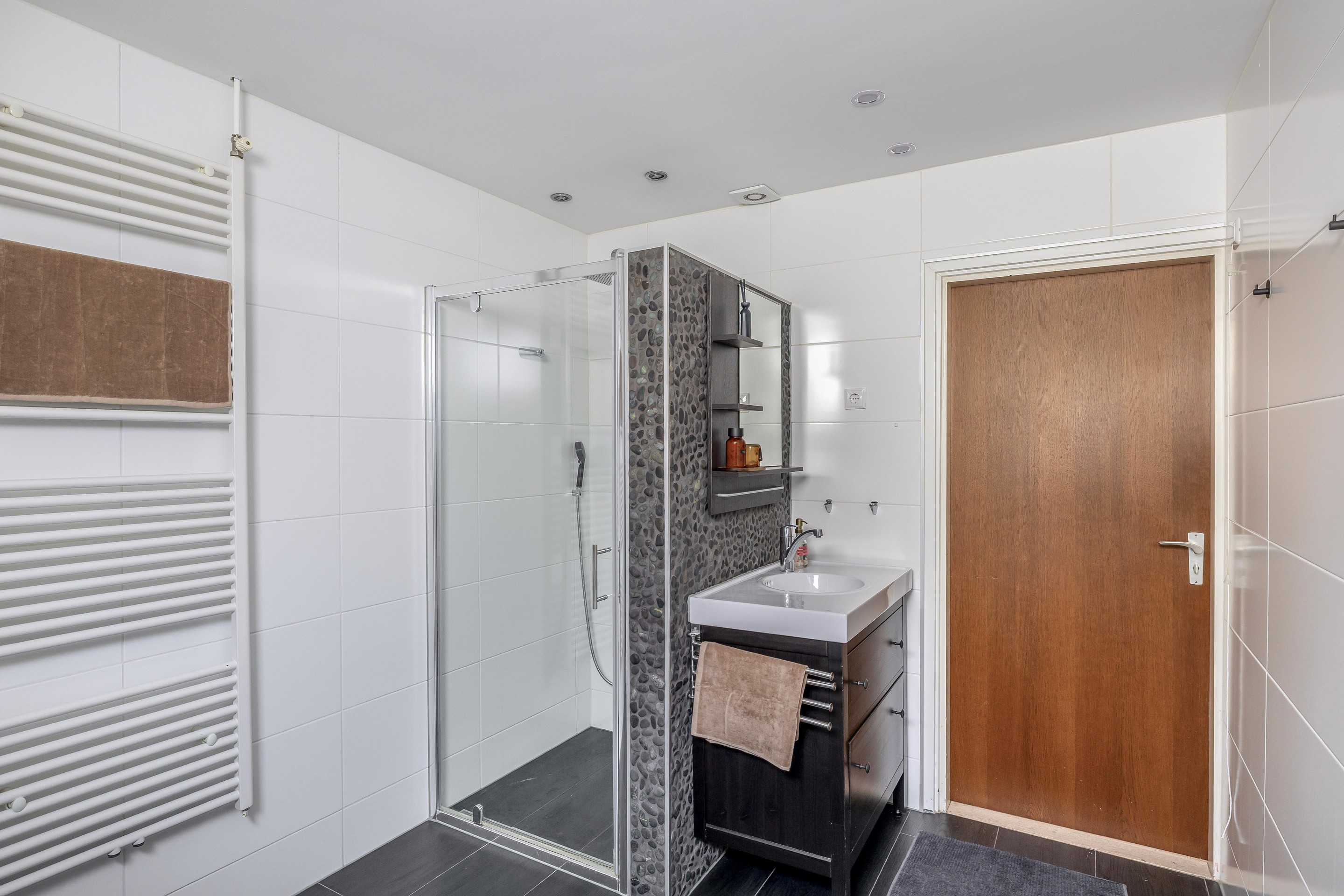 Naast de inloopkast bevindt zich een royale wasruimte met veel kastruimte en 3 witgoedaansluitingen met afvoer en een grote radiator.