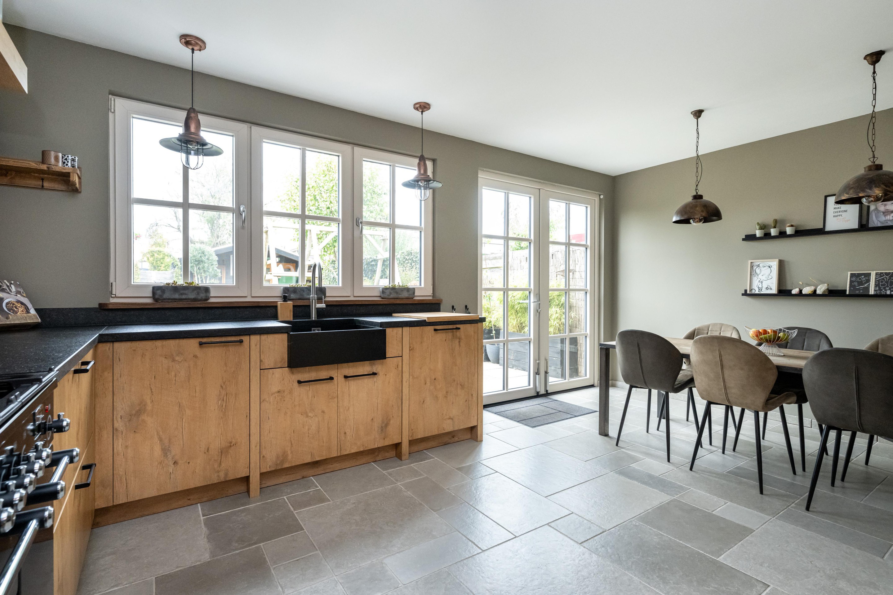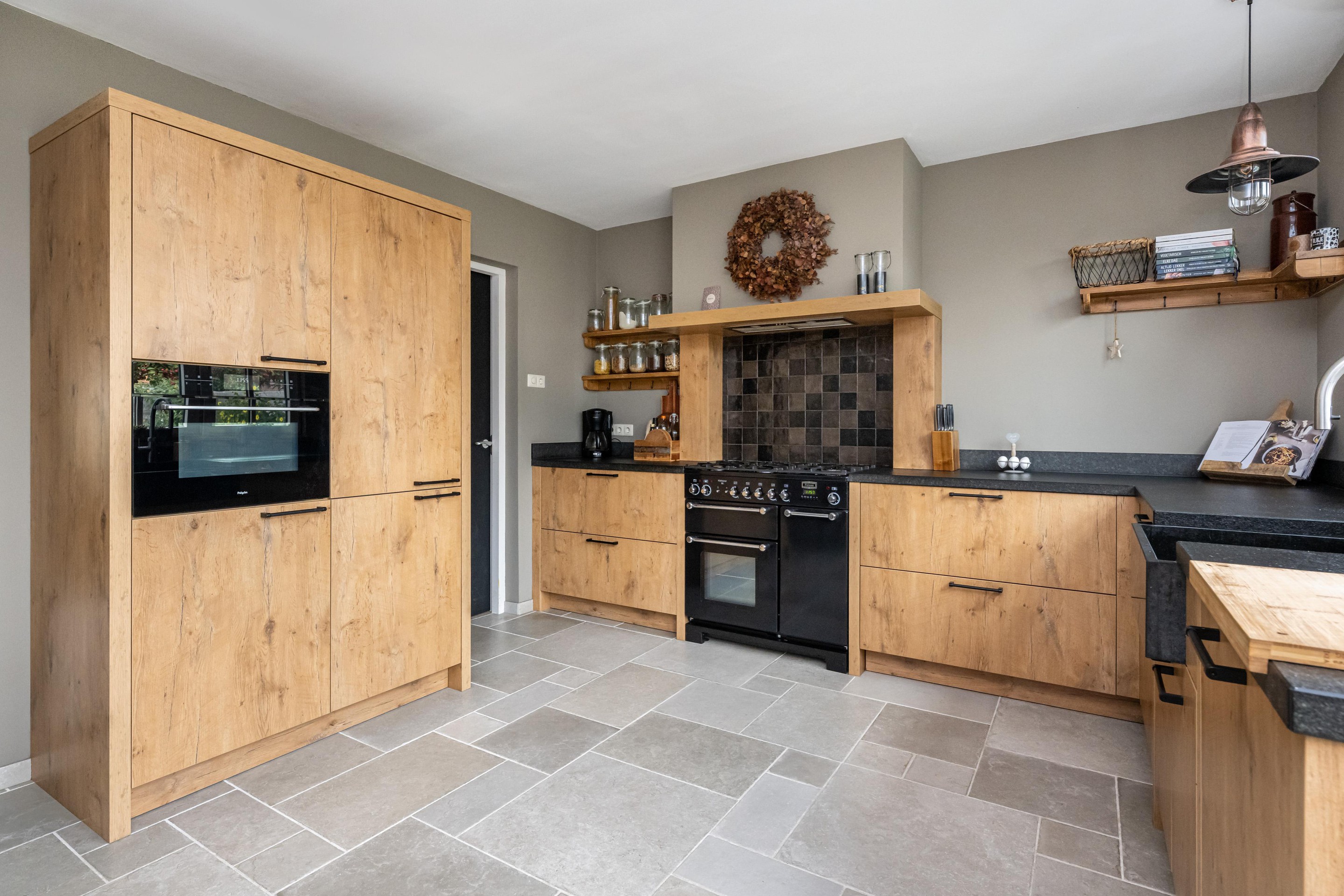 Aan de achterzijde van de woning bevindt zich de prachtige aanbouw uit 2021, waar een luxe woonkeuken is gerealiseerd die het hart van het huis vormt. Hier komt koken, gezelligheid en stijl samen. De keuken is uitgerust met een Quooker, enkele spoelbak, vaatwasser, combi-magnetron, een indrukwekkend Falcon vijfpits gasfornuis met twee ovens en grill, een afzuigkap, koelkast, vriezer en een composiet werkblad. De dubbel openslaande deuren geven direct toegang tot de tuin en zorgen voor een heerlijke verbinding tussen binnen en buiten – ideaal voor lange zomeravonden of een gezellig diner met familie en vrienden.