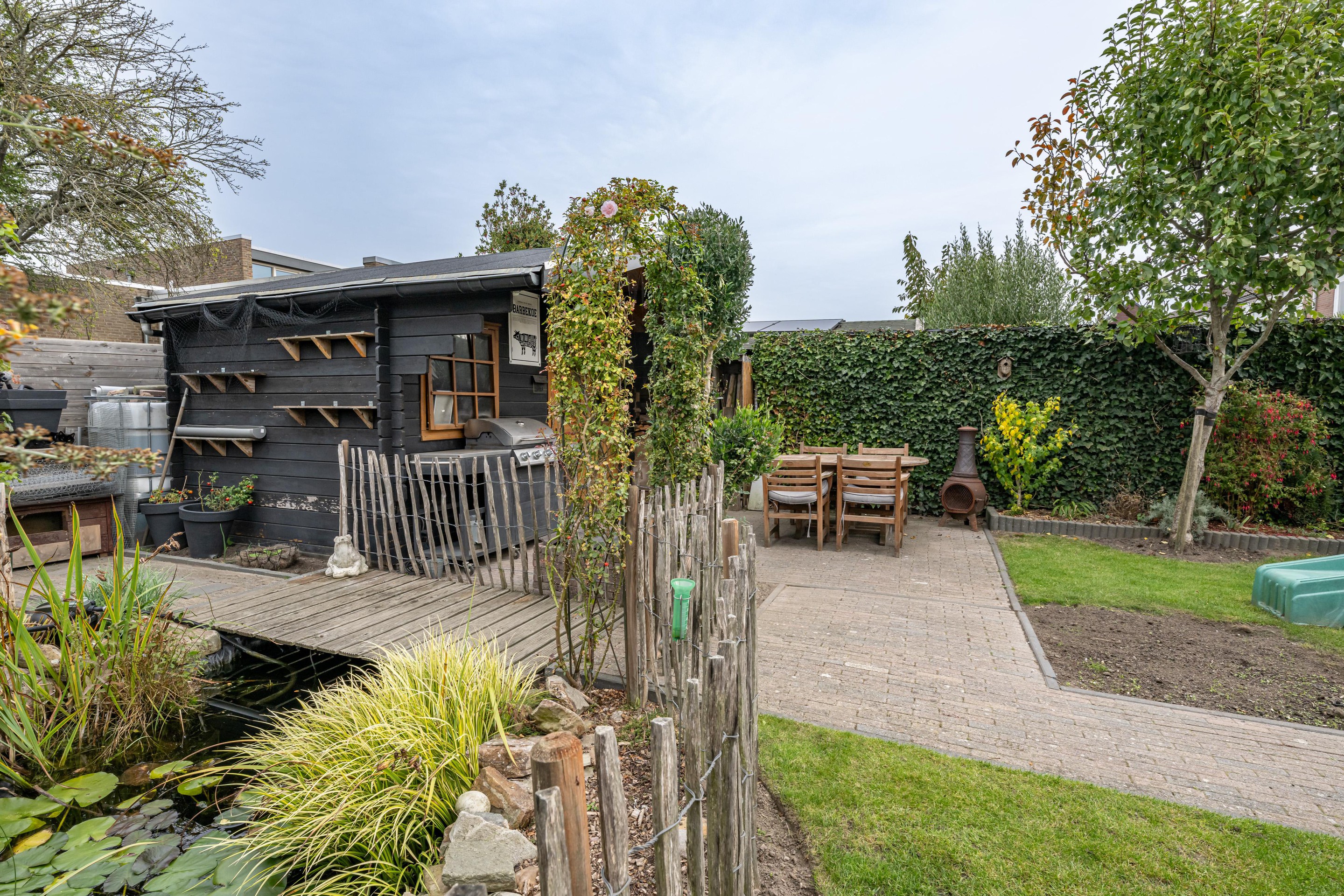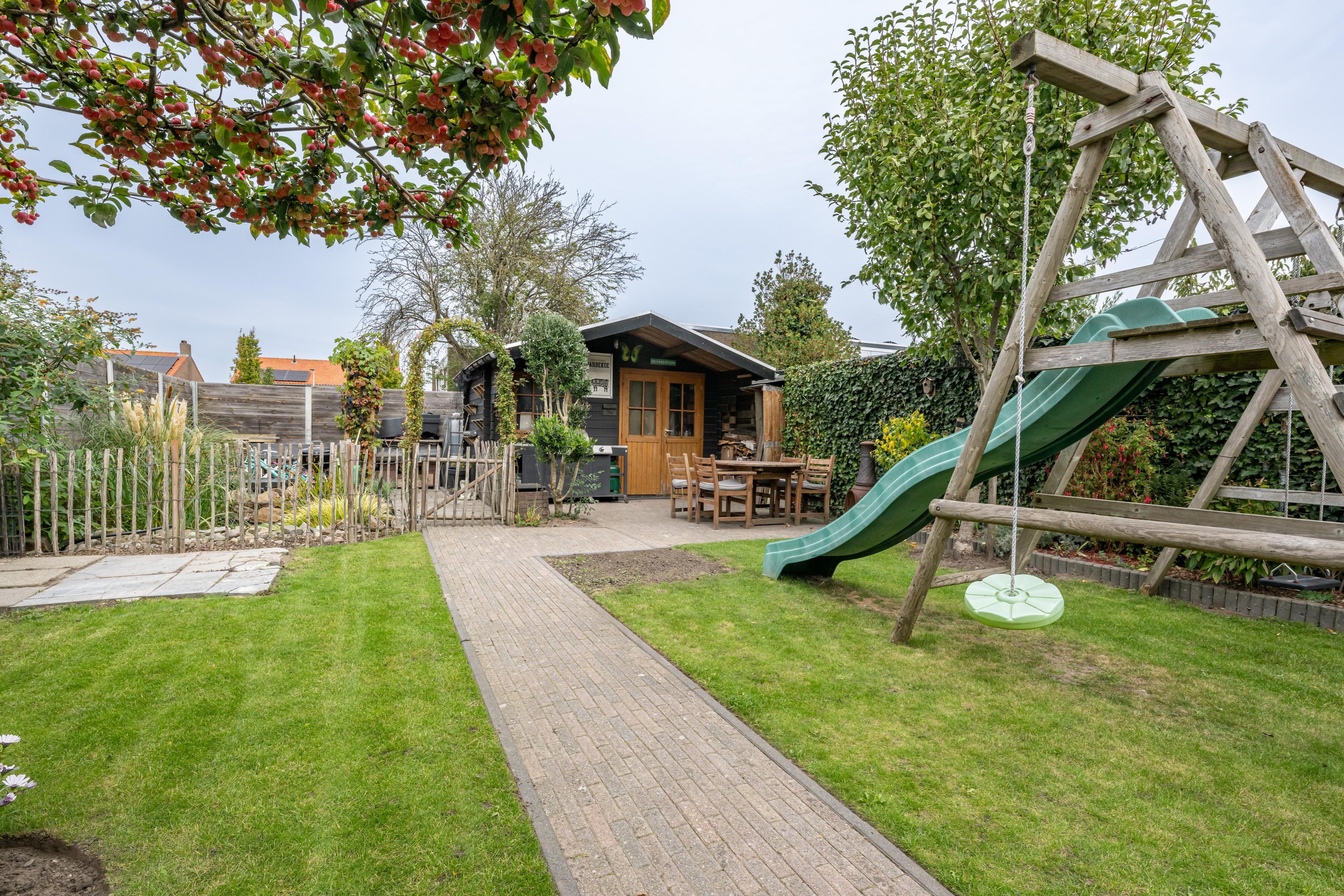 Bestraat, eigen achterom, gras, buitenkraan en vijver.