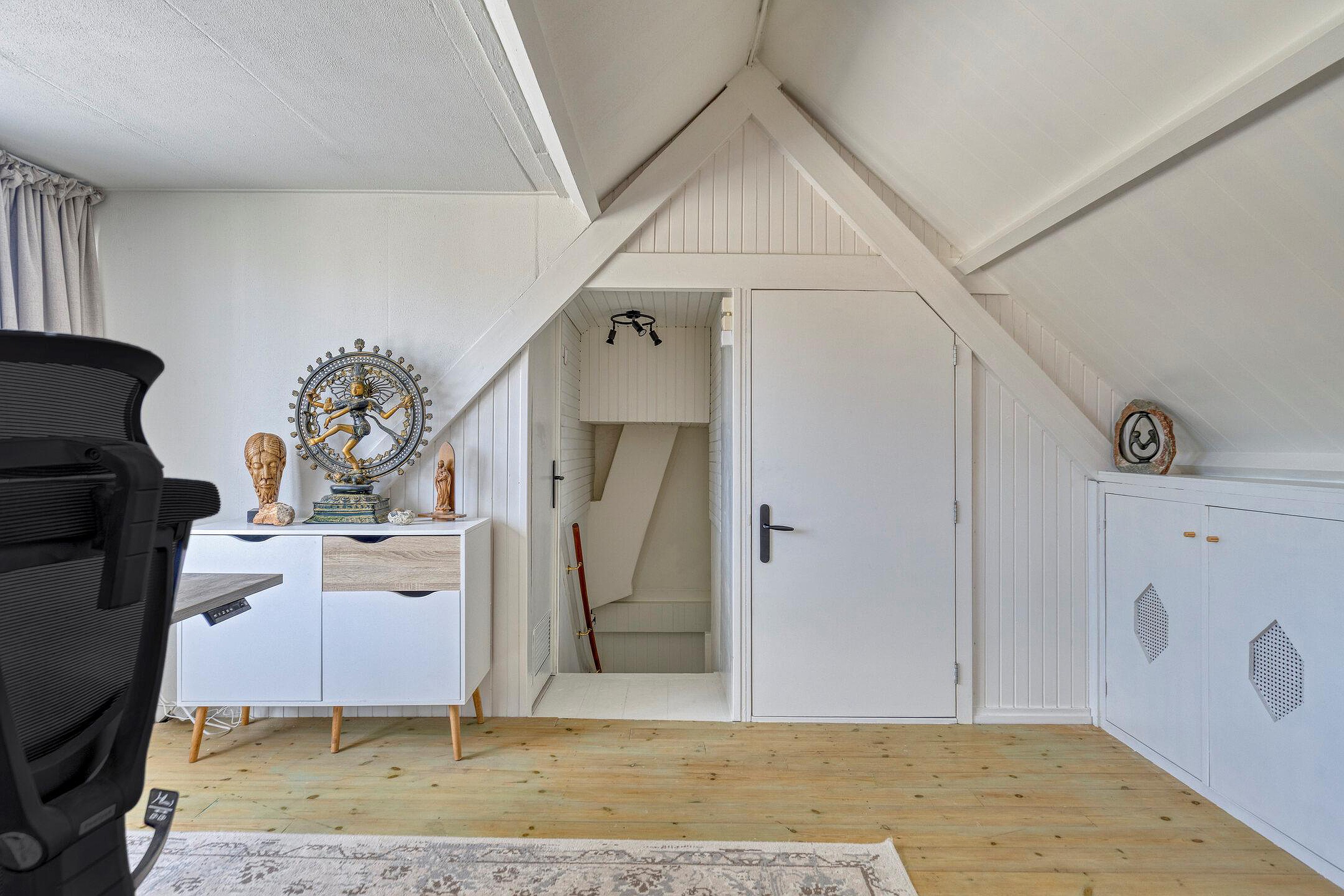 Eerste verdieping Overloop met aansluitend een riante kamer met diverse bergruimtes onder het dak. Deze kamer kan fungeren als tweede slaapkamer, maar bijvoorbeeld ook als thuiswerk- of praktijkkamer.