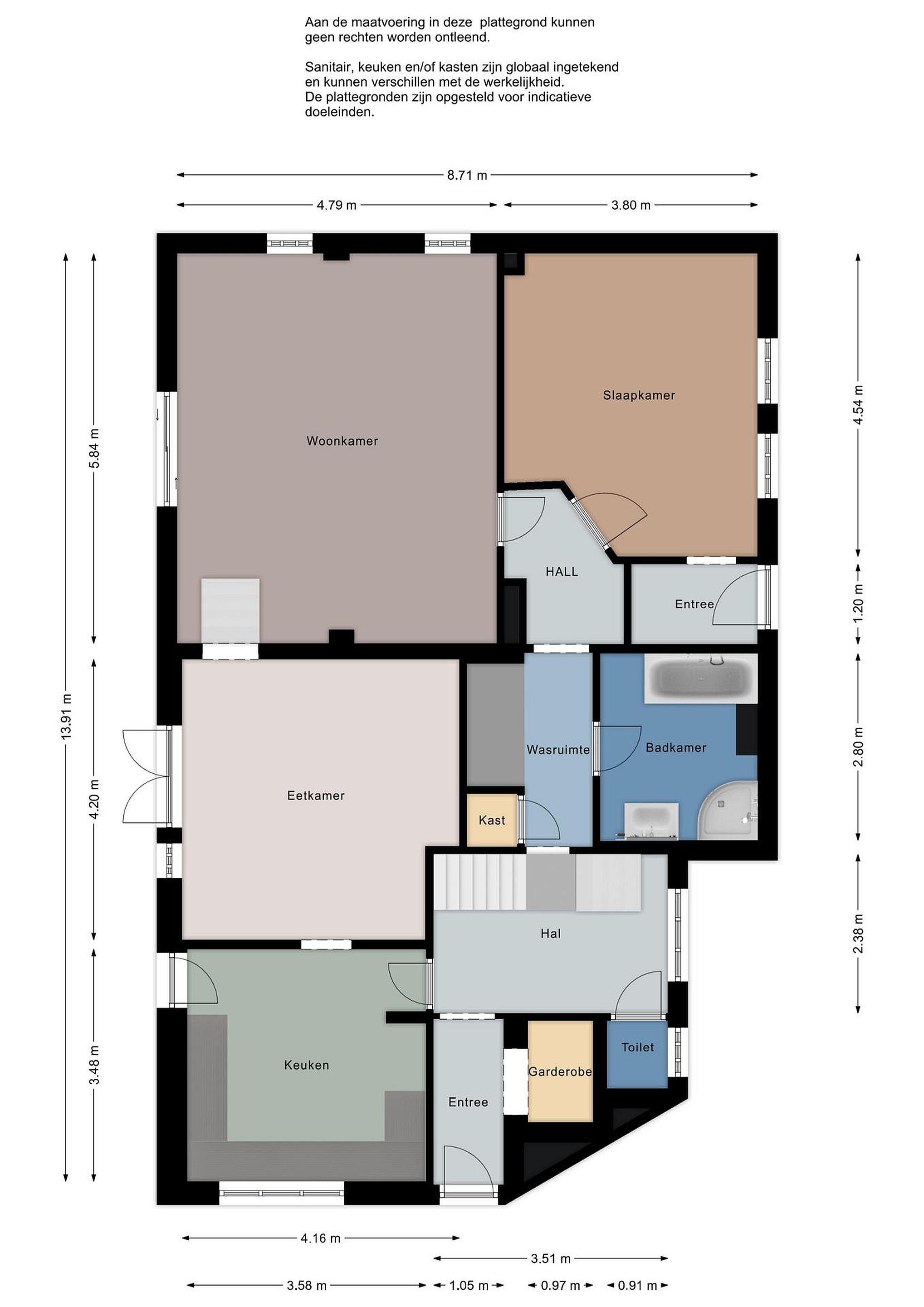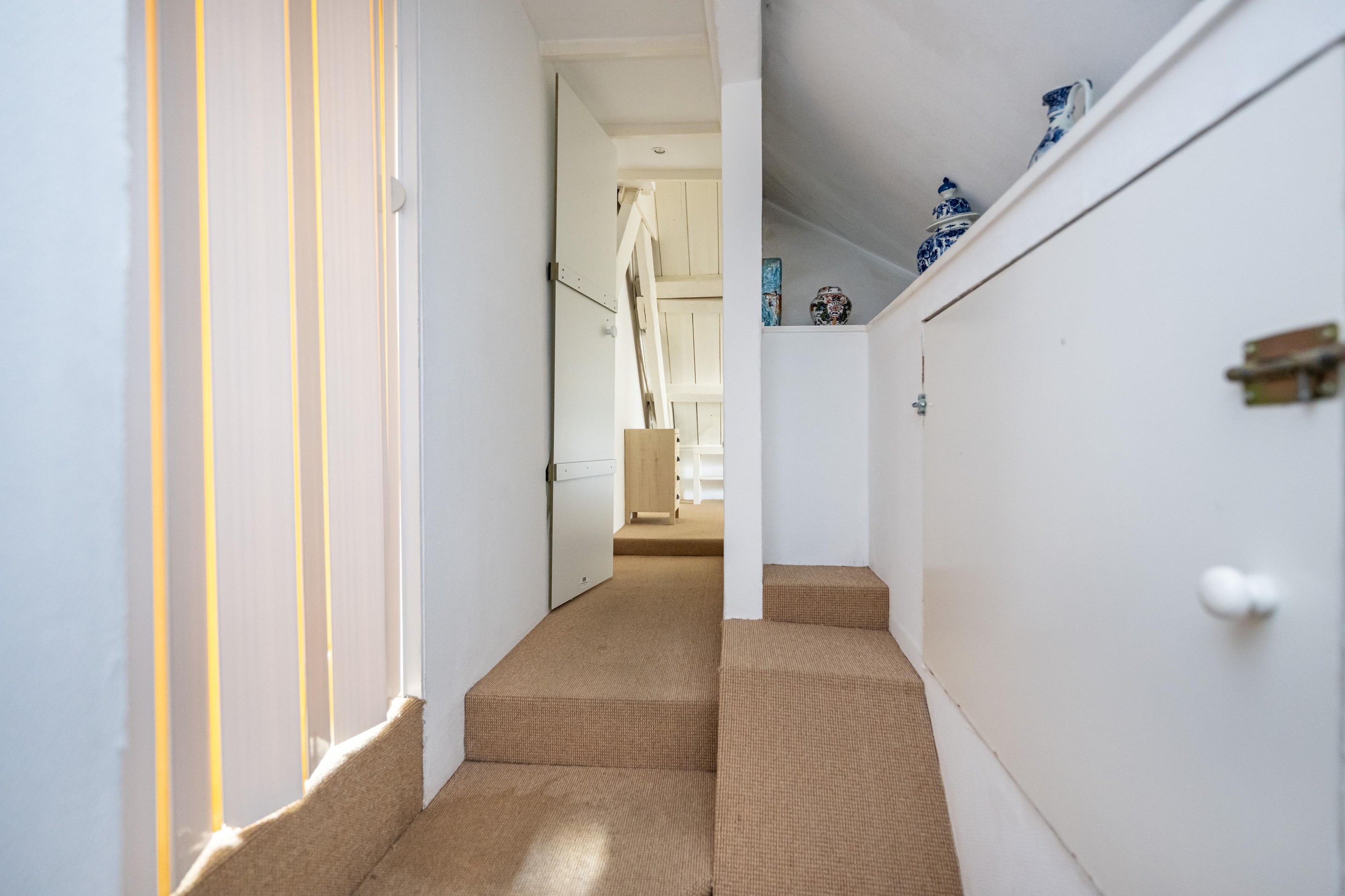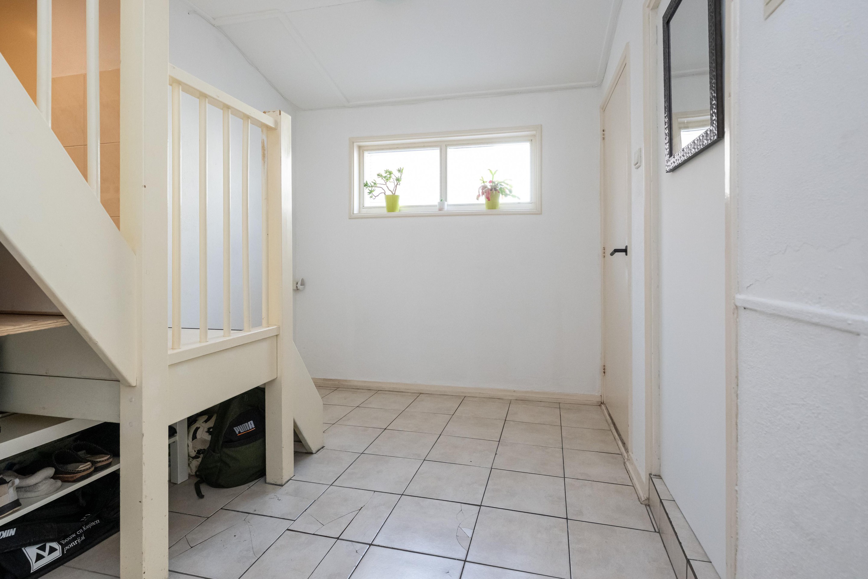 Plavuizenvloer, garderobe, trapopgang en meterkast.