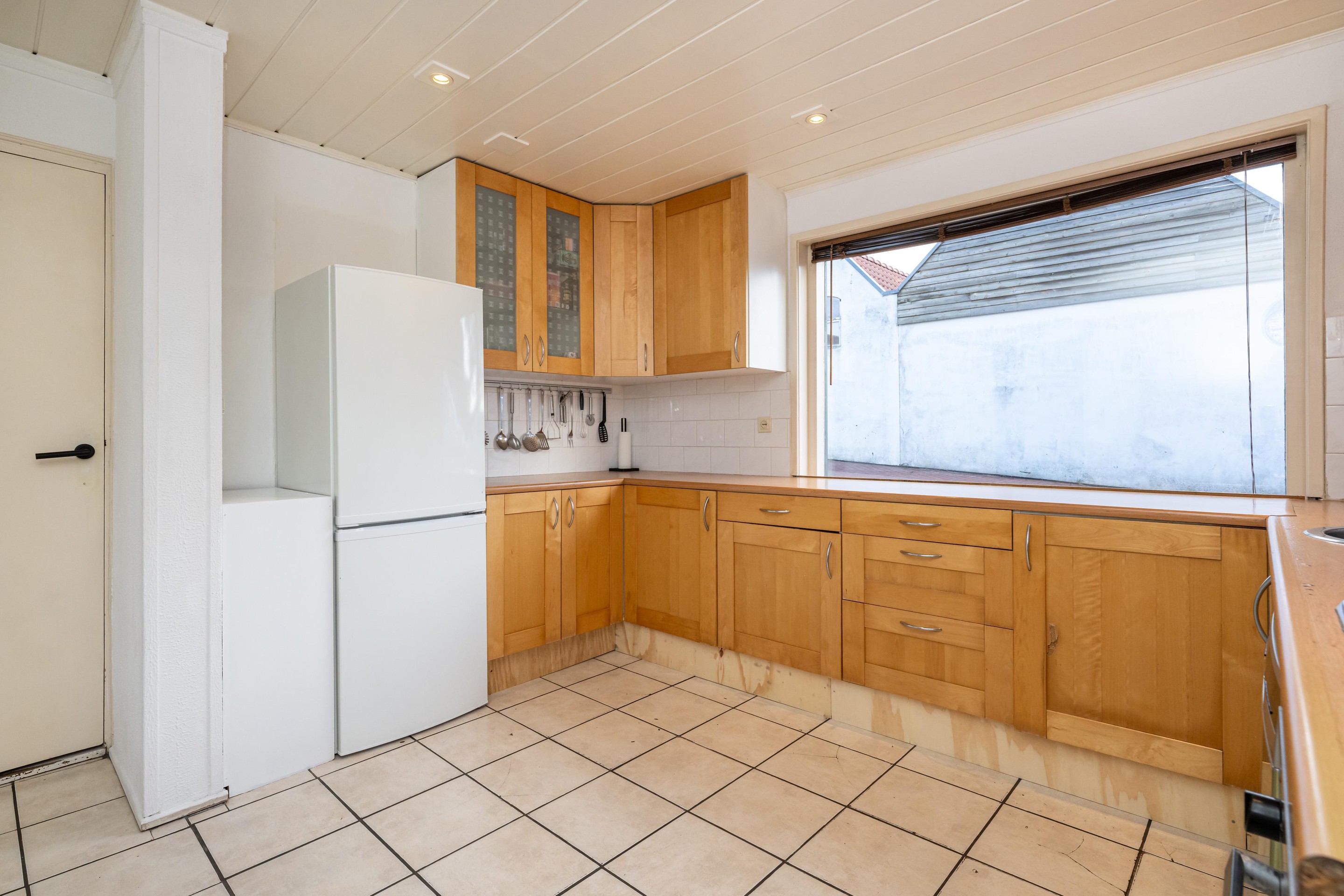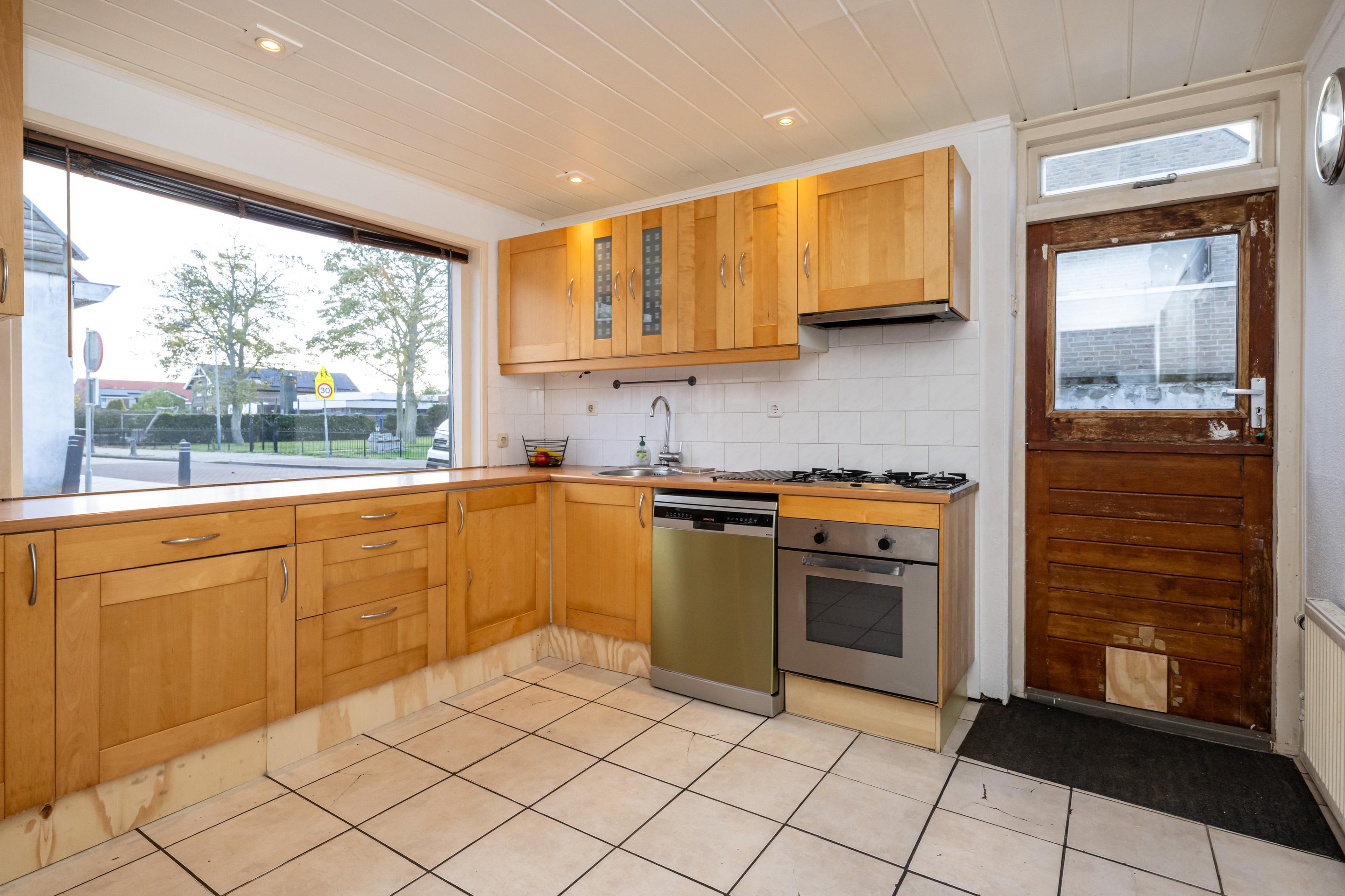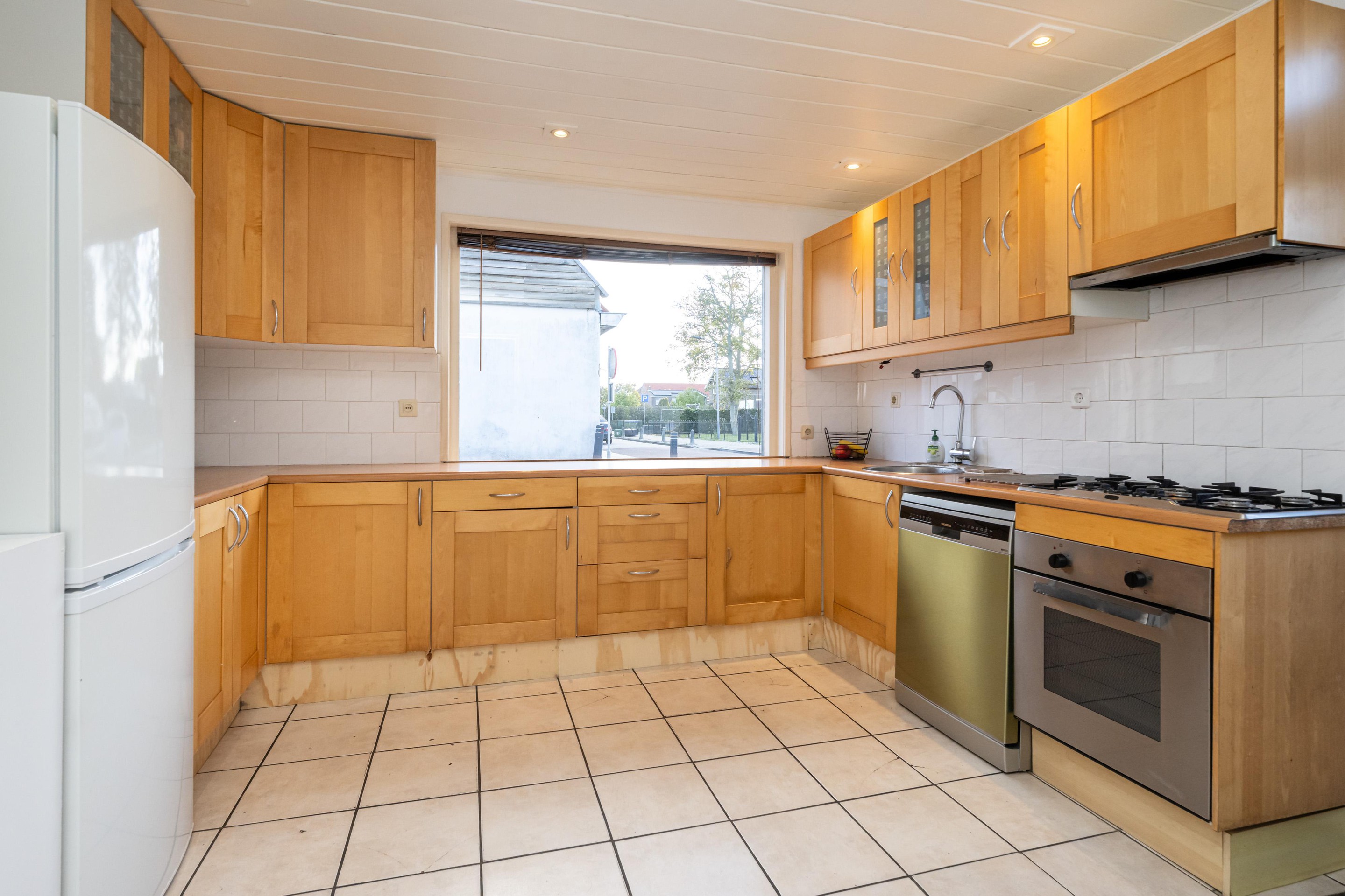 Plavuizenvloer, 5-pits gaskookplaat, afzuigkap, enkele spoelbak, elektrische oven, koel/vries combinatie losstaand, vaatwasser, radiator en deur naar achtertuin.