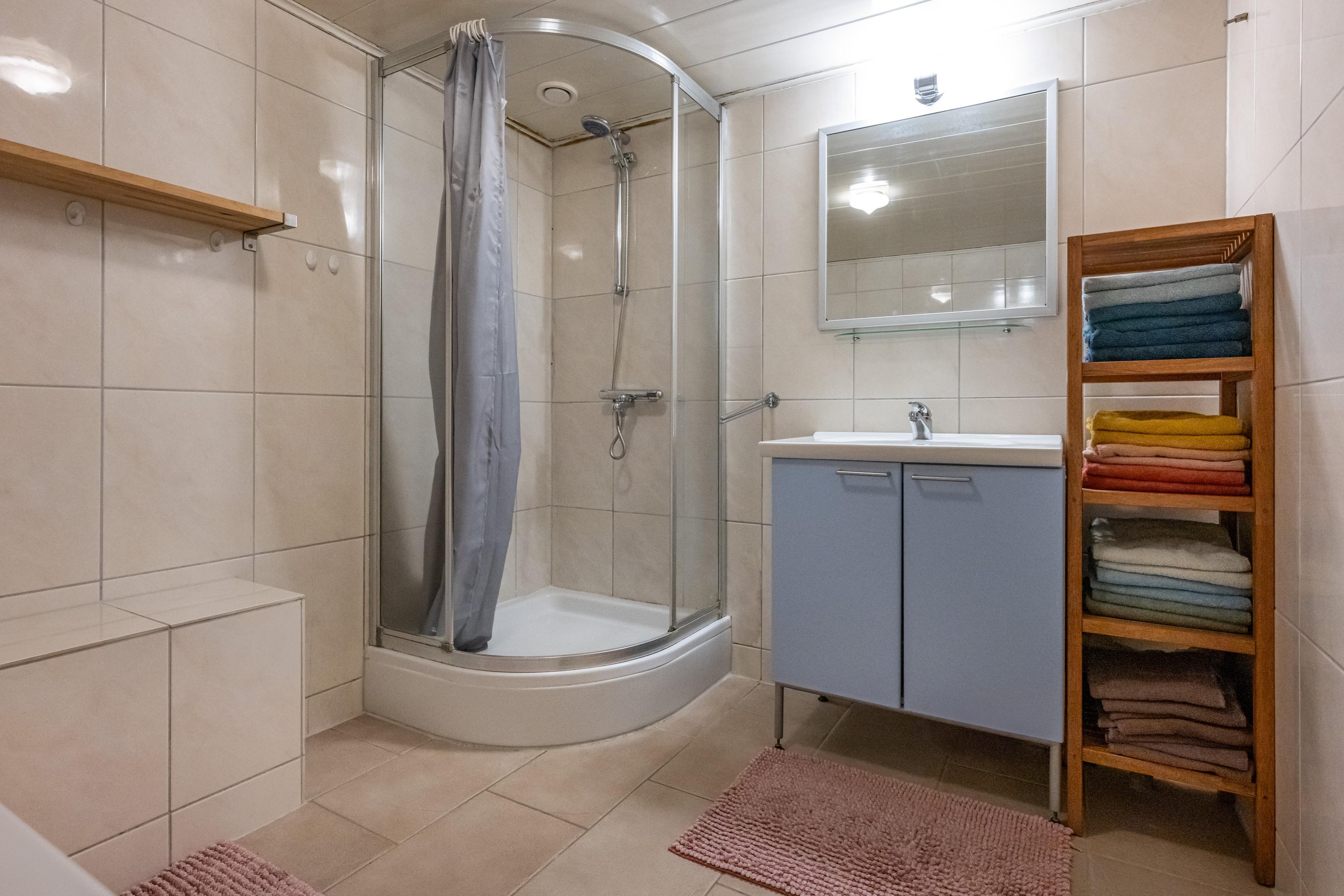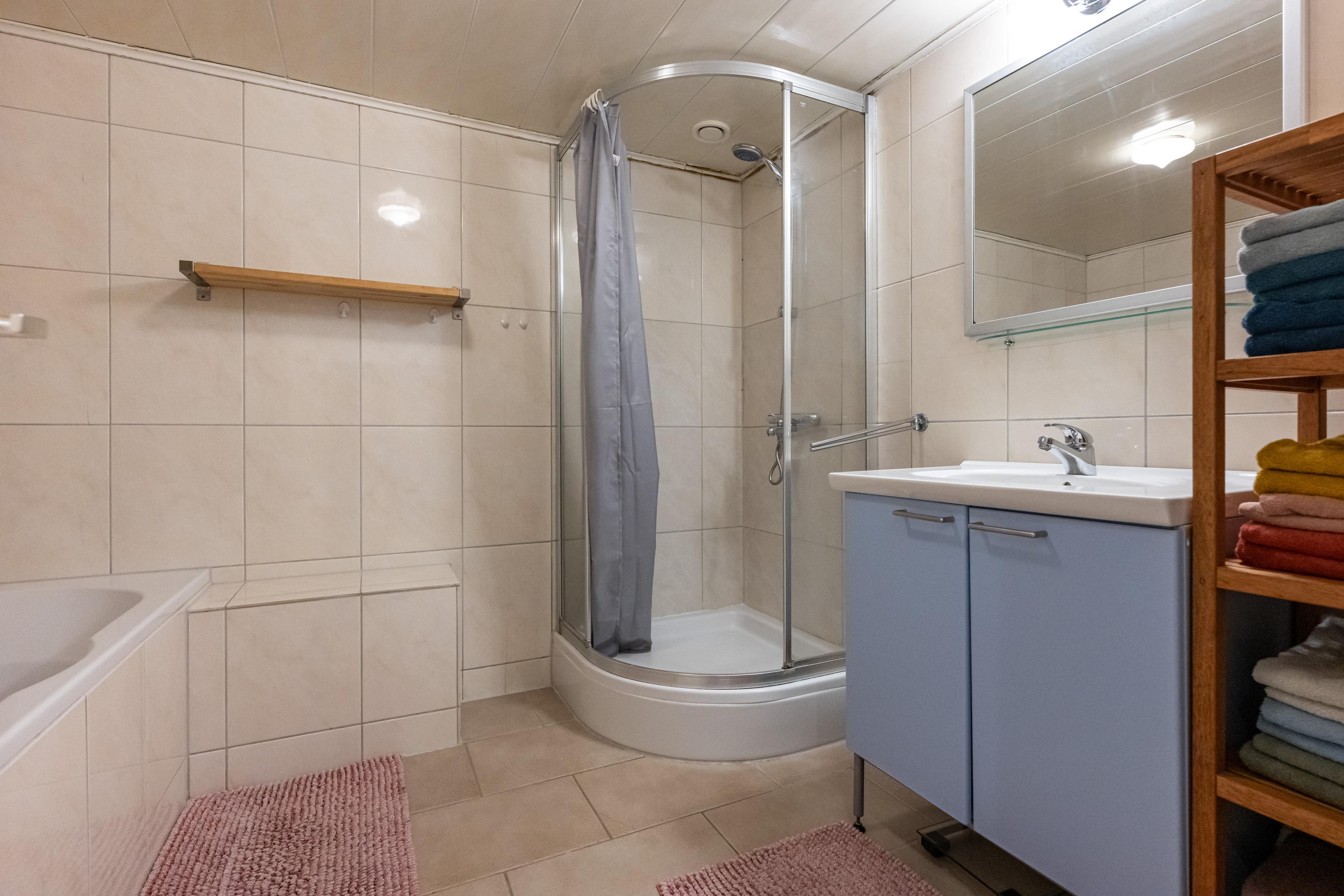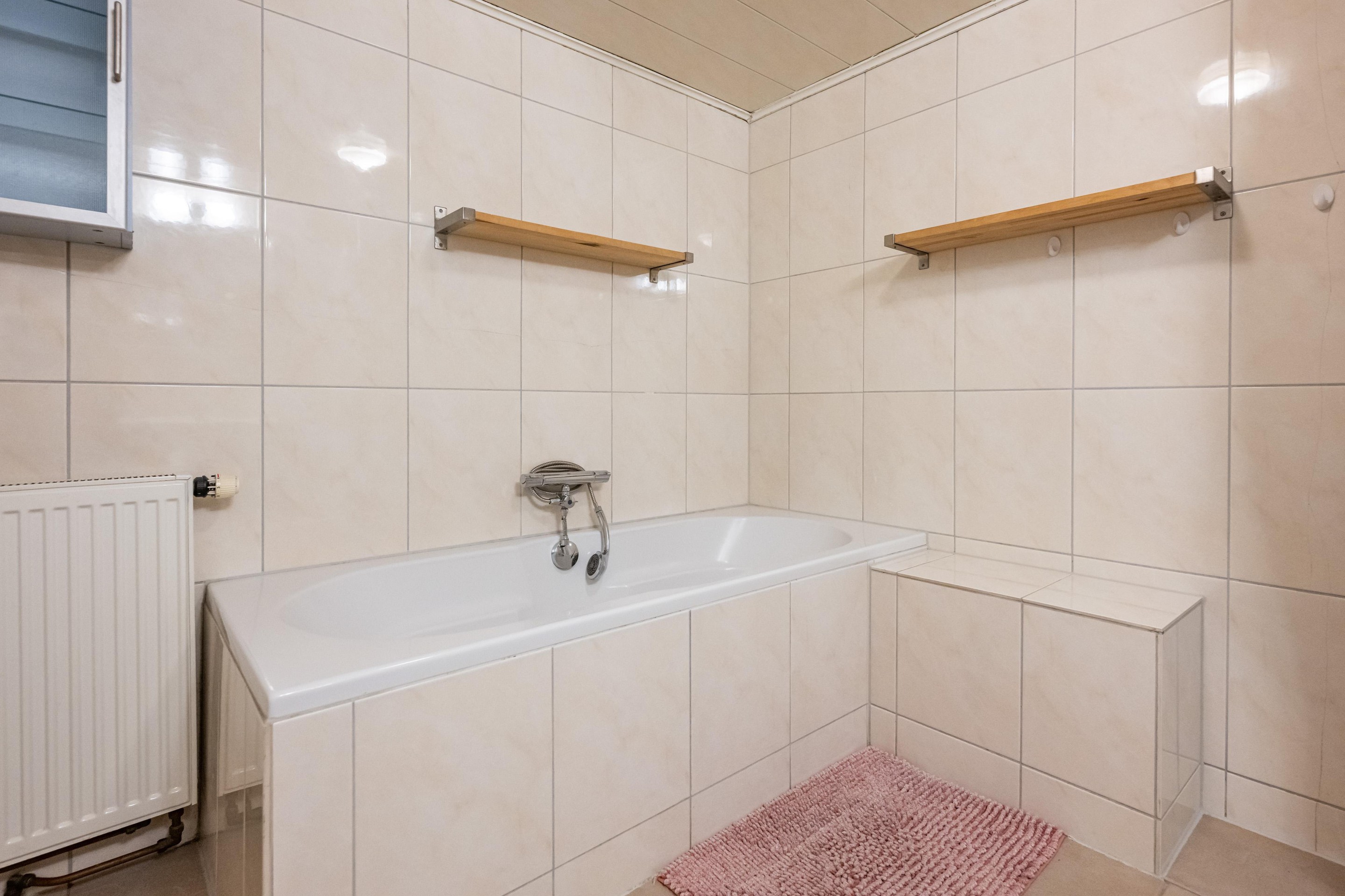 Plavuizenvloer, geheel betegeld, ligbad, wastafel met meubel, douche cabine, radiator en elektrische afzuiging.