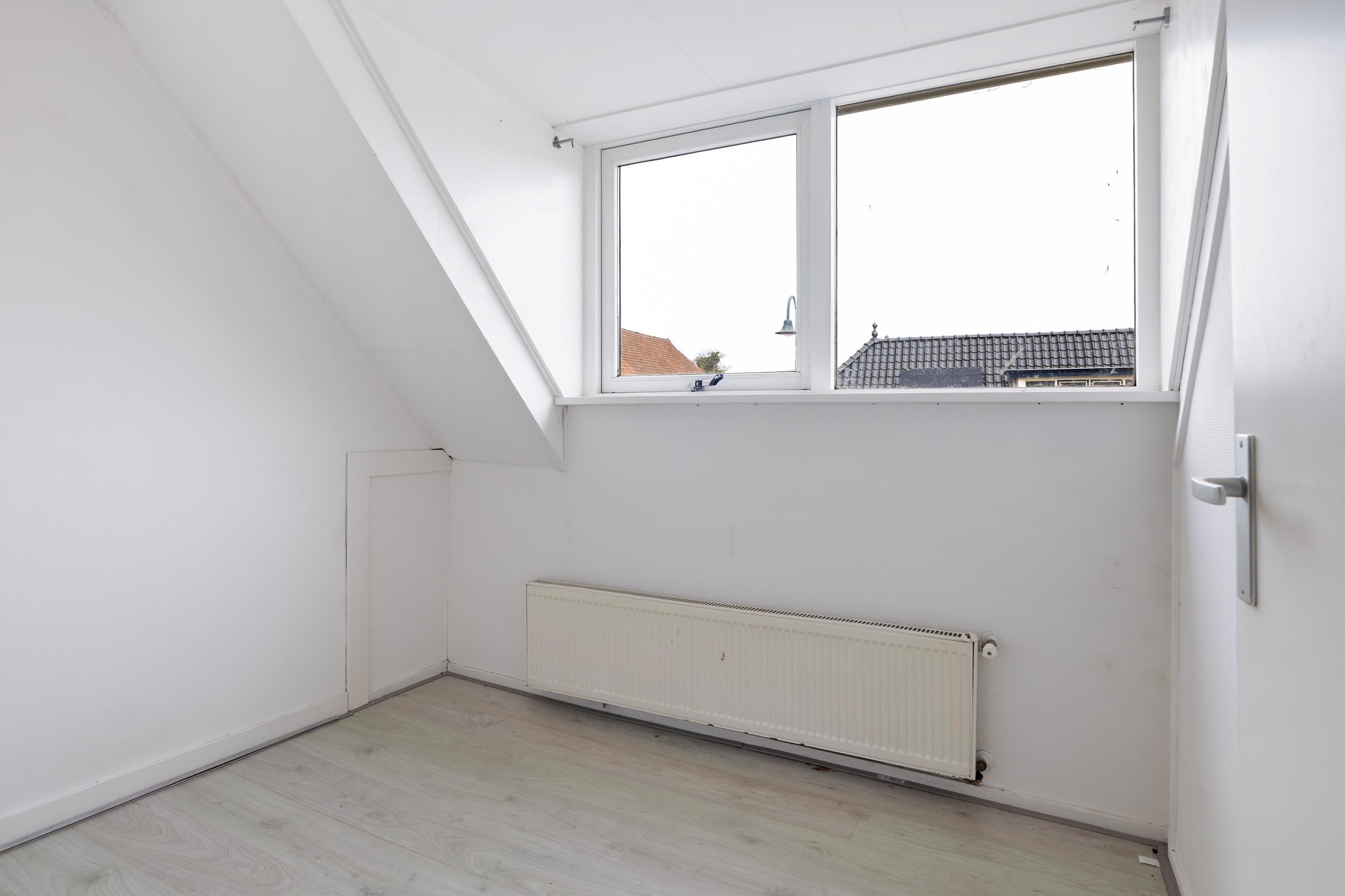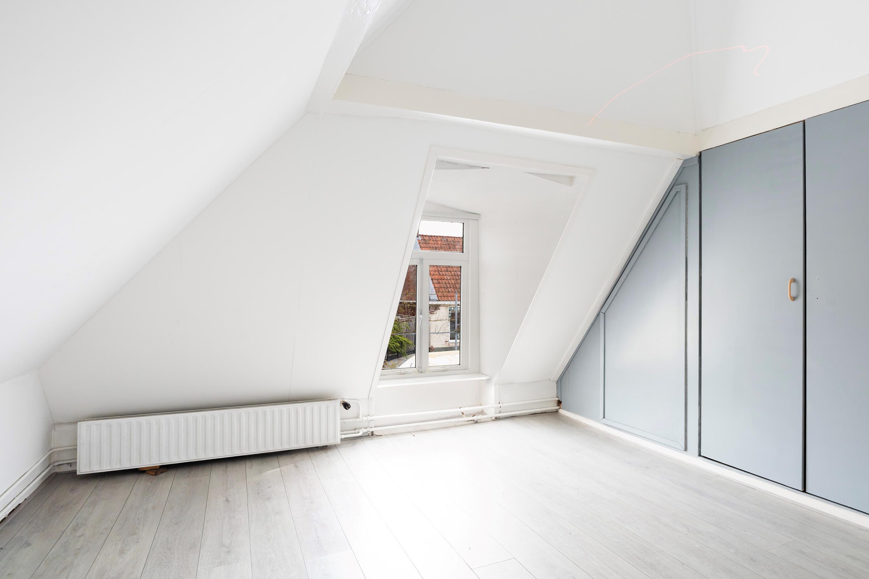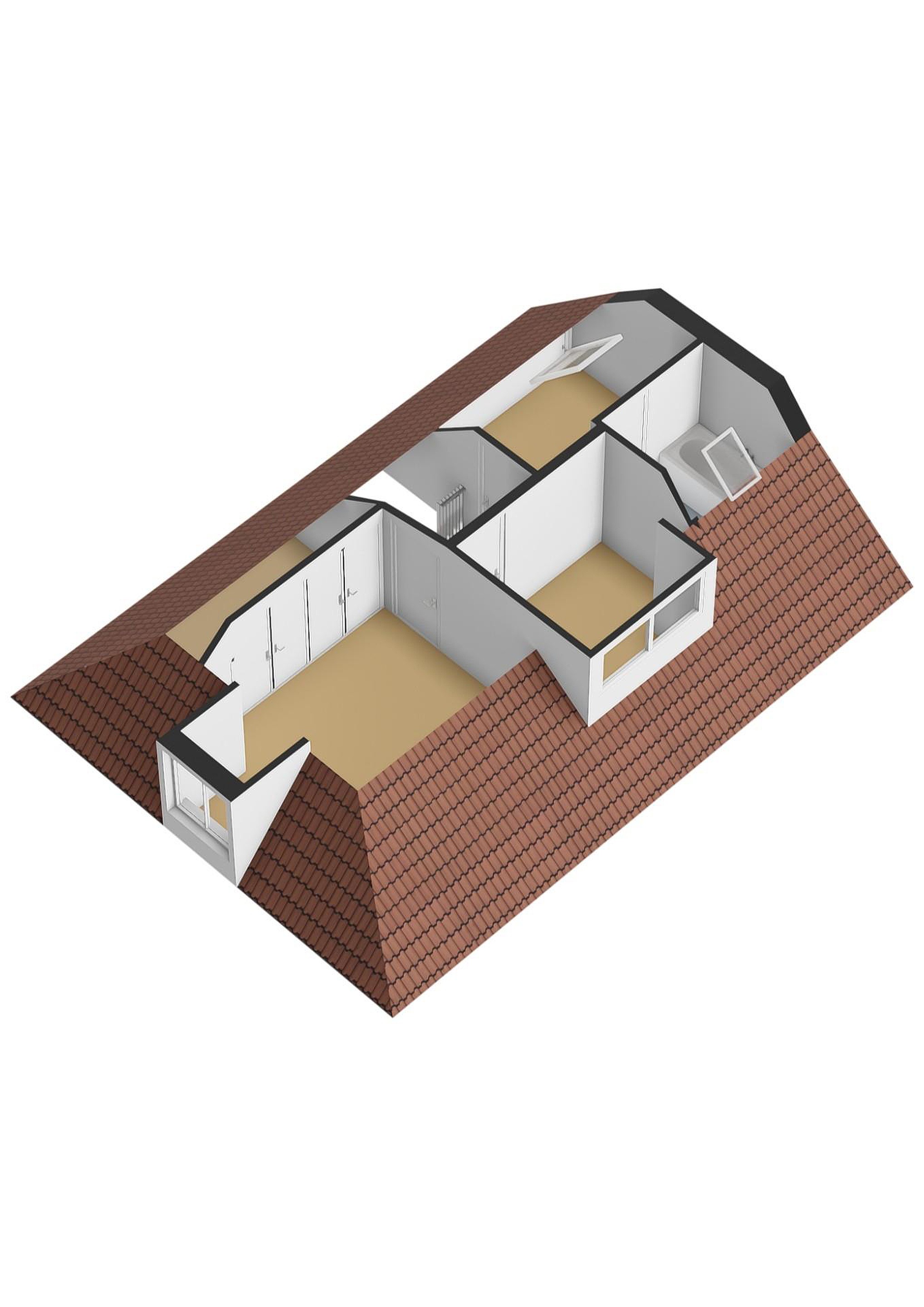 Op de verdieping bevinden zich drie slaapkamers, elk met een eigen indeling door de speelse kapvorm. De grootste slaapkamer beschikt over vaste kastruimte. De overige kamers zijn ideaal als kinder-, werk- of hobbykamer. De badkamer is compact en voorzien van een ligbad met douche en wastafel, met daglicht via het dakraam.