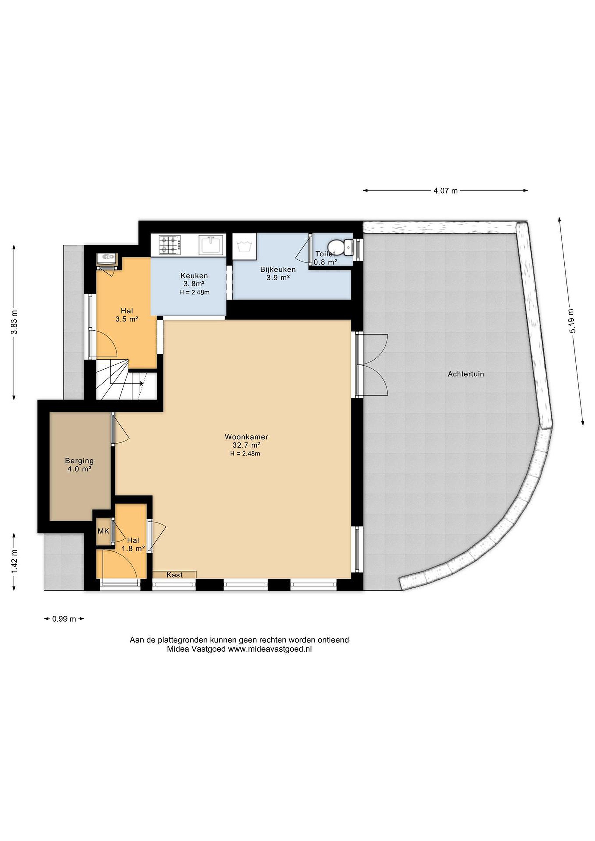 Deze informatie is door ons met de nodige zorgvuldigheid samengesteld, veelal aan de hand van de door verkoper aan ons ter hand gestelde gegevens en tekeningen. Onzerzijds wordt echter geen enkele aansprakelijkheid aanvaard voor enige onvolledigheid, onjuistheid of anderszins, dan wel de gevolgen daarvan. Dit geldt voor onder meer de opgegeven maten, oppervlakten, isolatie en ouderdom van technische installaties.