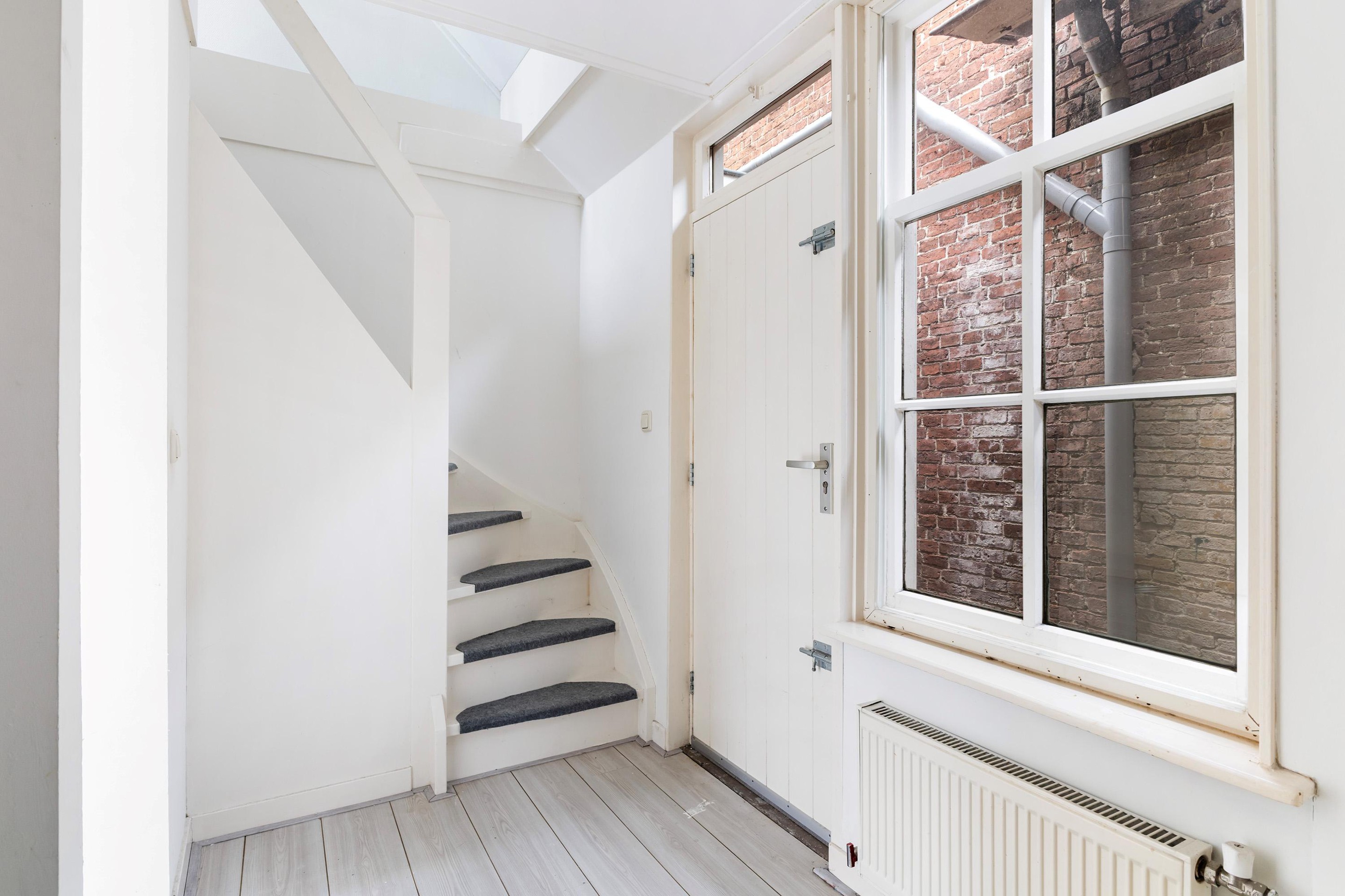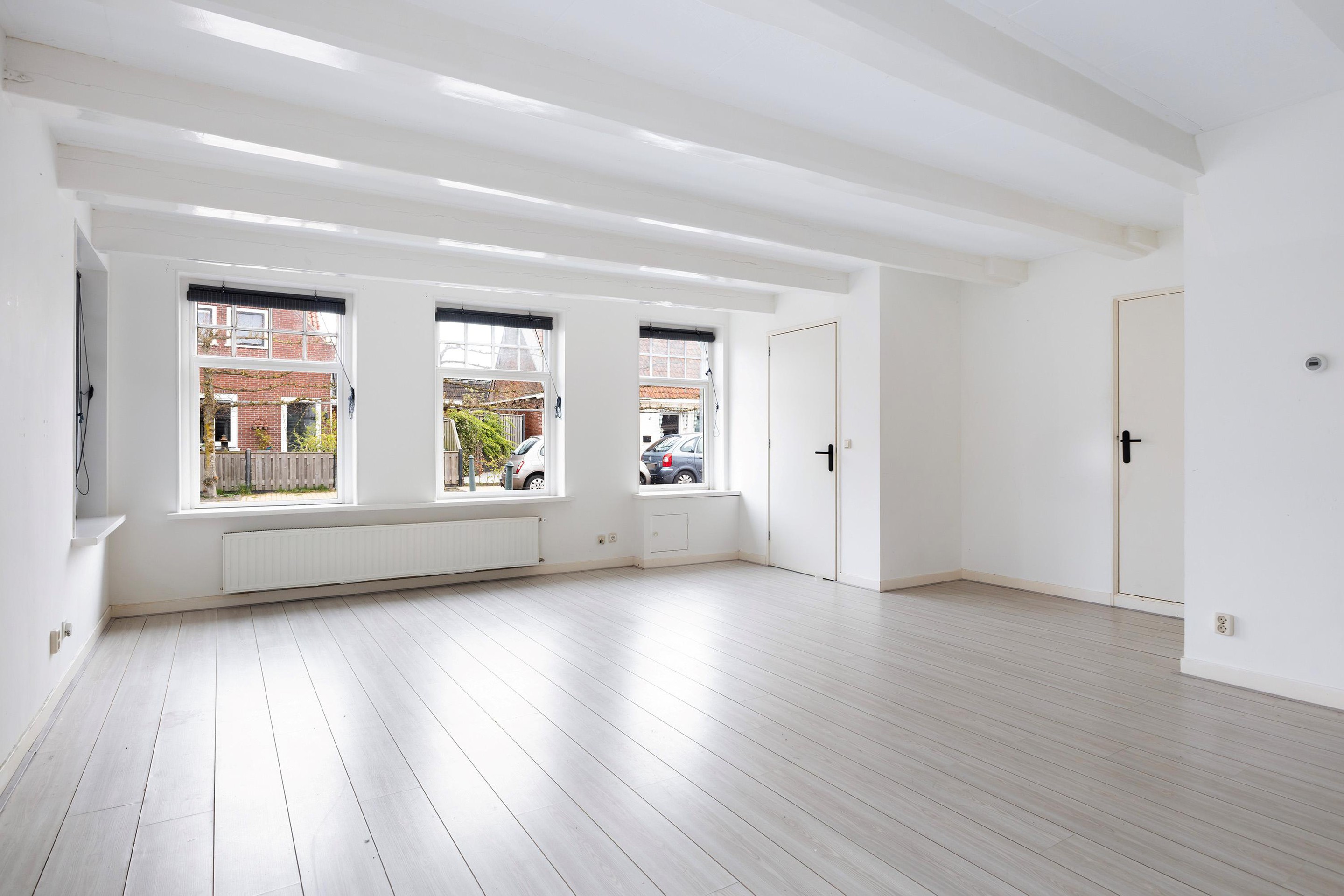Via de entree kom je binnen in een kleine hal aan de voorzijde met meterkast en toegang tot de woonkamer. De woonkamer is verrassend ruim (ca. 33 m2) en heeft een lichte, frisse uitstraling dankzij de nette, neutrale afwerking. Het balkenplafond geeft de ruimte extra sfeer en karakter, terwijl de charmante raampartijen zorgen voor een prettige lichtinval en een mooie verbinding met buiten. Een fijne leefruimte met volop mogelijkheden voor een gezellige zit- en eethoek. Via de openslaande deuren in de woonkamer is er toegang tot de achterplaats, waar je een beschutte buitenruimte hebt met voldoende privacy. Vanuit de woonkamer is er toegang tot een inpandige berging, die zich uitstekend leent als royale kastruimte of praktische opslagruimte. Aan de achterzijde van de woning bevindt zich de keuken in een rechte opstelling, eenvoudig maar functioneel en voorzien van basisapparatuur. Aansluitend kom je in de bijkeuken met toilet en extra bergruimte. Vanuit de hal achterin de woning is toegang tot de binnenplaats via een smalle steeg – een praktische doorgang naar buiten. Tevens is hier de trapopgang naar de verdieping bereikbaar.