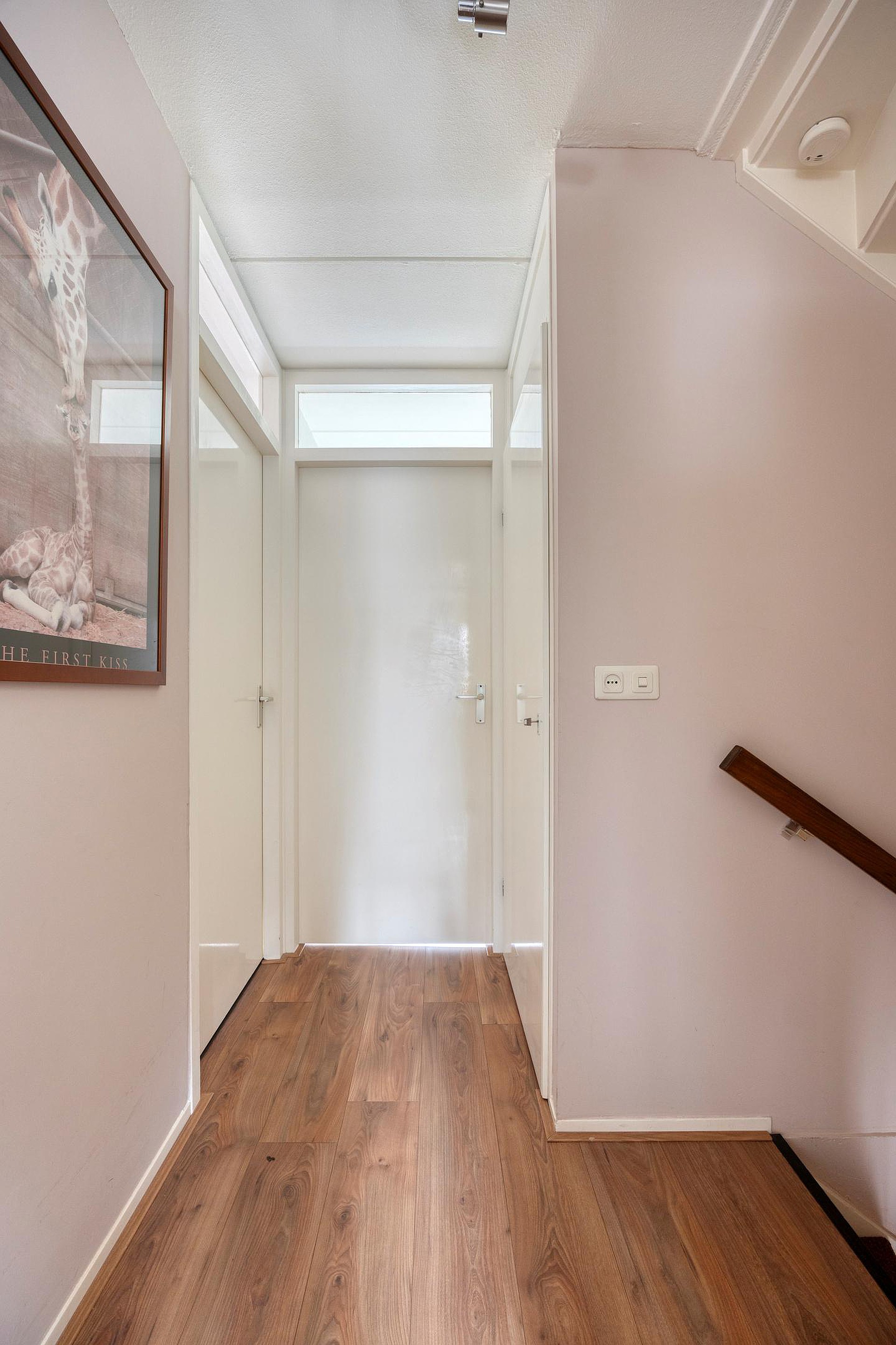 Op de eerste verdieping vind je drie ruime slaapkamers, waar van de voorste kamer beschikt over een Frans balkon, en de badkamer. Deze is netjes en royaal en biedt een douchecabine, een toilet en een wastafelmeubel. De vaste kast op de overloop biedt extra bergruimte.