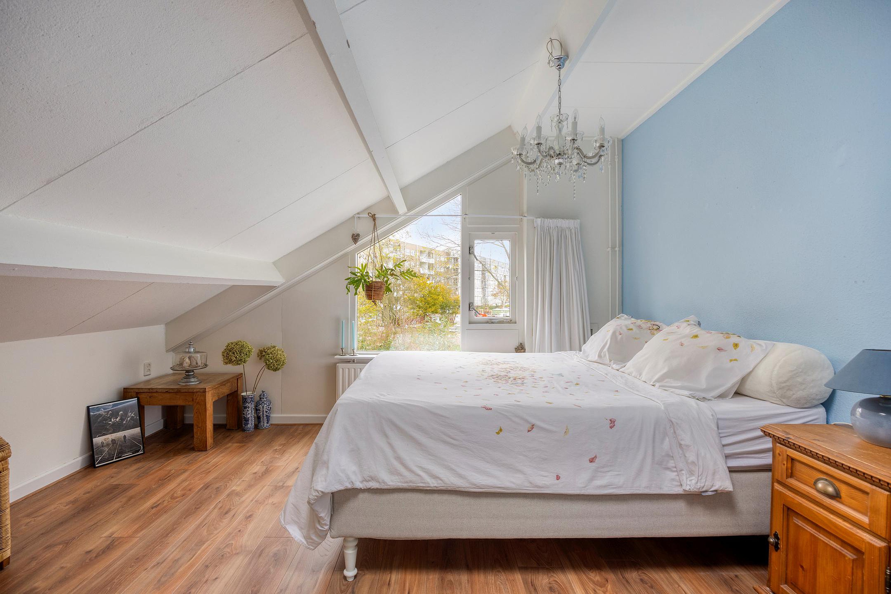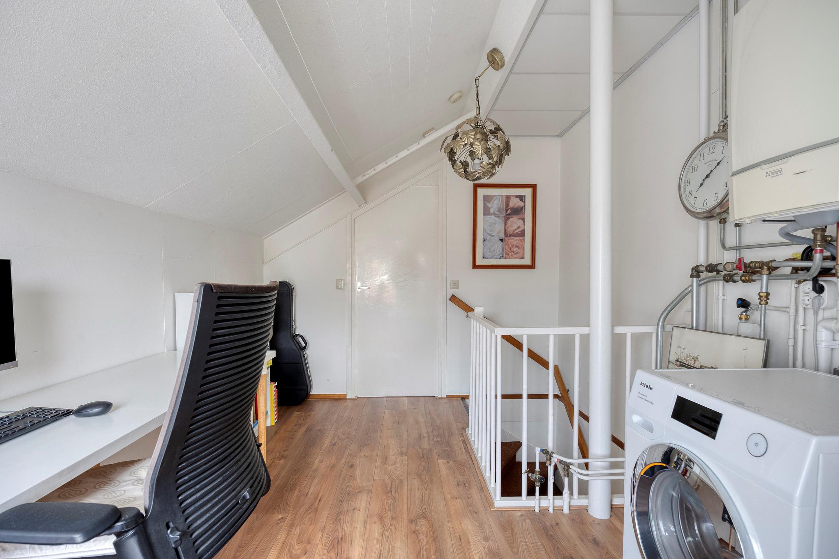 Tweede verdieping De tweede verdieping verrast met een grote vierde slaapkamer, volop licht en bergruimte. Op de overloop is plaats voor de wasmachine, cv-installatie én een werkplek; ideaal voor thuiswerken of studeren.