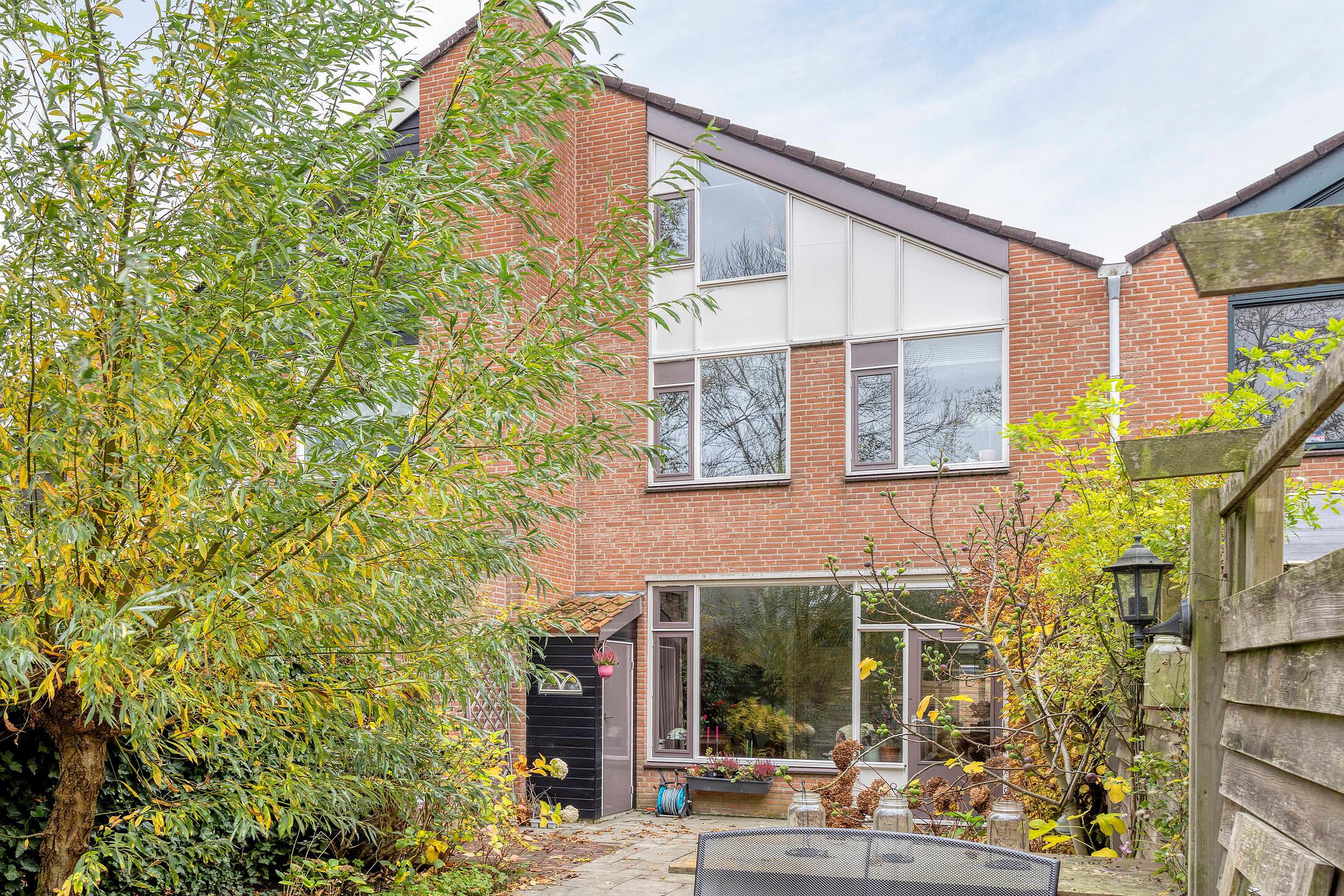 De achtertuin ligt op het noordoosten en biedt, dankzij de lengte van de tuin, volop zon van de vroege ochtend tot laat in de avonduren. Dankzij de groenstrook met hoge bomen achter het perceel geniet je hier van rust, privacy en een echt ‘buiten’ gevoel. De bijgevoegde zomerfoto’s laten prachtig zien hoe sfeervol het hier is in het seizoen! Verder is de tuin geheel omsloten en is er een vrije achterom.