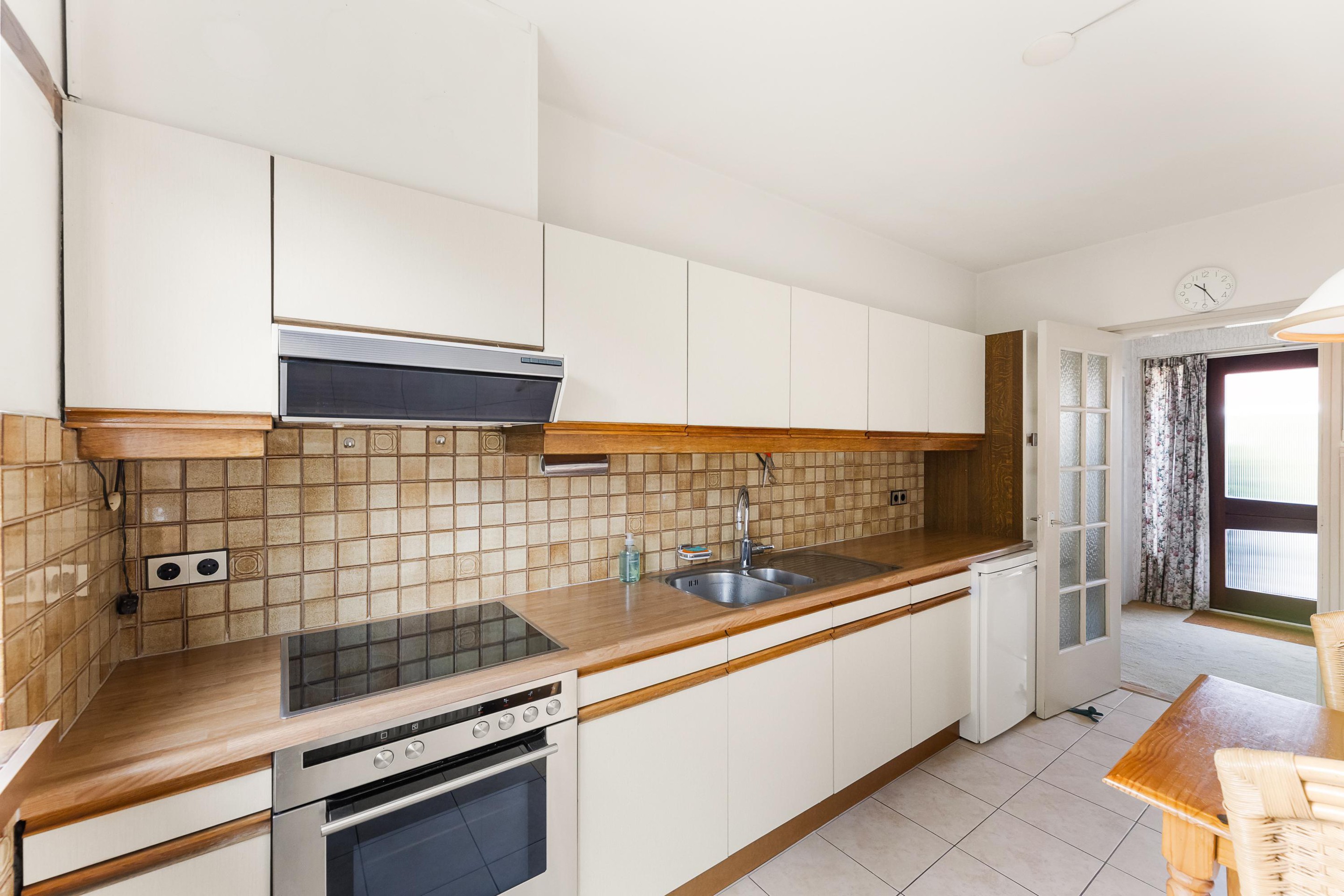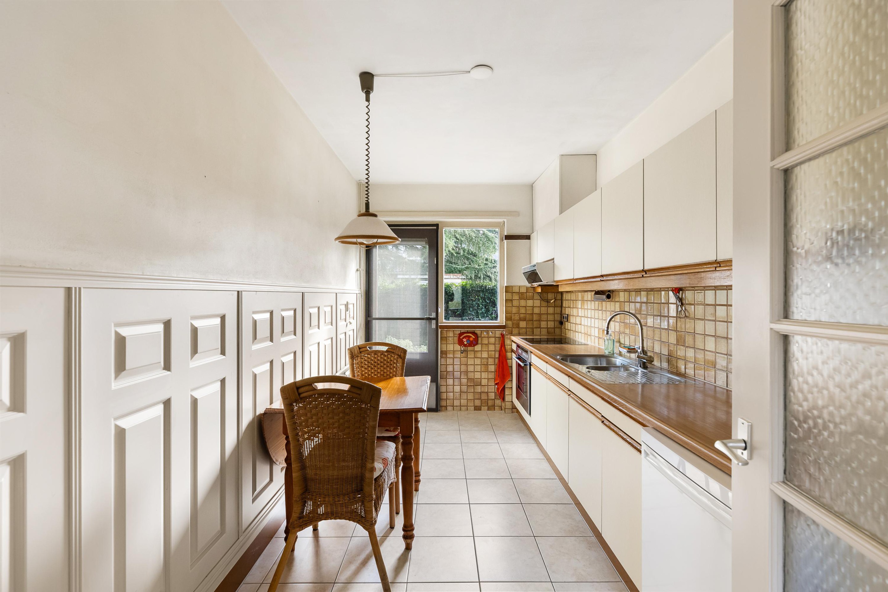 Naast de woonkamer is de gesloten keuken te vinden. De keuken heeft een functioneel karakter en via de tuindeur in de keuken bereikt u de tuin.