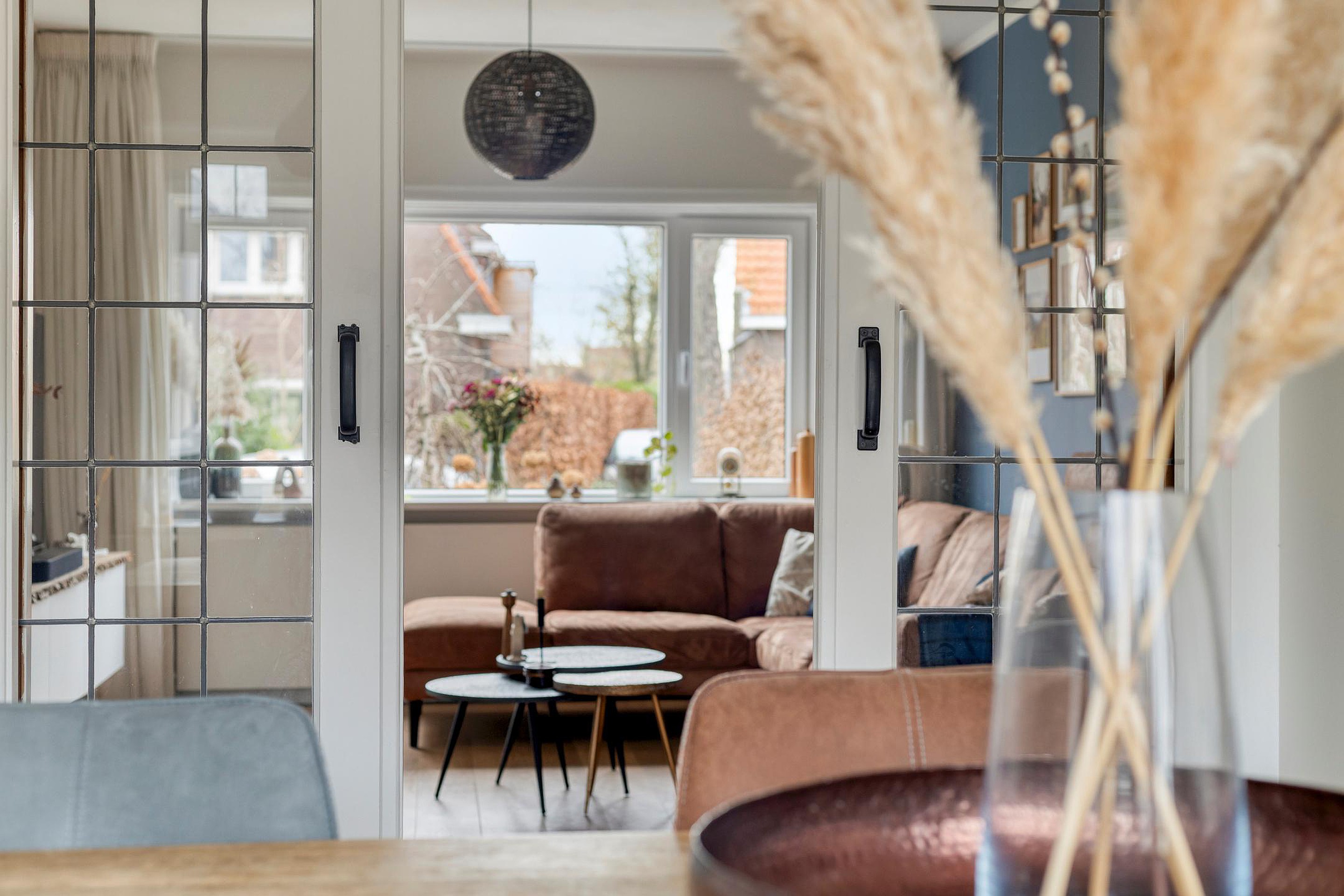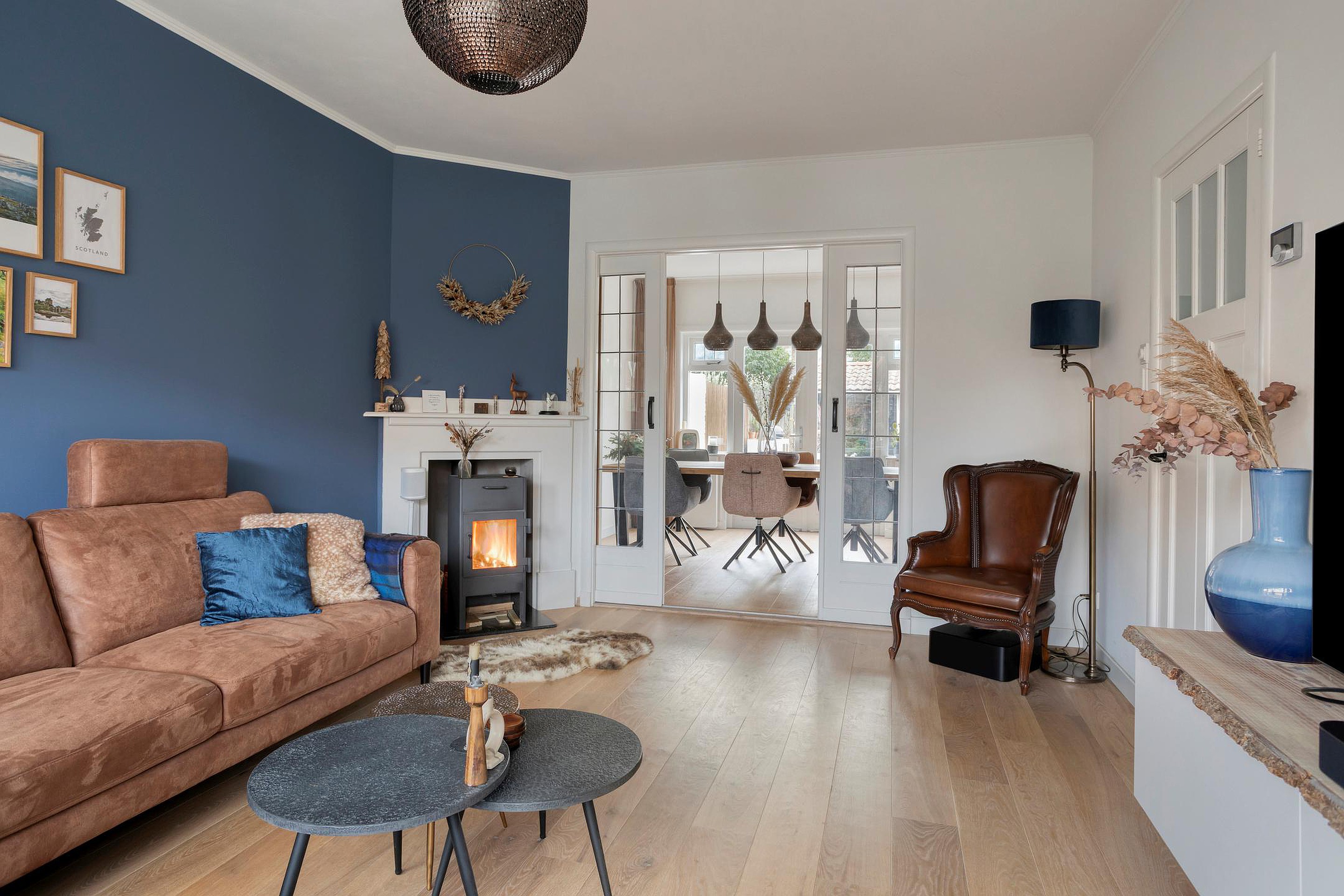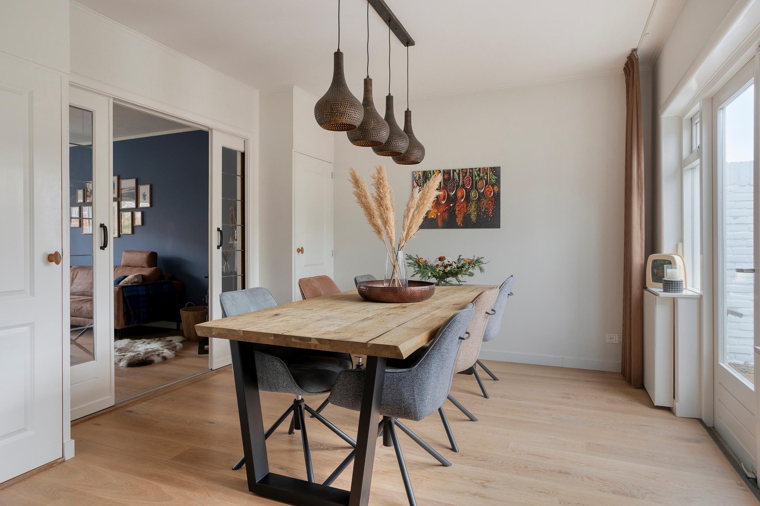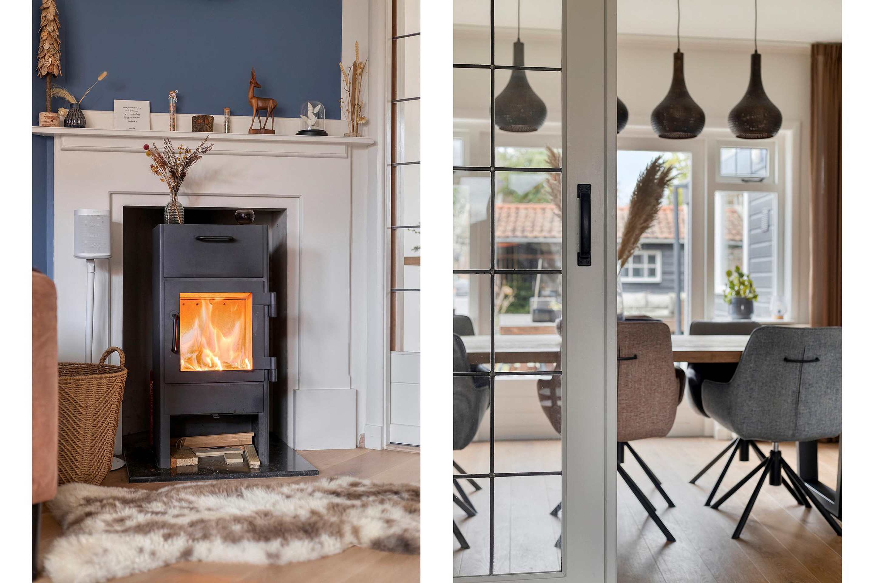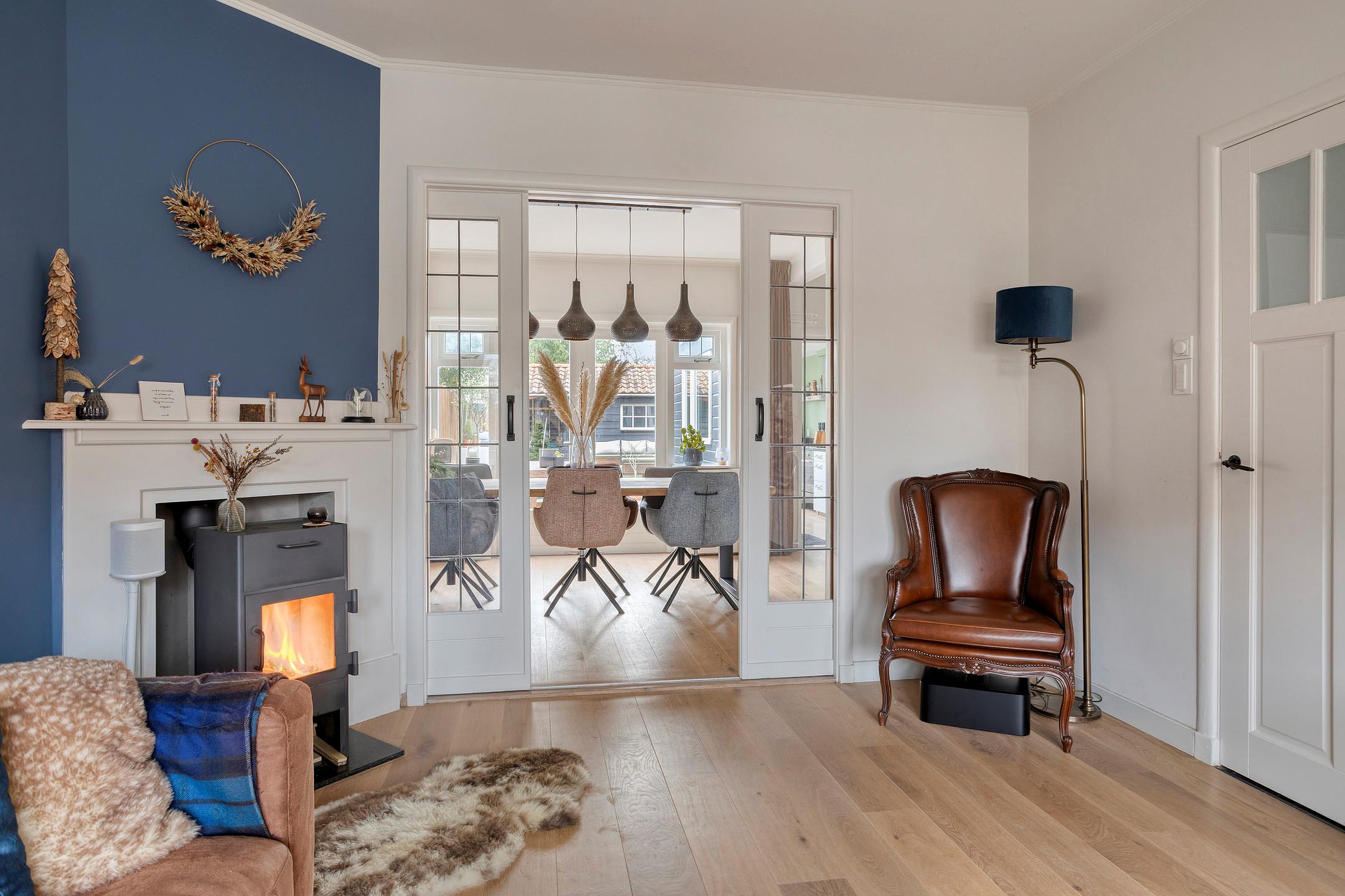 Vanuit de hal bereikt u de woonkamer met karakteristieke en-suite indeling. Aan de voorzijde bevindt zich de royale woonkamer met veel lichtinval en een warme, sfeervolle uitstraling, mede dankzij de houtkachel. Via de schuifdeuren komt u aan de achterzijde in het eetgedeelte, waar ruimte is voor een grote eettafel.