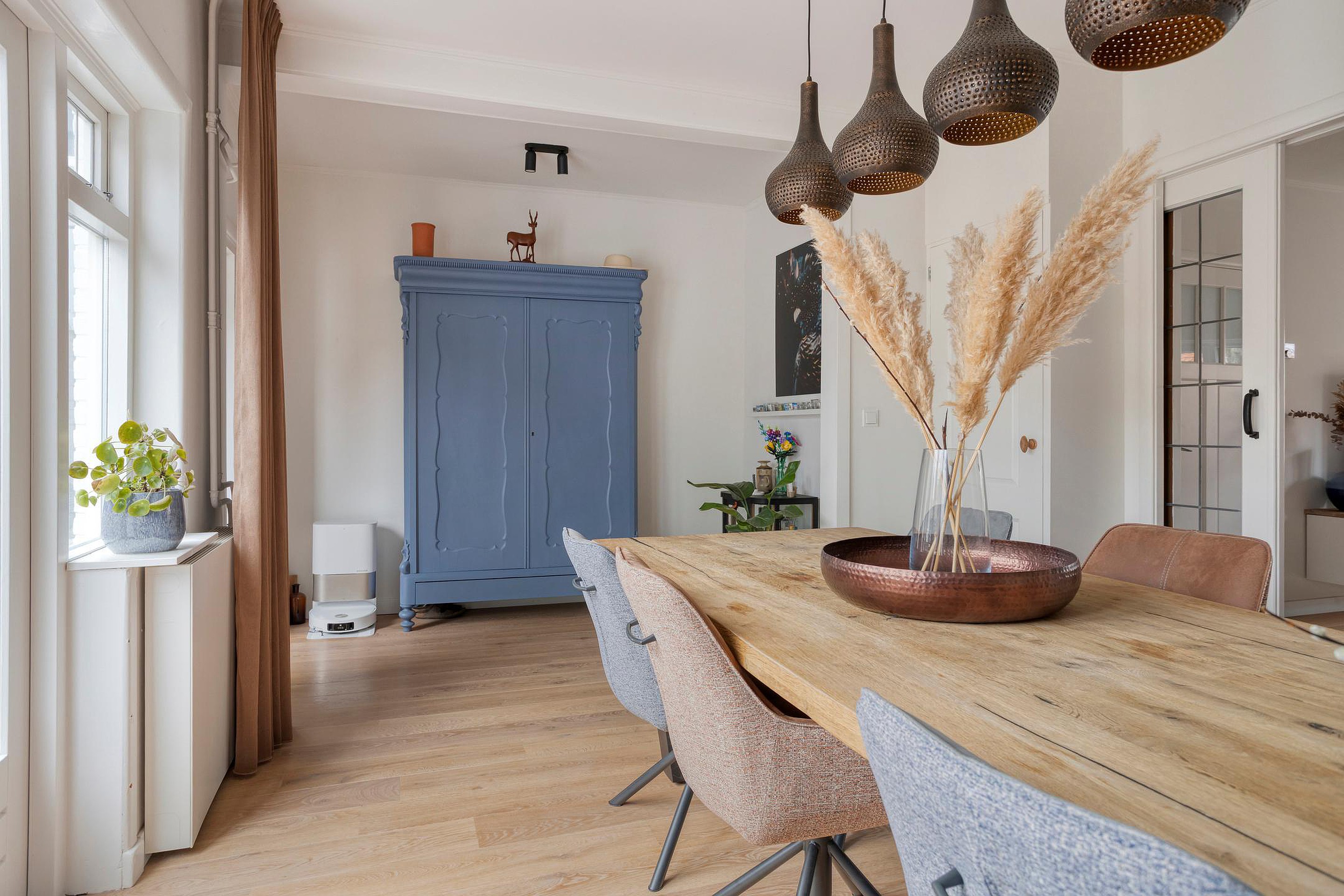De begane grond is afgewerkt met een houten vloer, wat zorgt voor een warme uitstraling.