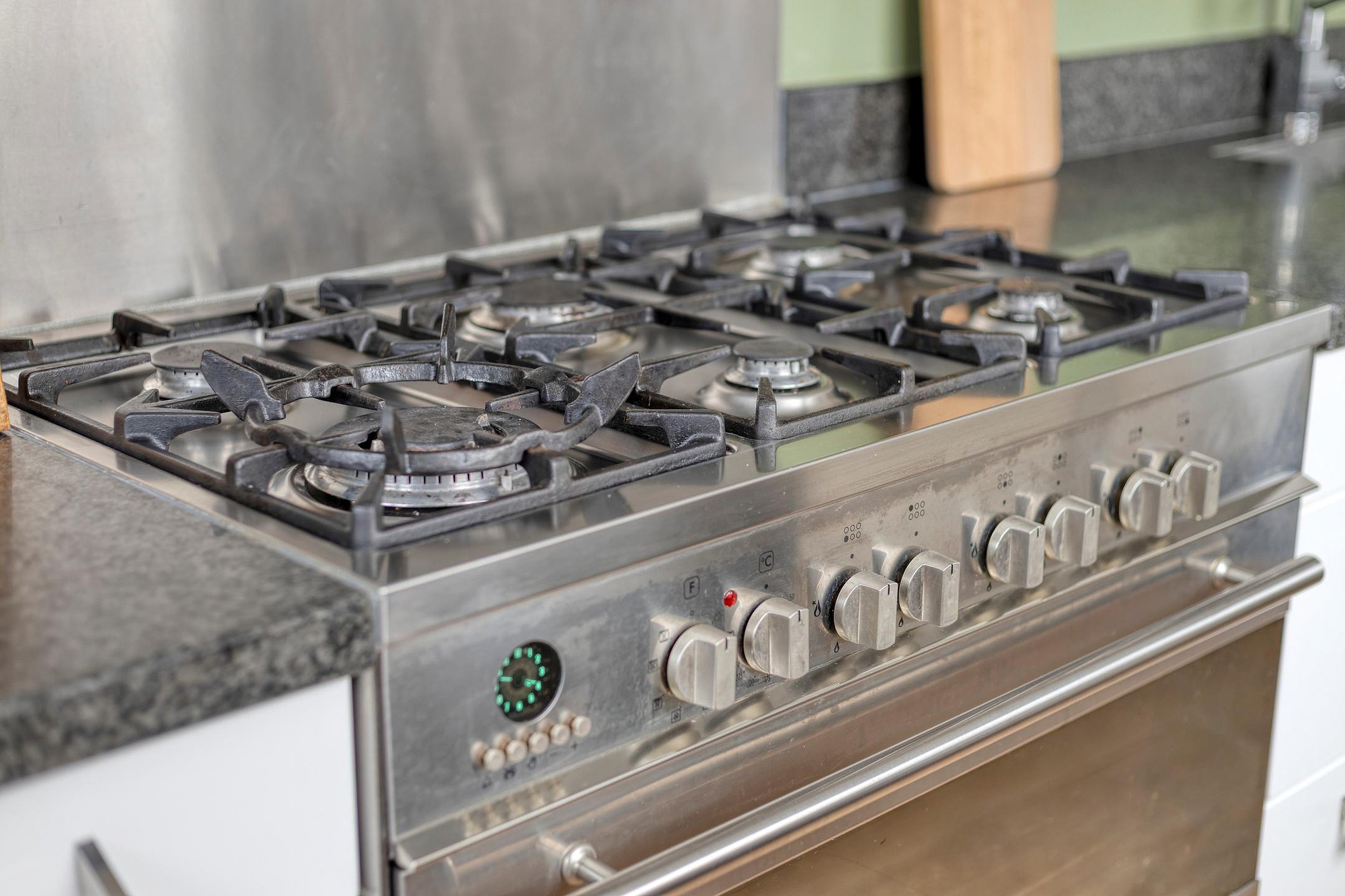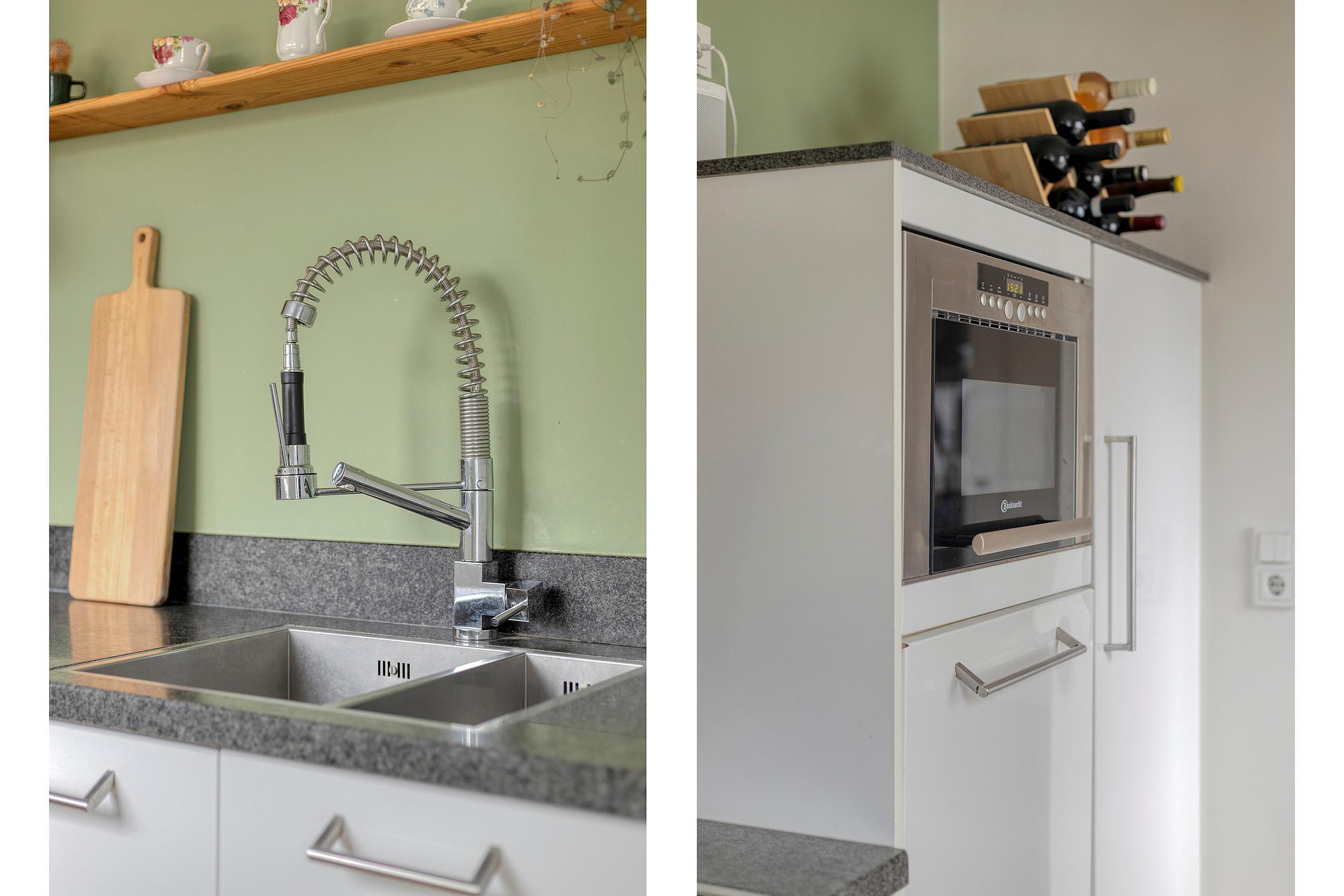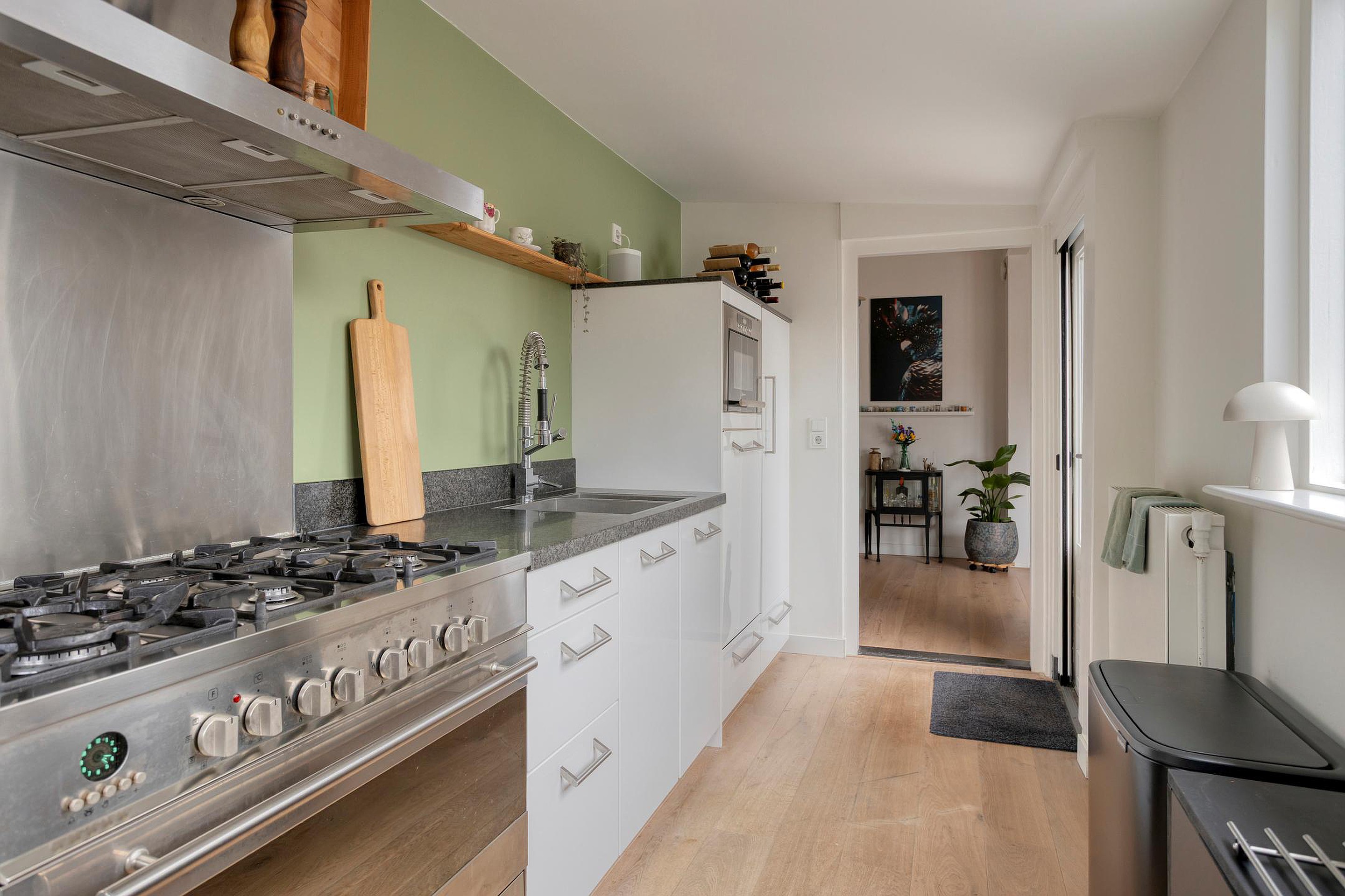 Aansluitend bevindt zich de halfopen keuken, uitgevoerd in een nette opstelling met witte kasten en een zwart werkblad. De keuken is voorzien van diverse inbouwapparatuur, waaronder een vaatwasser, een fornuis met 6 pitten, een afzuigkap en een combi-koelkast met vriezer. Zowel vanuit de keuken als vanuit het eetgedeelte heeft u directe toegang tot de tuin, waardoor binnen en buiten mooi in elkaar overlopen.