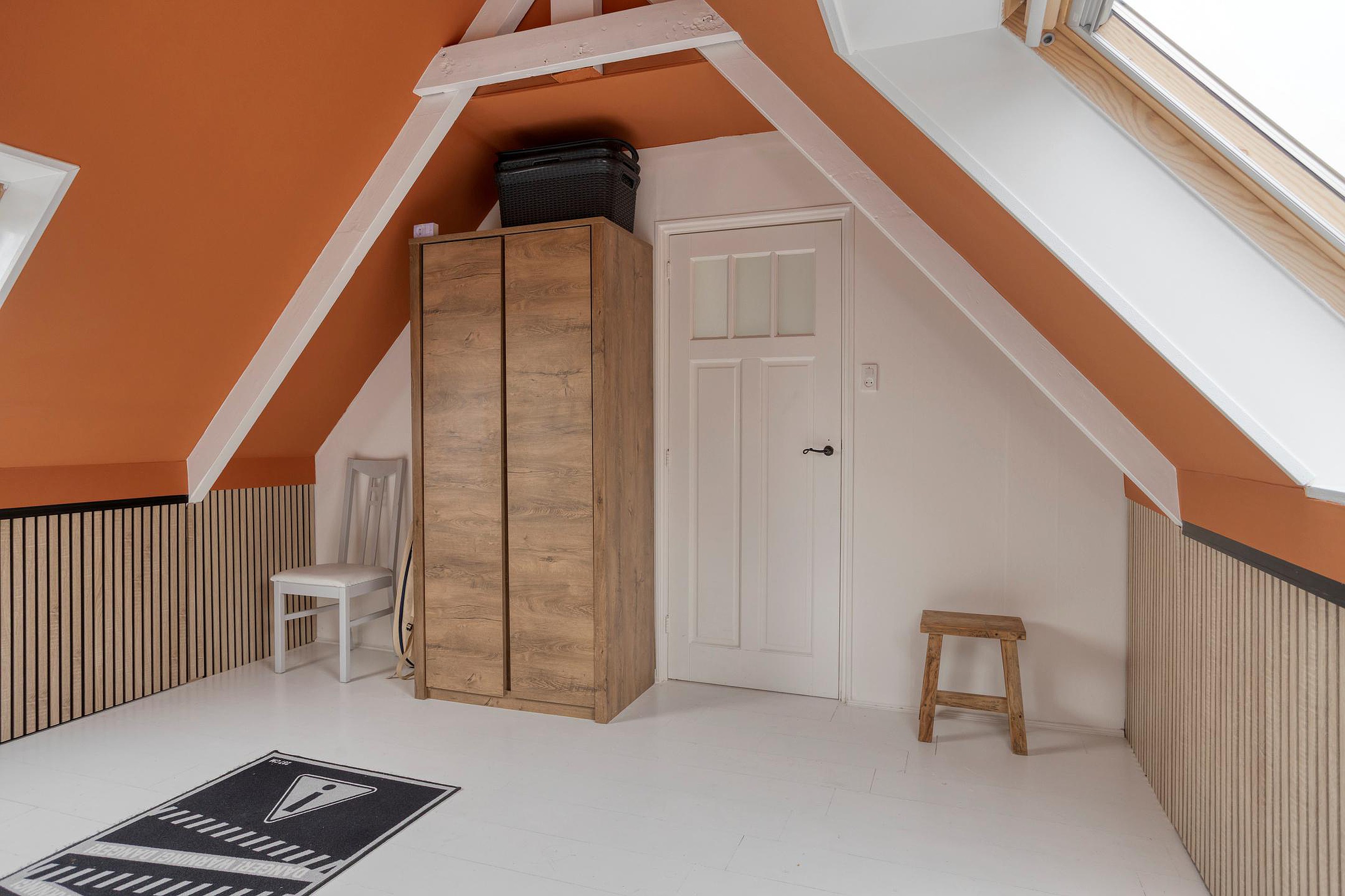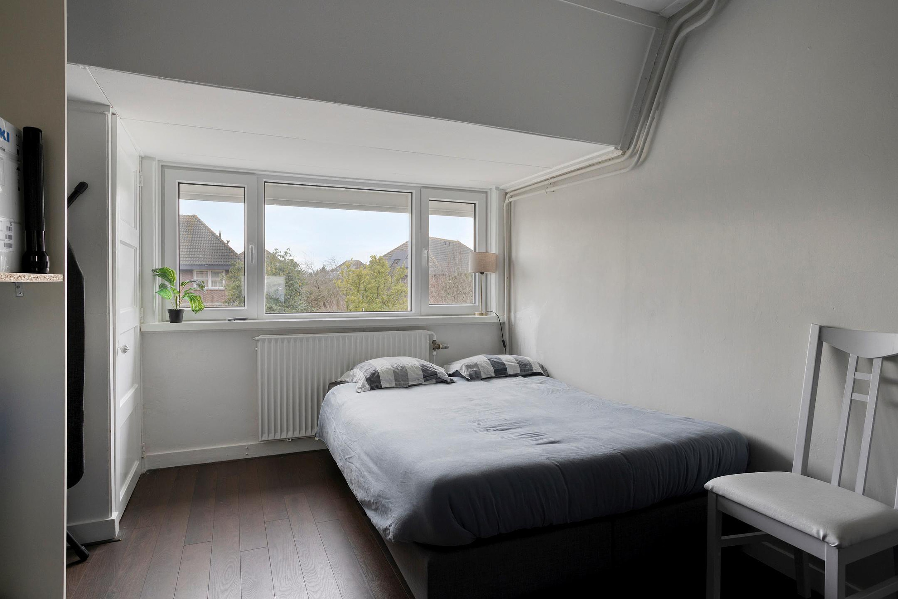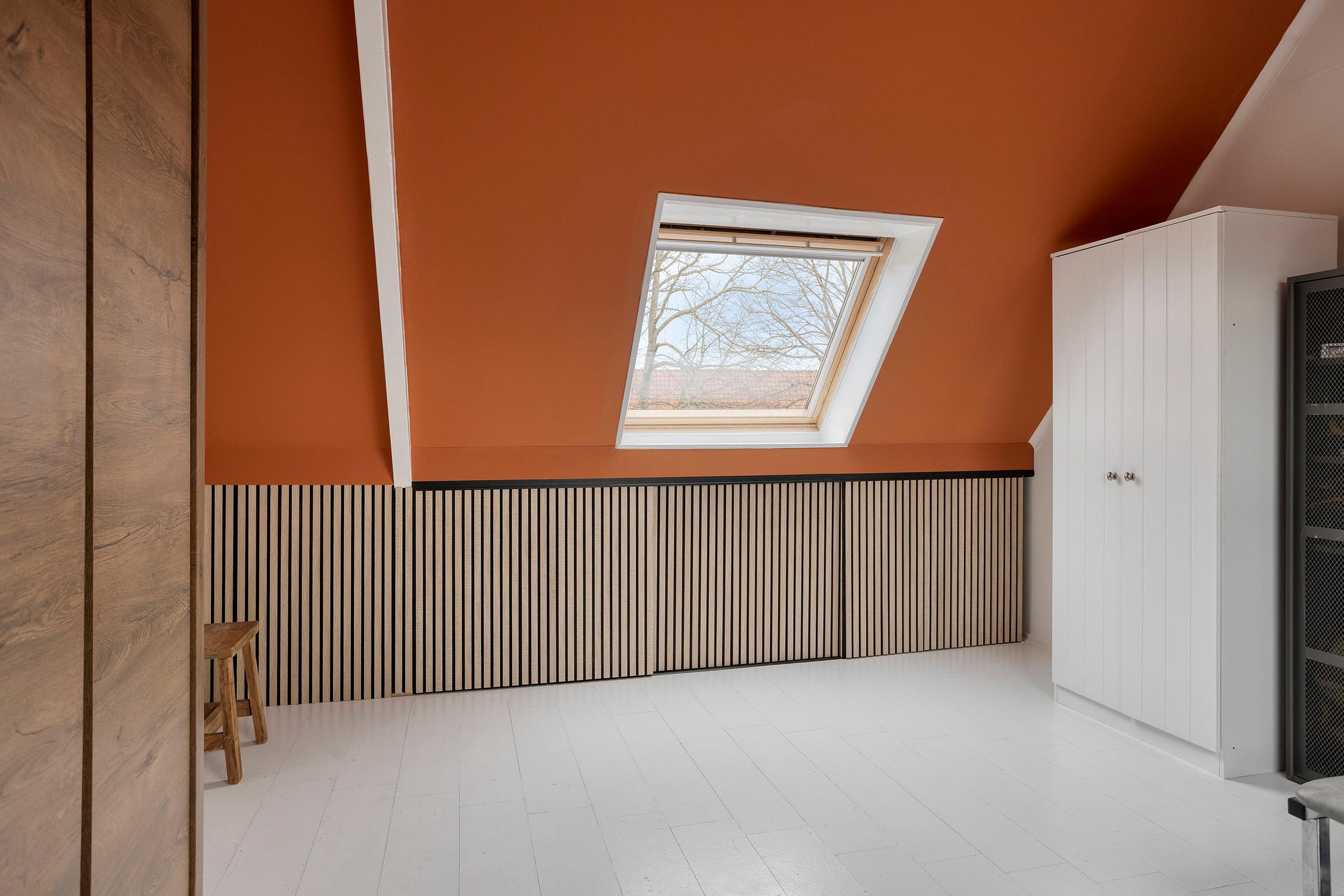De ruime slaapkamer is voorzien van een vaste kast/bergruimte en is netjes afgewerkt met akoestische wandpanelen, wat zorgt voor een rustige en aangename sfeer. Aan beide kanten van de kamer is een dakraam, waardoor er veel natuurlijk licht binnenvalt.