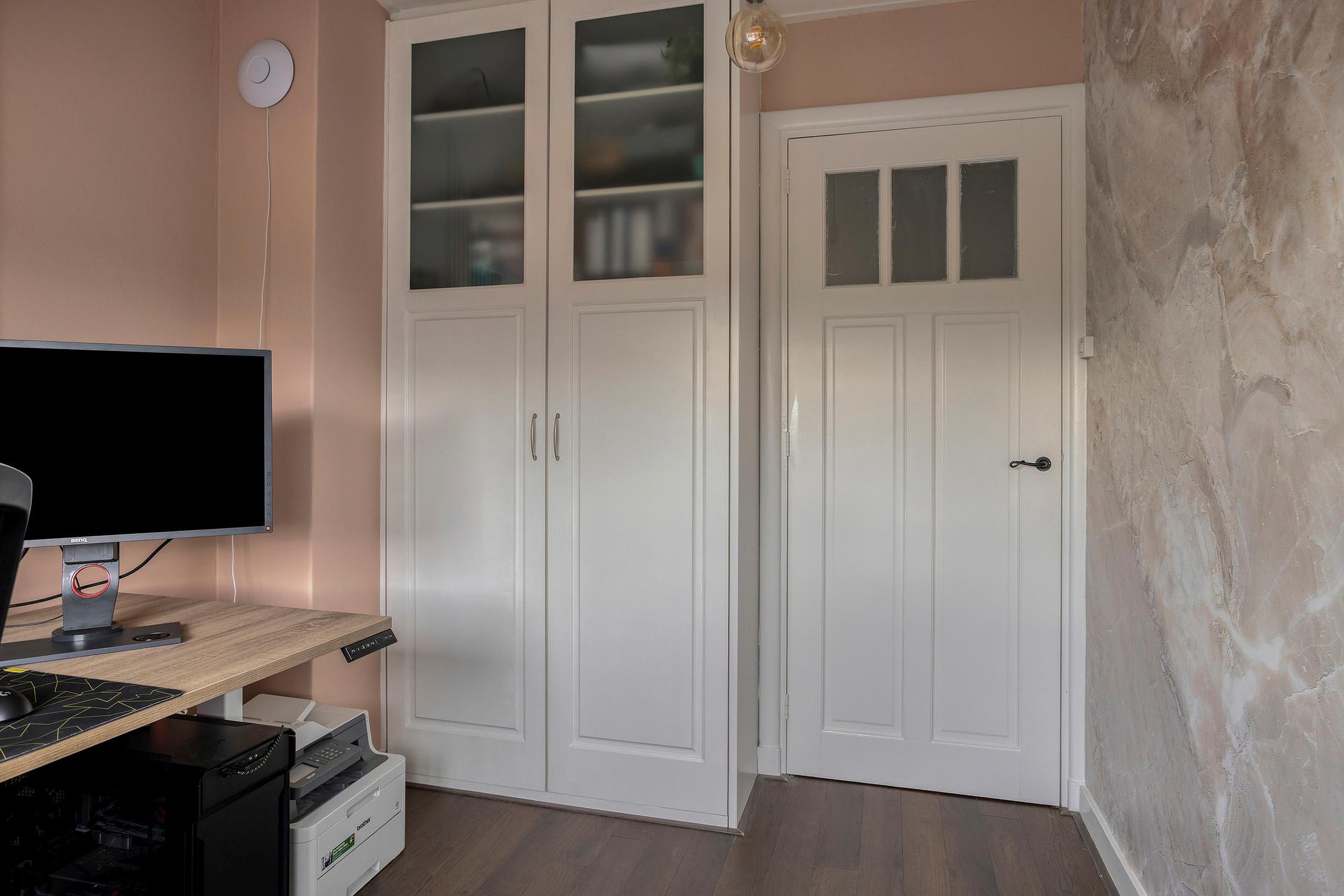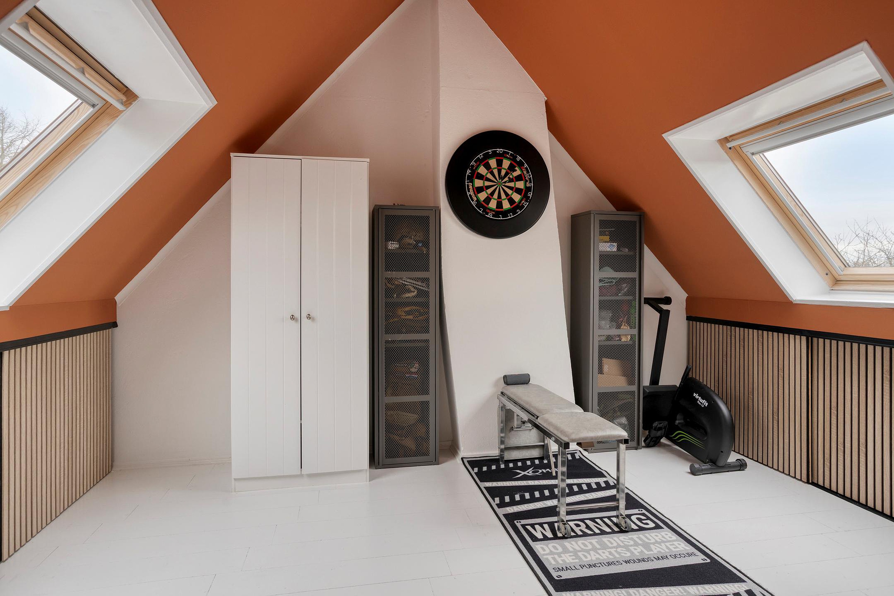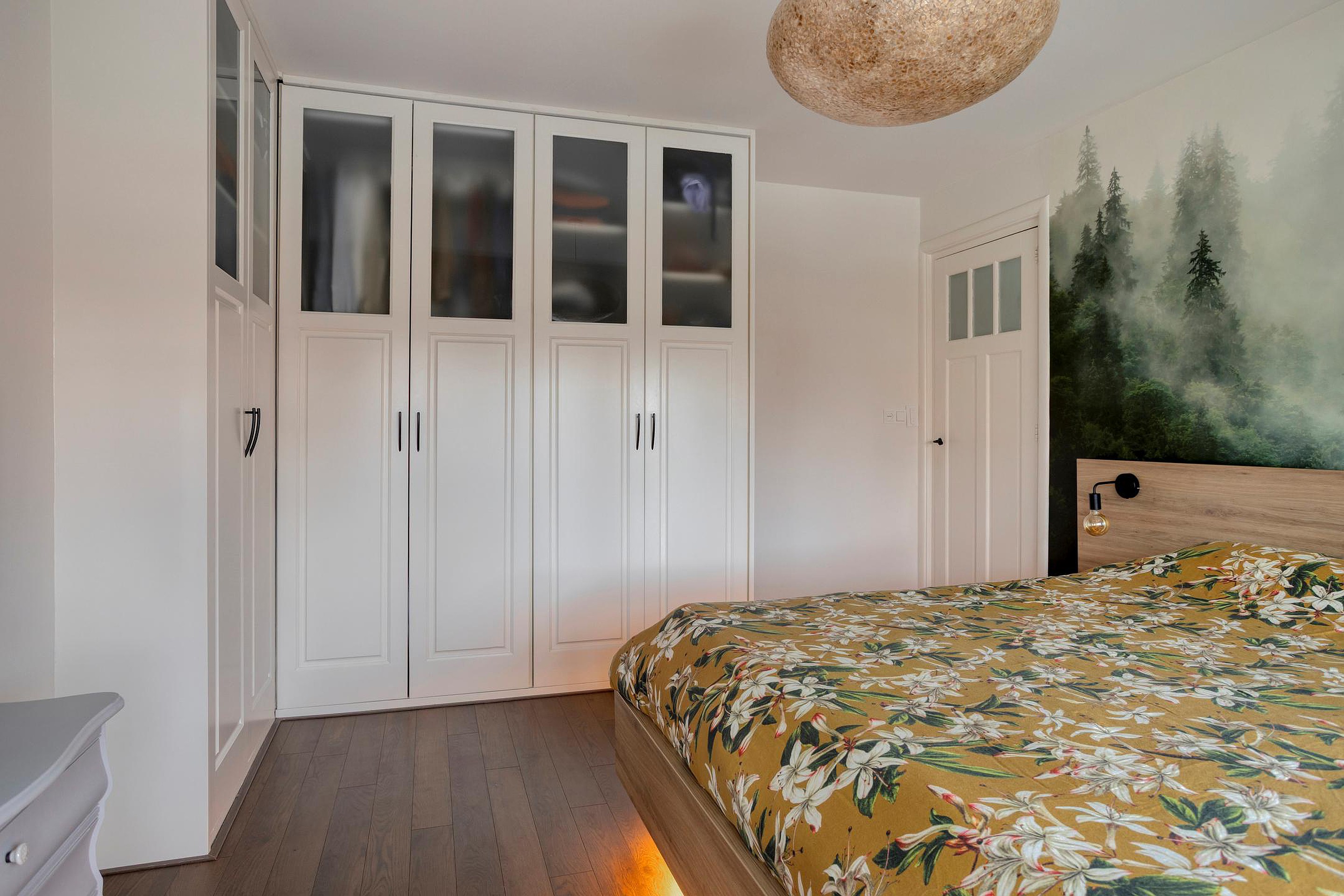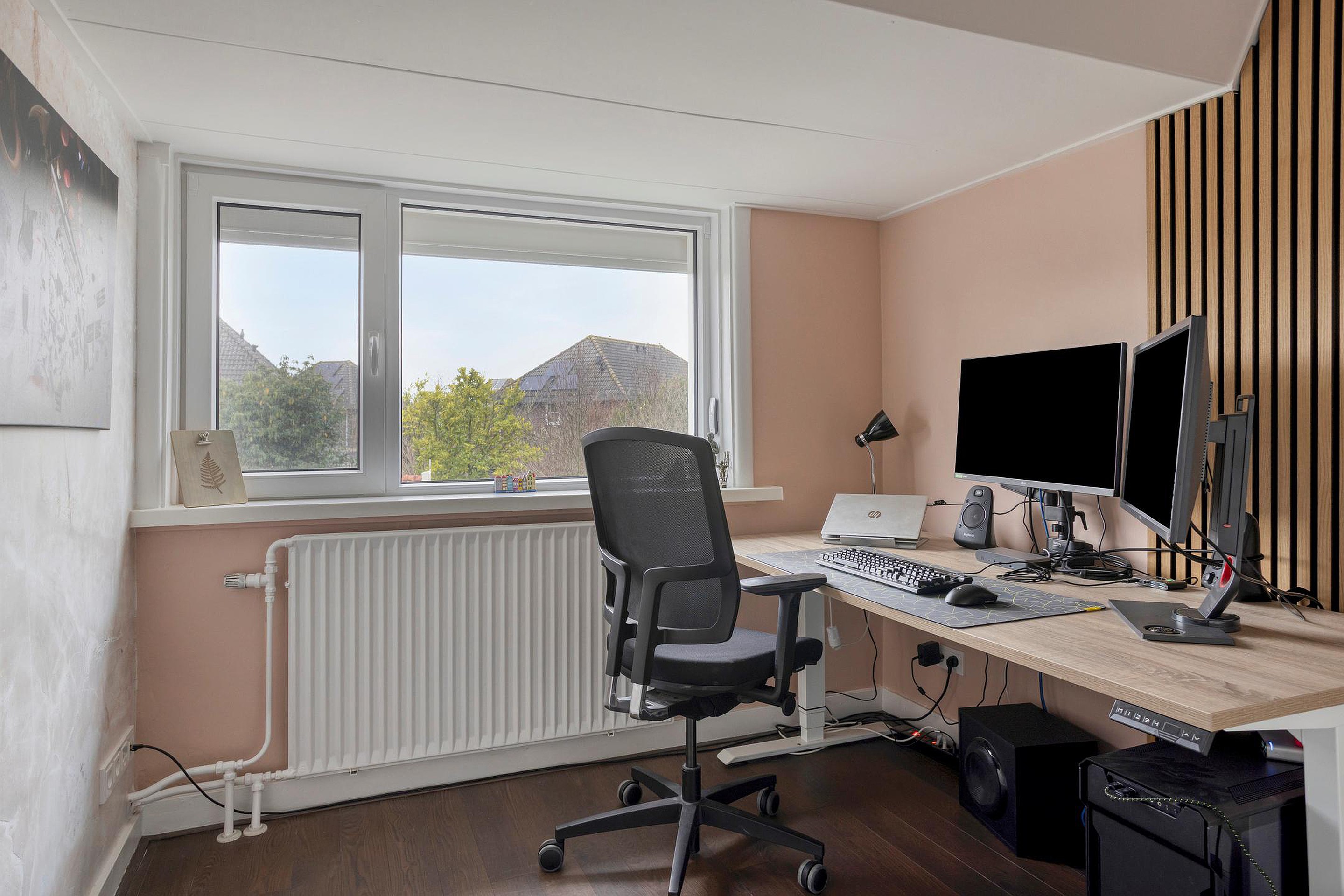 De ruime slaapkamer is voorzien van een vaste kast/bergruimte en is netjes afgewerkt met akoestische wandpanelen, wat zorgt voor een rustige en aangename sfeer. Aan beide kanten van de kamer is een dakraam, waardoor er veel natuurlijk licht binnenvalt.