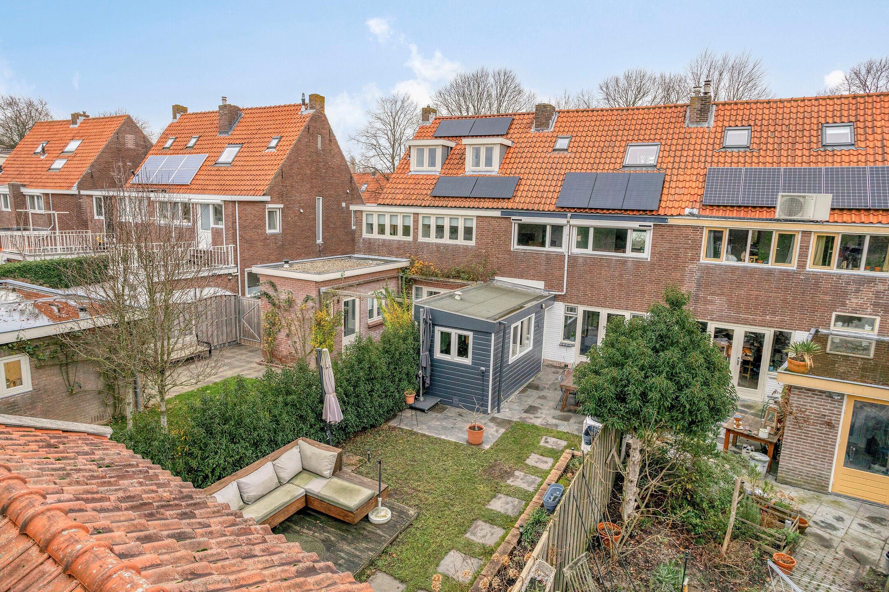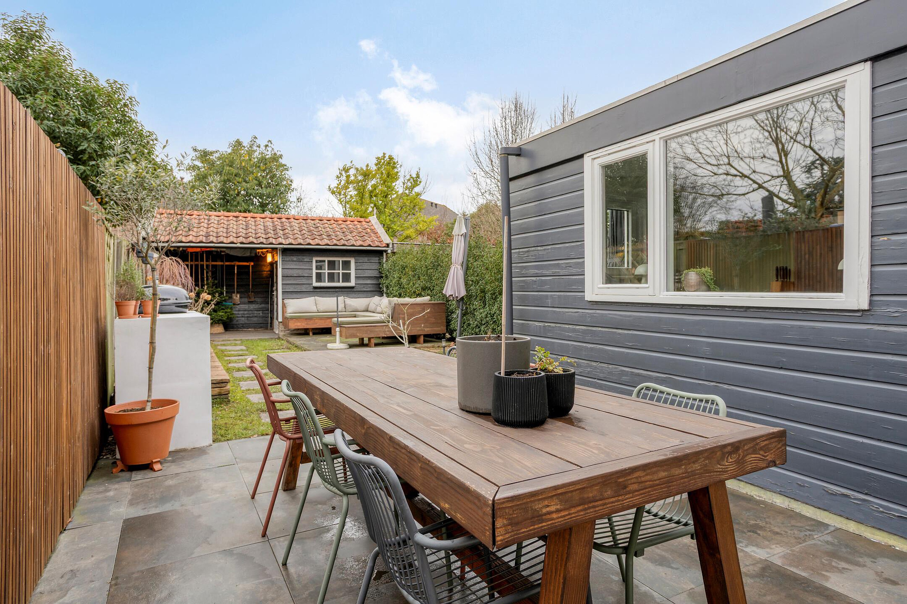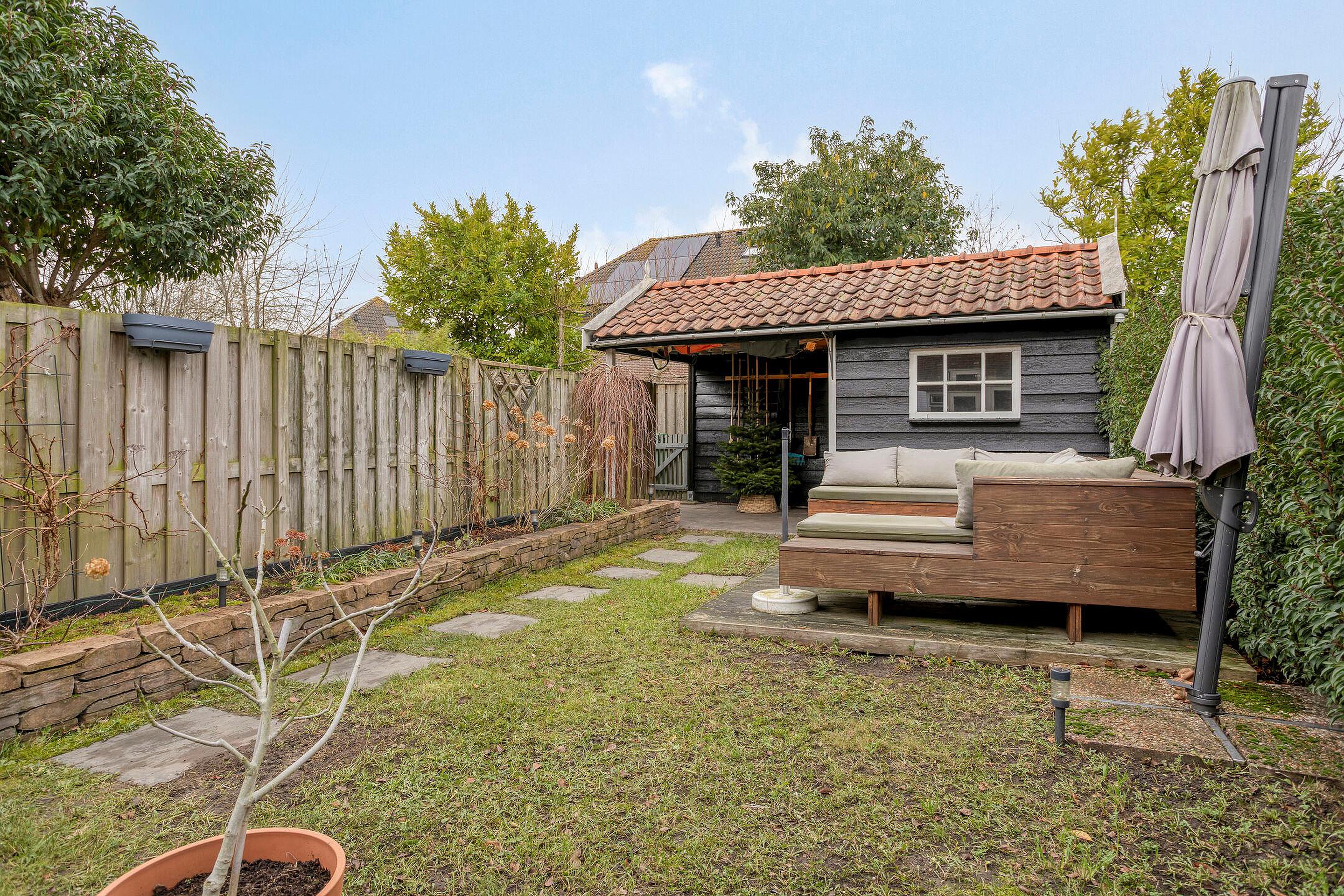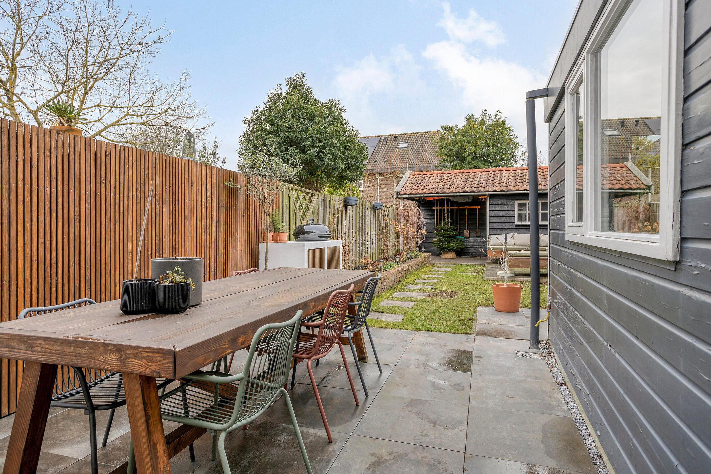 De woning beschikt over een ruime en diepe achtertuin met een goede bezonning, waar u volop ruimte heeft om een gezellige zithoek te creëren. Daarnaast is er een vrijstaande schuur met overkapping, ideaal voor het plaatsen van fietsen of het opbergen van gereedschap.