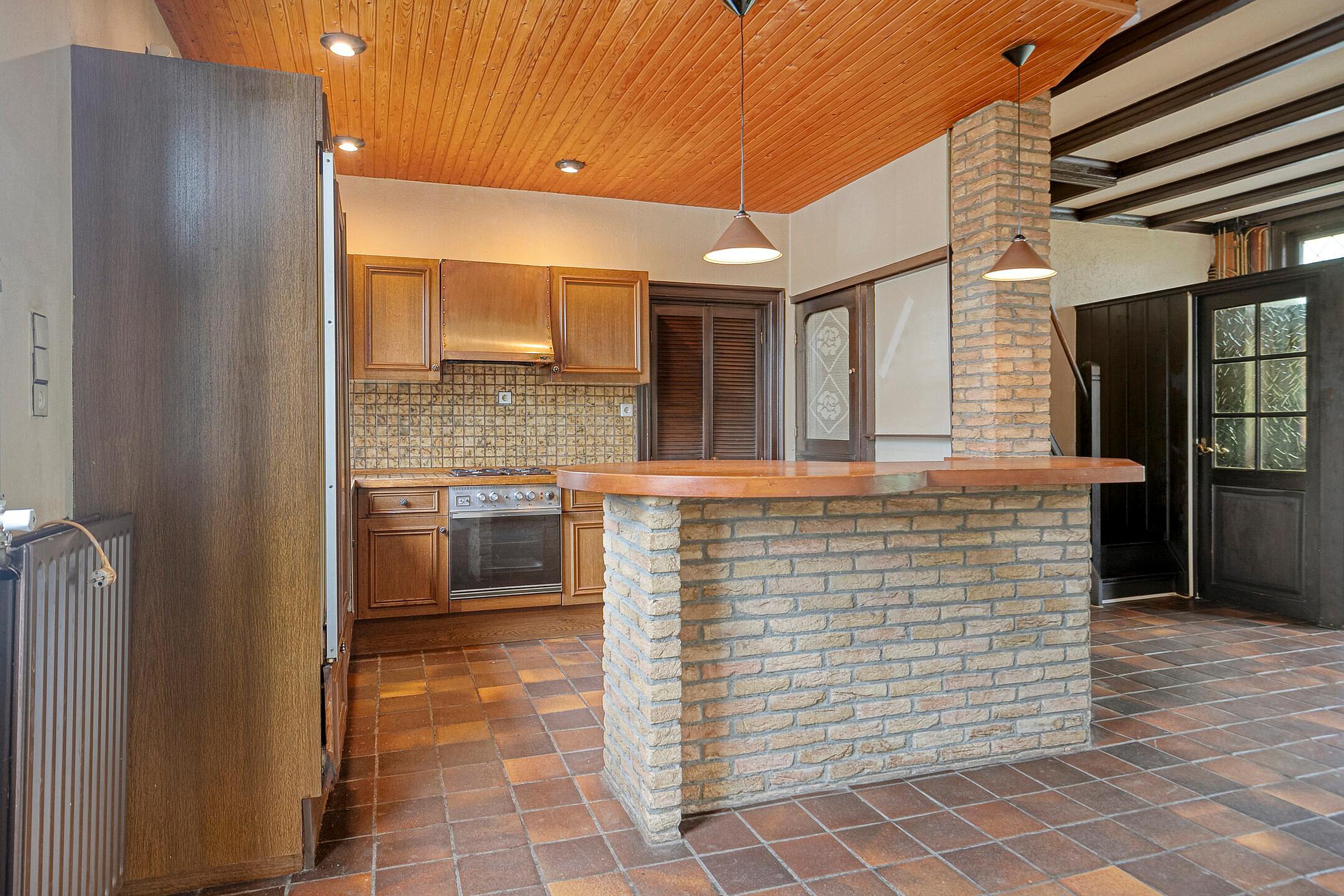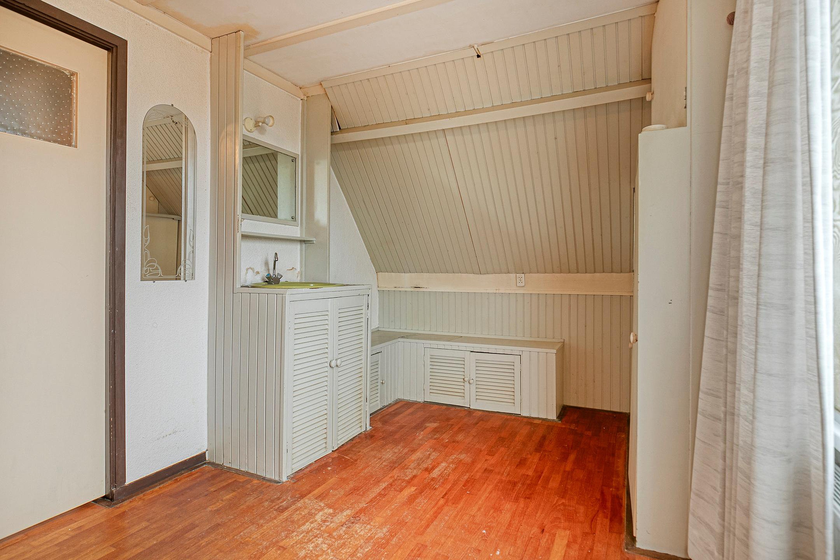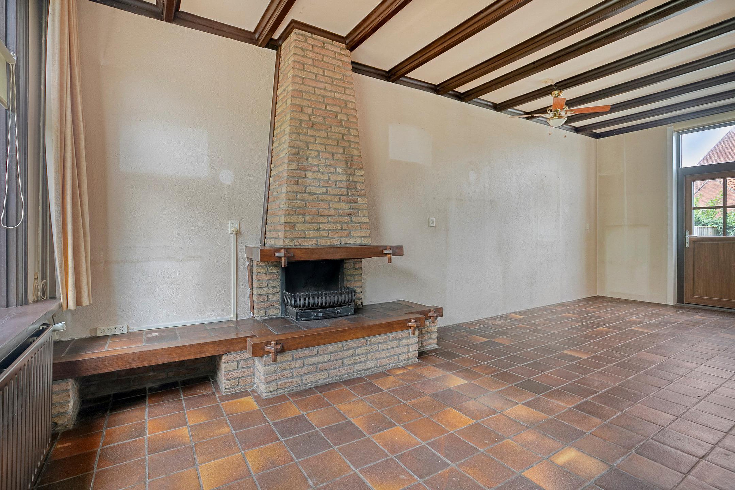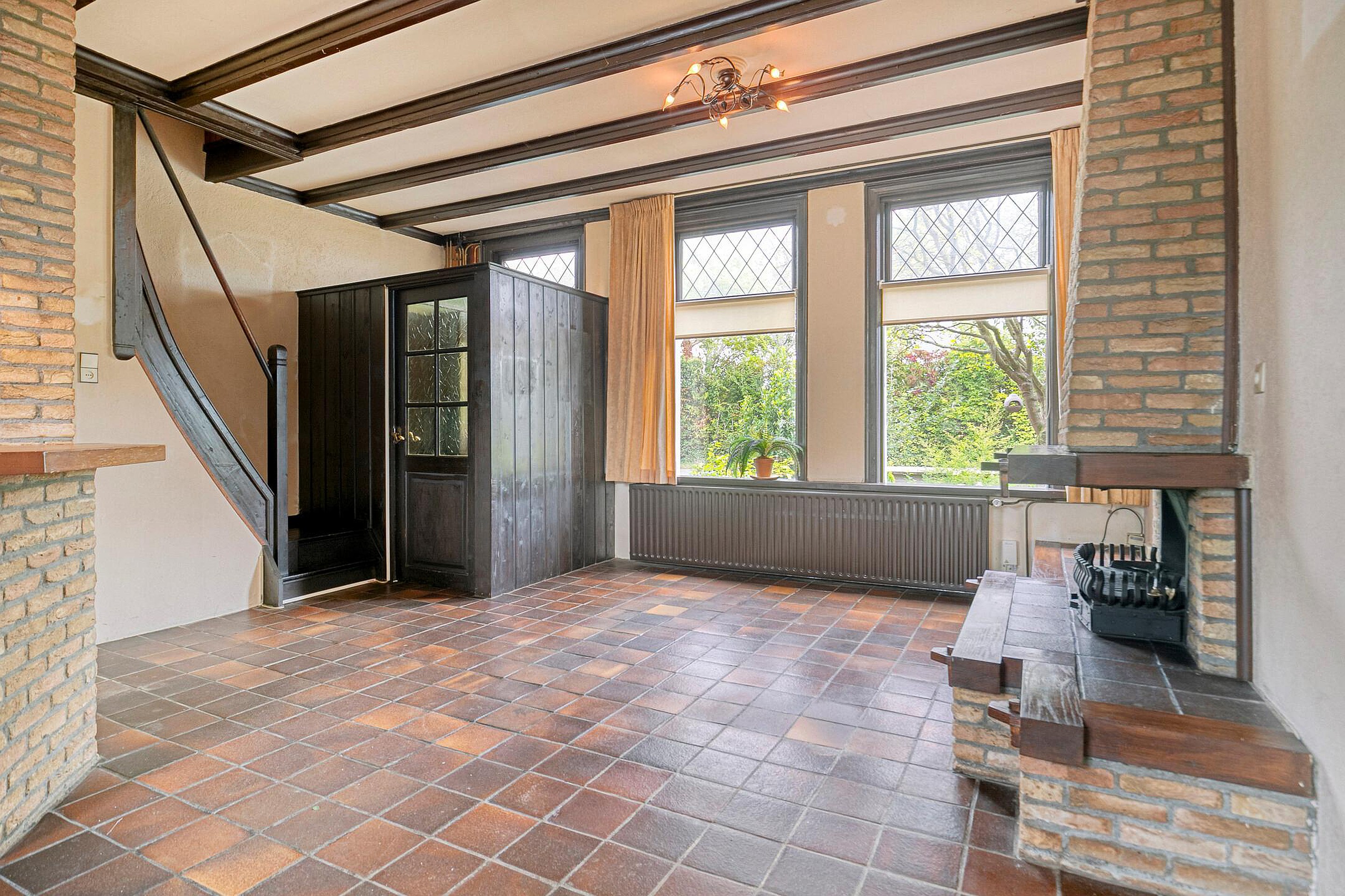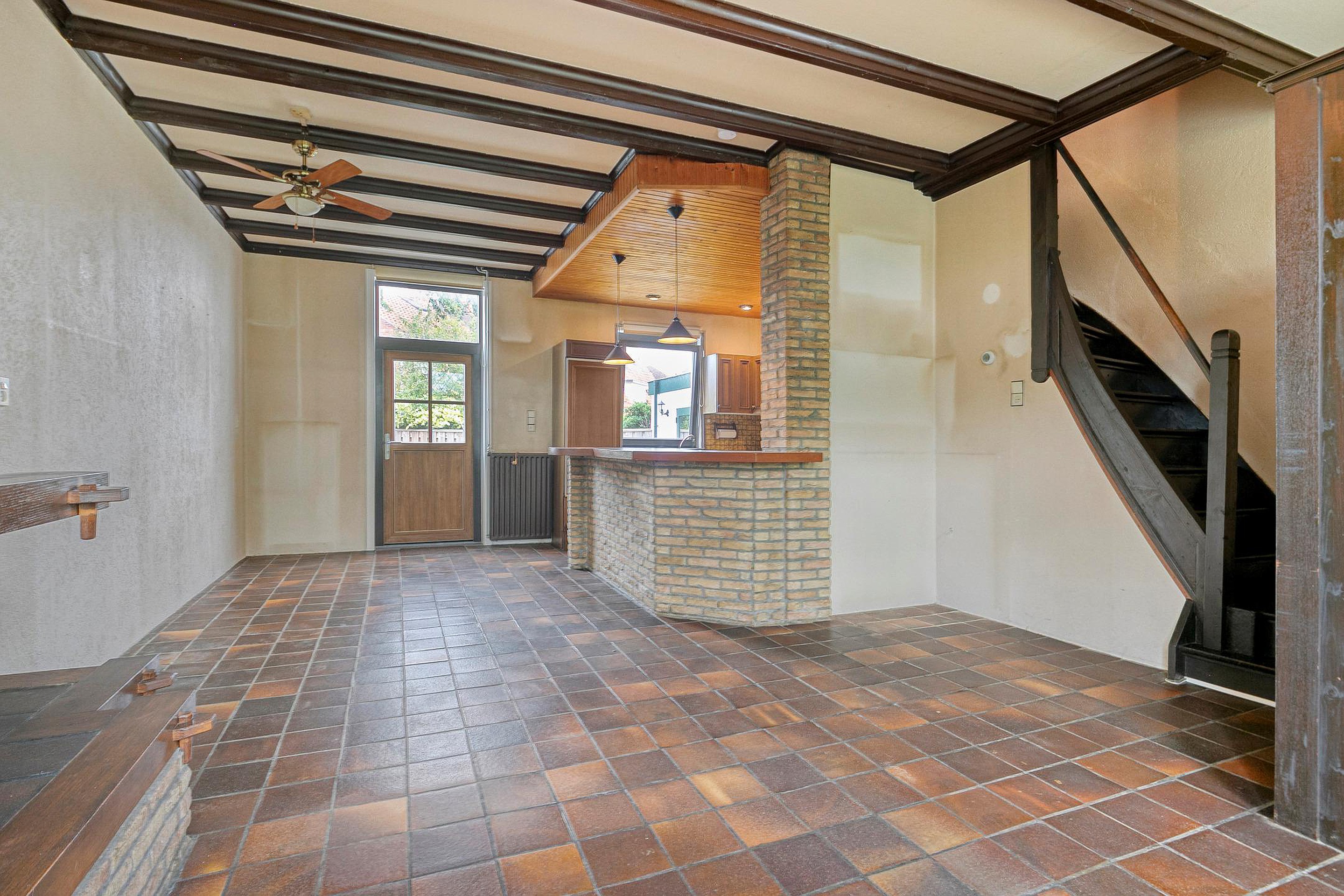 Begane grond Entree, halletje met meterkast. Woonkamer met open haard en de open trap naar de verdieping. De keuken aan de achterzijde (tuingericht) is open, de inrichting van de keuken is gedateerd, maar de ruimte is zeker niet klein te noemen. Er is een vaste kast, praktisch voor de voorraad. Ook is er voldoende ruimte voor een eettafel, met vanuit de keuken een leuk zicht in de achtertuin.