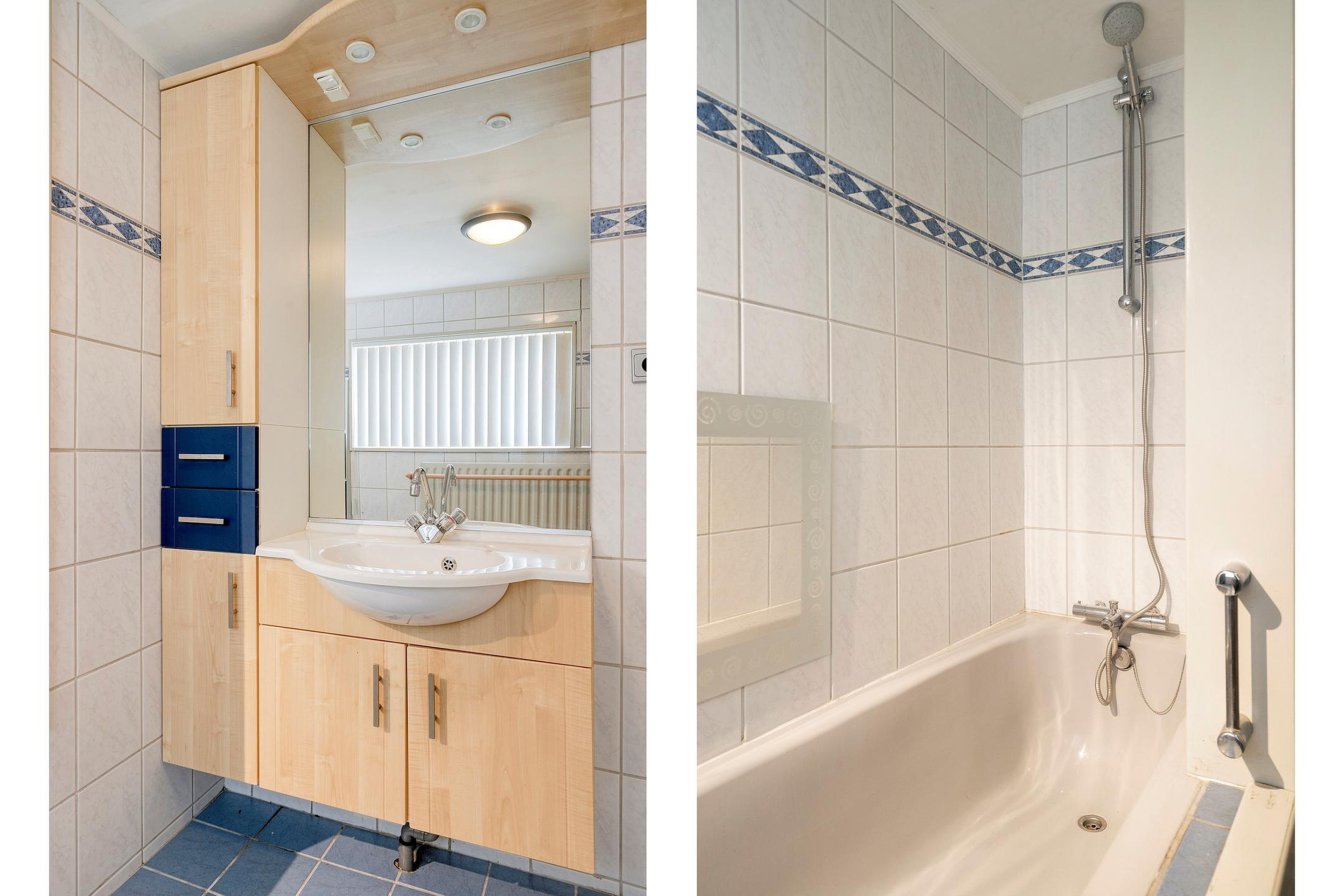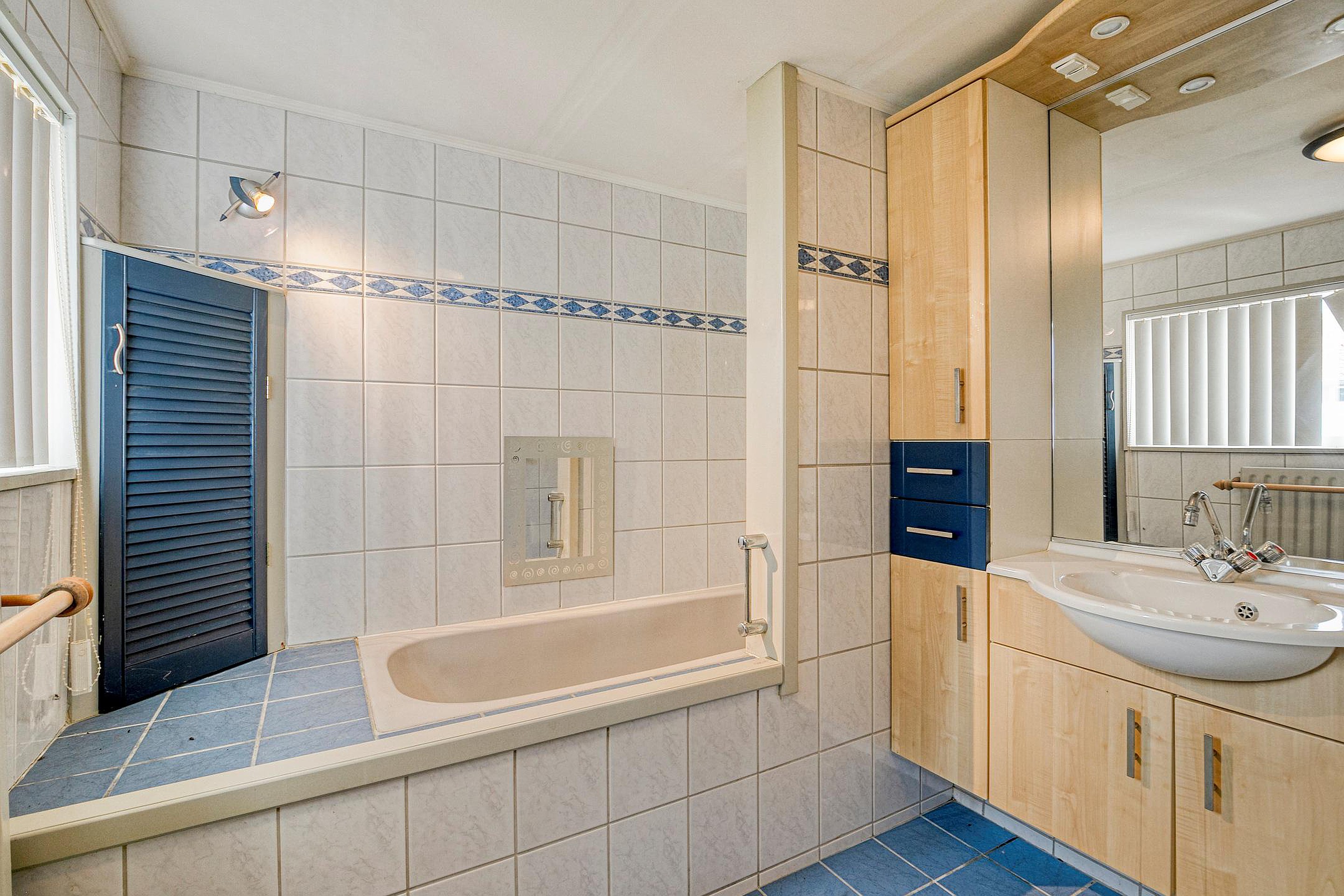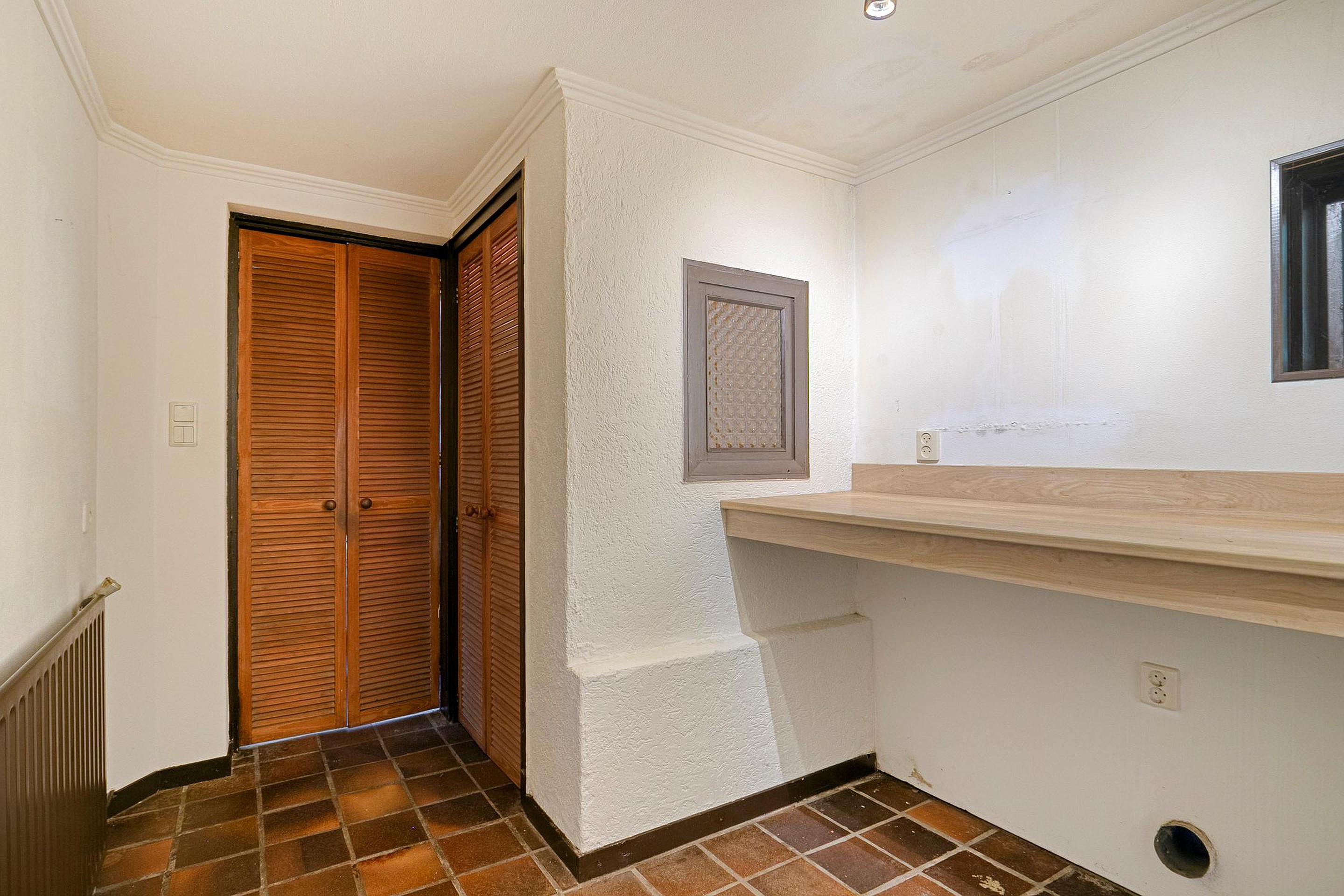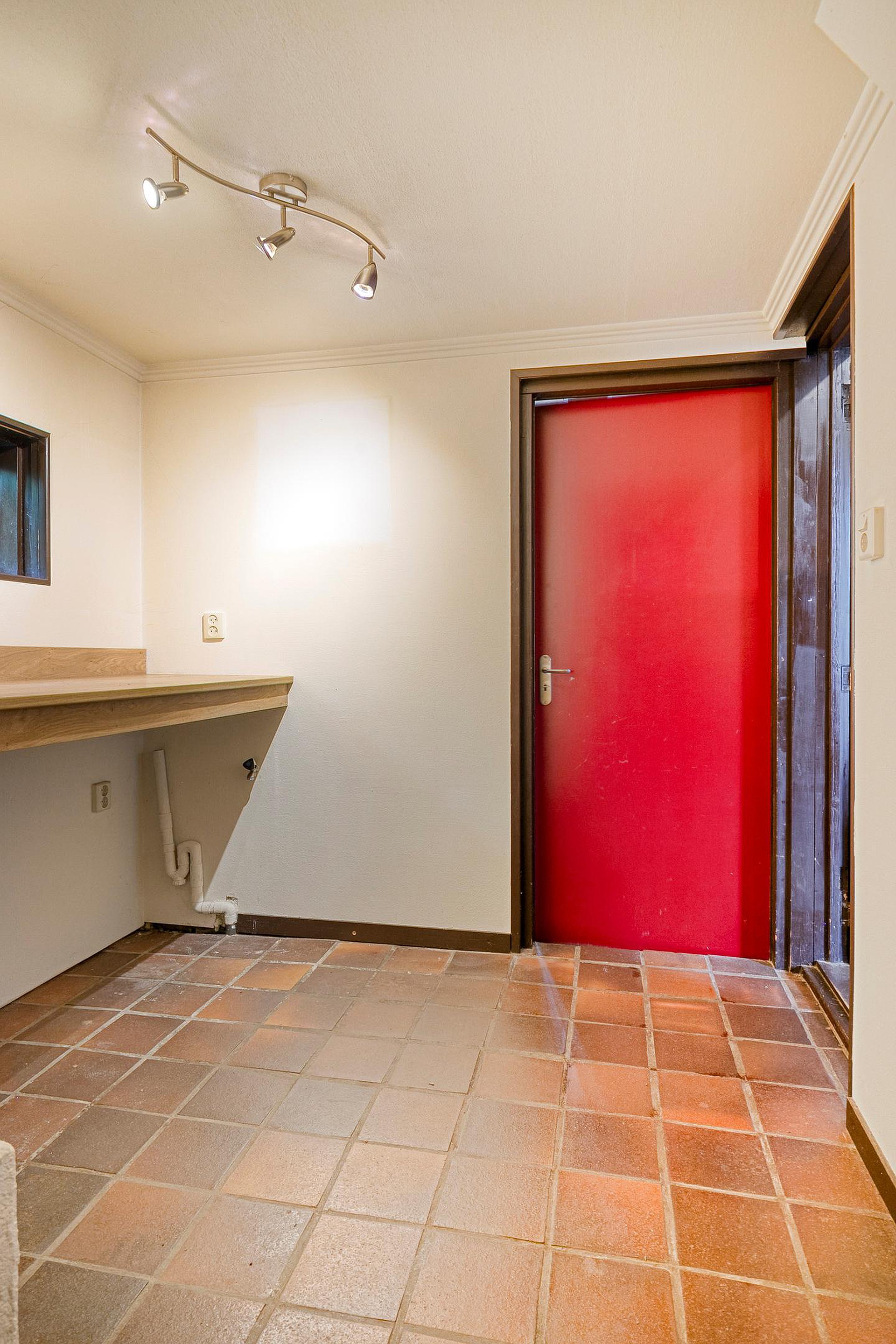 Aansluitend aan de keuken de bijkeuken met ruimte voor de wasmachine en droger. Hier bevindt zich tevens het toilet en de badkamer met wastafel in meubel en ligbad. Er is geen vrije achterom maar dat is wel zo veilig. Fietsen, scooters etc. kunt u in de inpandige berging stallen, de berging is binnendoor bereikbaar maar ook vanaf de voorzijde van de woning.