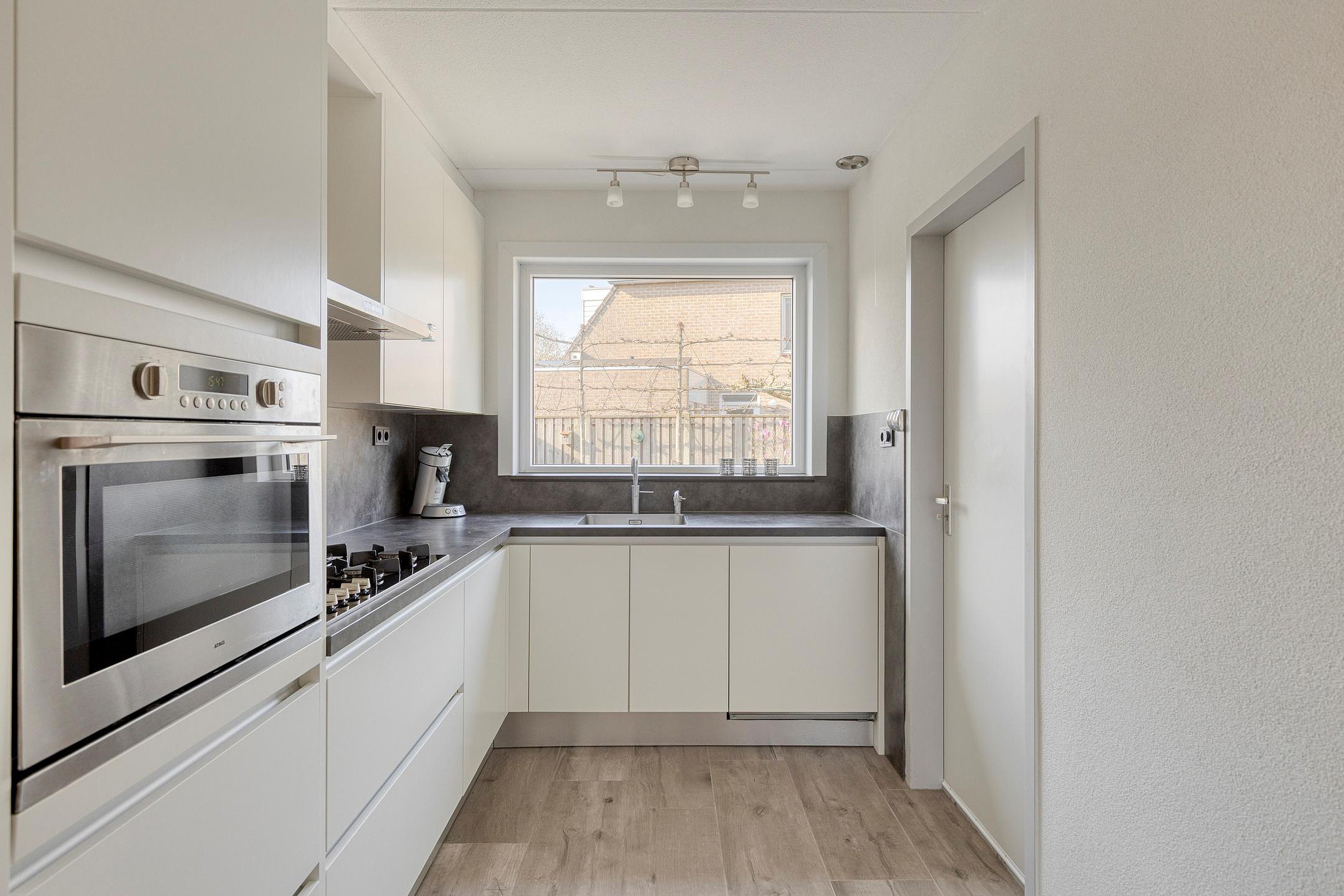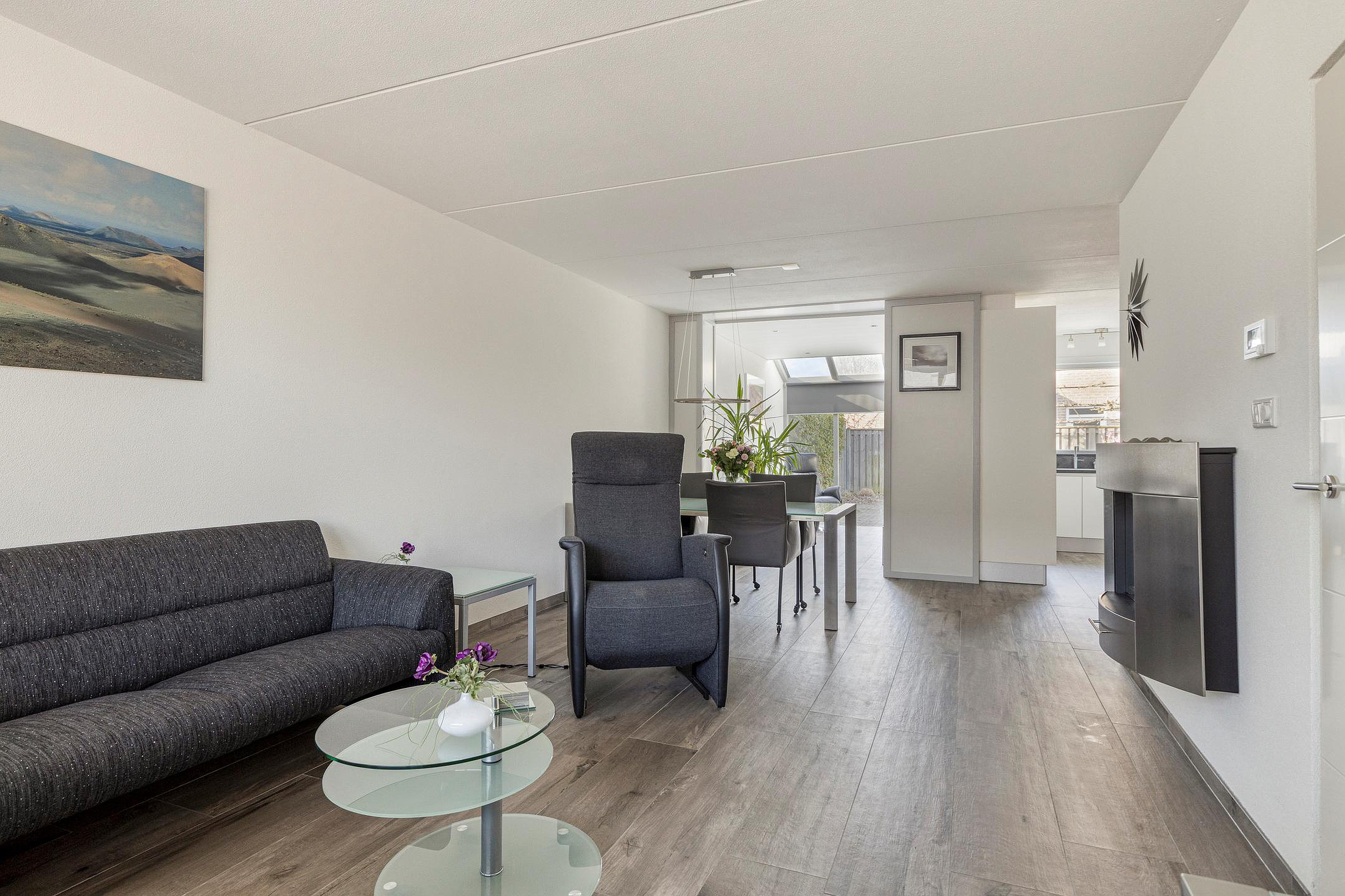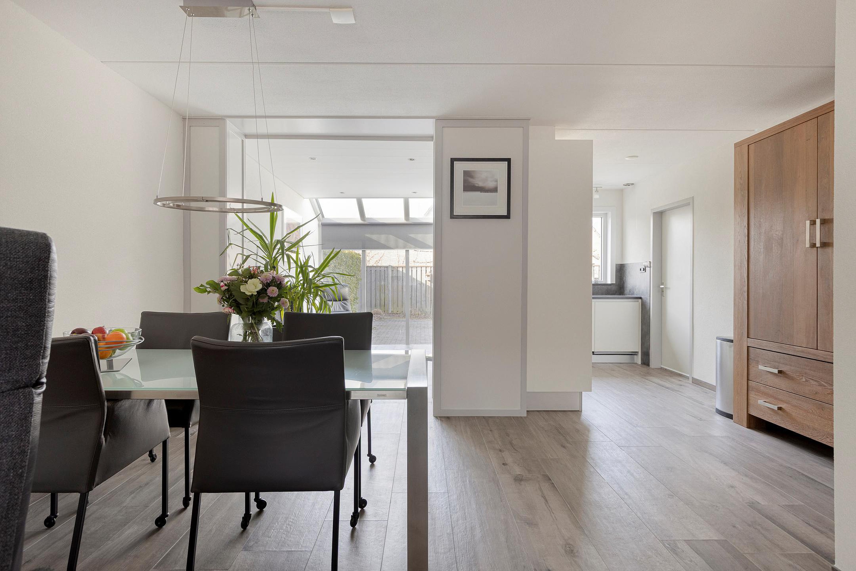 Begane grond Entree, hal met meterkast en vernieuwd toilet met hangreservoir en fonteintje. De woonkamer is heerlijk ruim met een fijne lichtinval. Aan de achterzijde van de woonkamer is een serre aangebouwd, veel glas wat het een zeer fijne ruimte maakt met zicht in eigen achtertuin. De (lichte) open keuken is aan de achterzijde gesitueerd voorzien van een 5-pits gaskookplaat, combi oven/magnetron, afzuigkap, koelkast, vaatwasser en een quooker. In de bijkeuken zijn de wasmachine en droger aansluitingen aanwezig, wat een praktische ruimte. De begane grondvloer is voorzien van een mooie tegel met vloerverwarming.