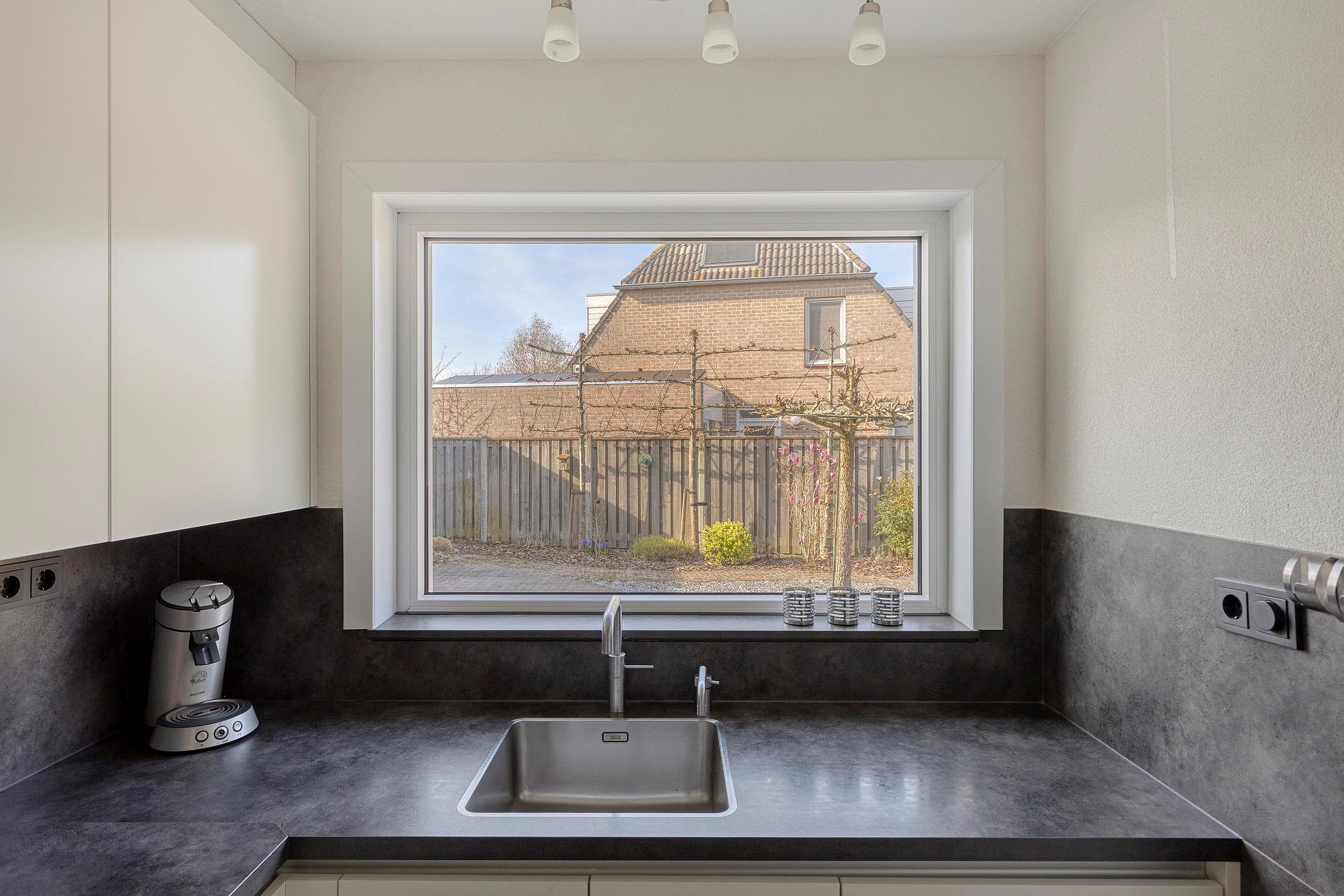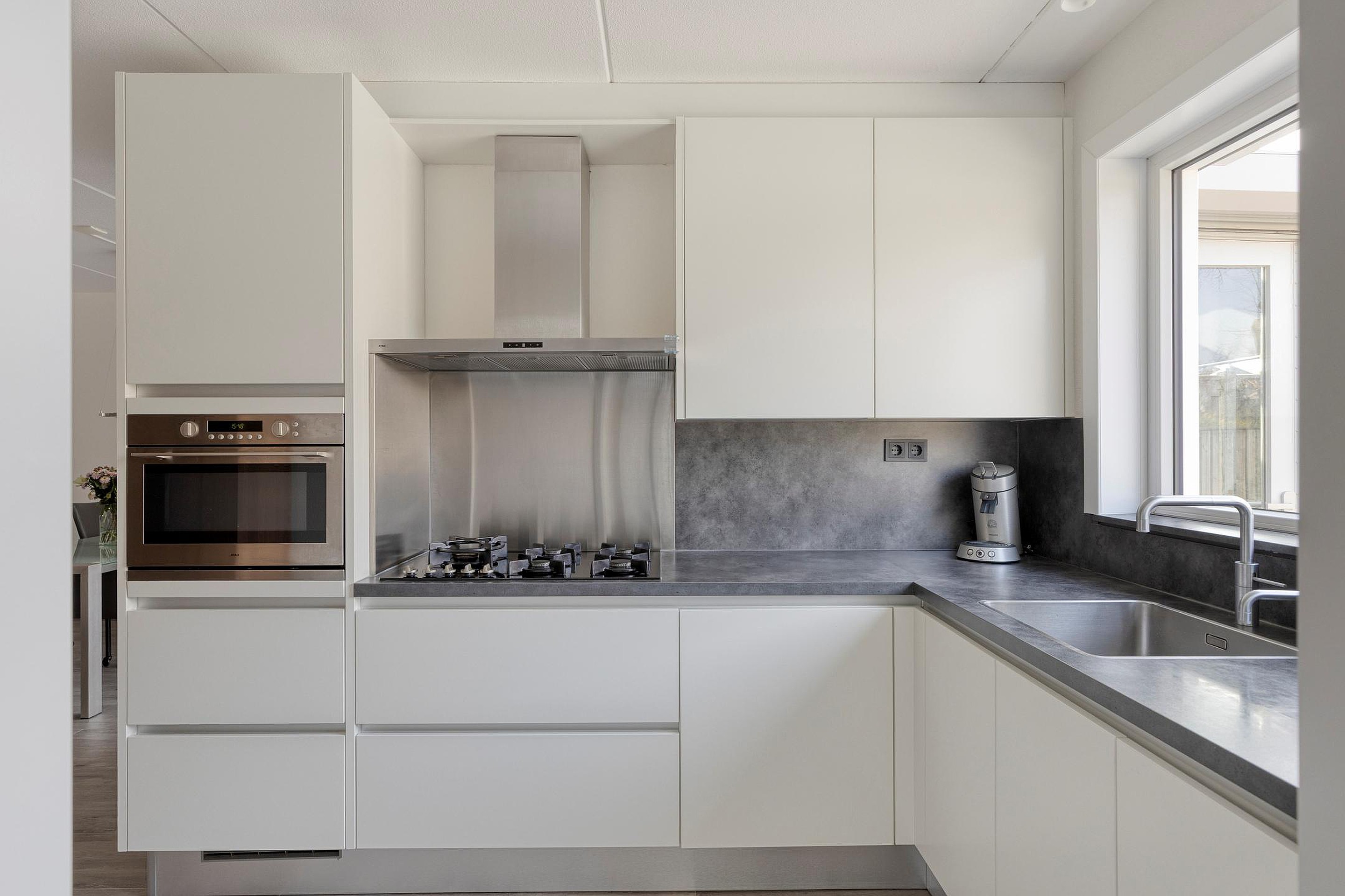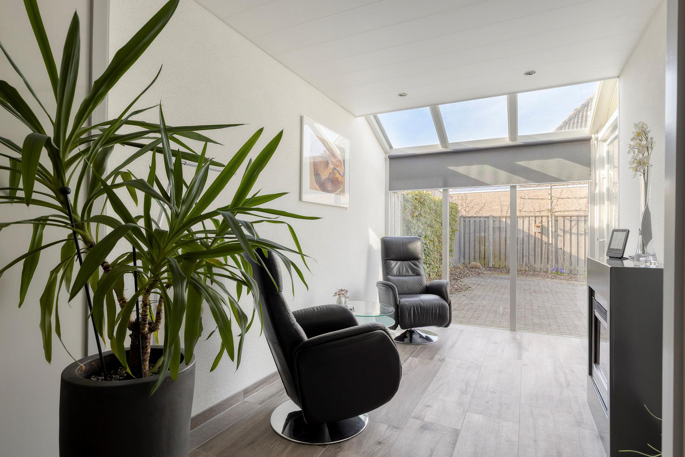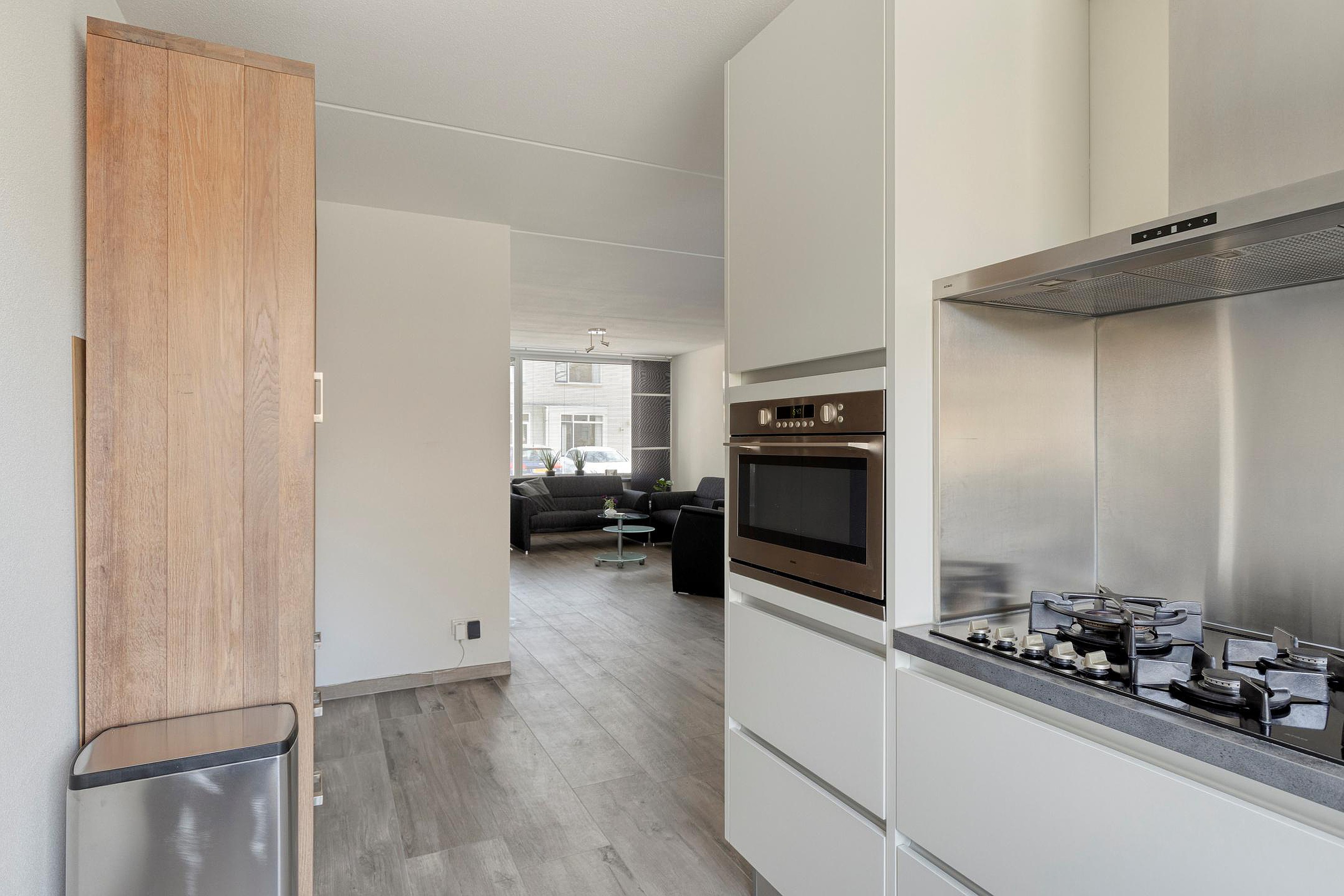 Begane grond Entree, hal met meterkast en vernieuwd toilet met hangreservoir en fonteintje. De woonkamer is heerlijk ruim met een fijne lichtinval. Aan de achterzijde van de woonkamer is een serre aangebouwd, veel glas wat het een zeer fijne ruimte maakt met zicht in eigen achtertuin. De (lichte) open keuken is aan de achterzijde gesitueerd voorzien van een 5-pits gaskookplaat, combi oven/magnetron, afzuigkap, koelkast, vaatwasser en een quooker. In de bijkeuken zijn de wasmachine en droger aansluitingen aanwezig, wat een praktische ruimte. De begane grondvloer is voorzien van een mooie tegel met vloerverwarming.