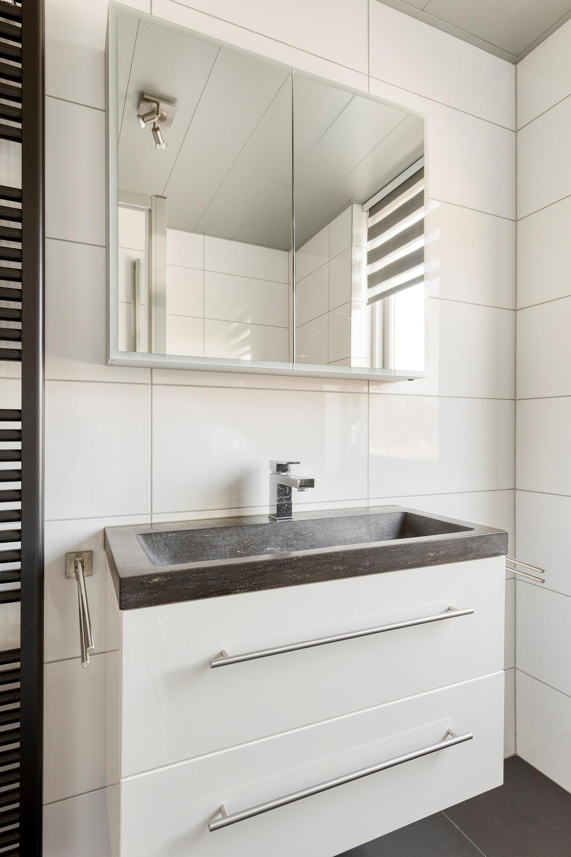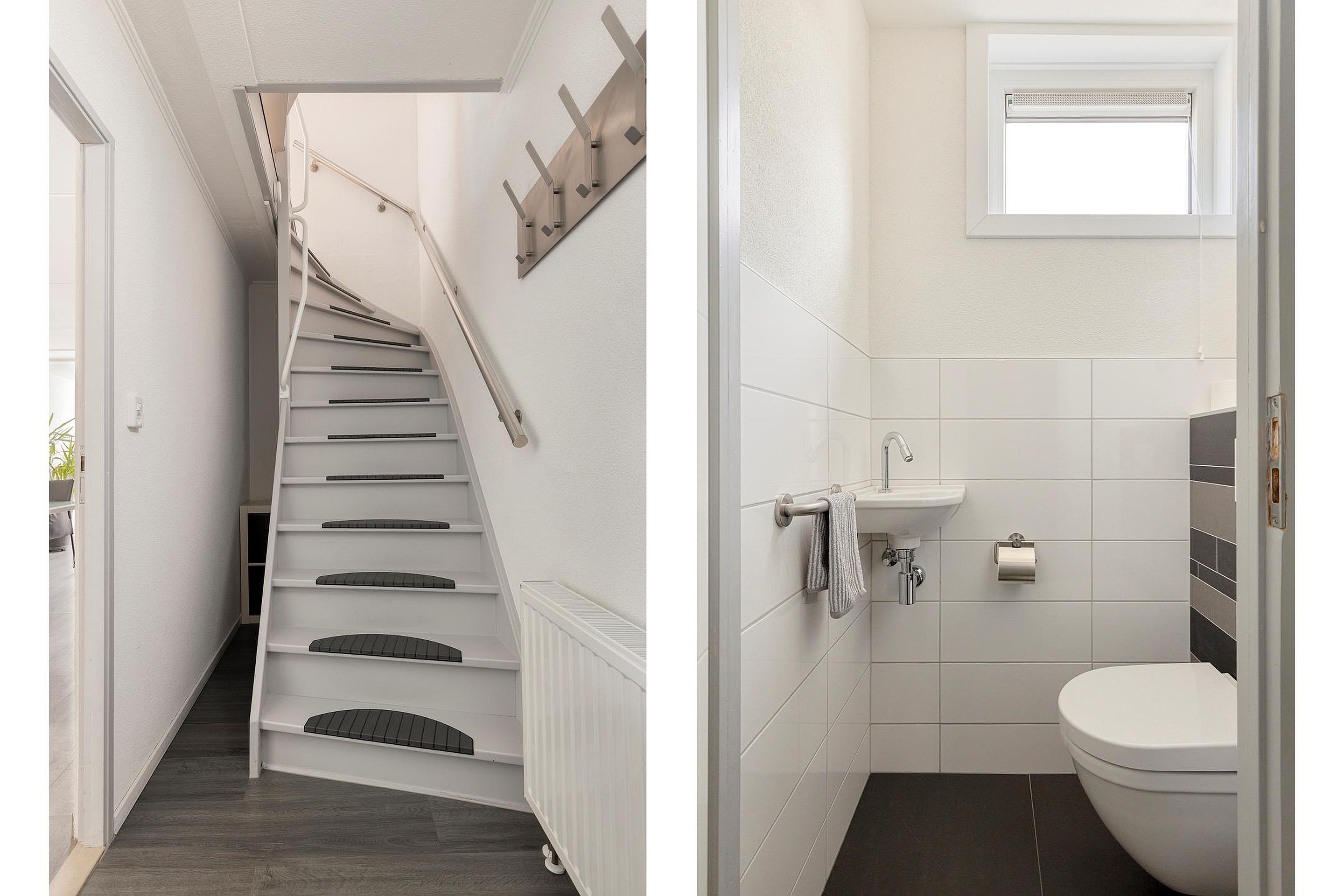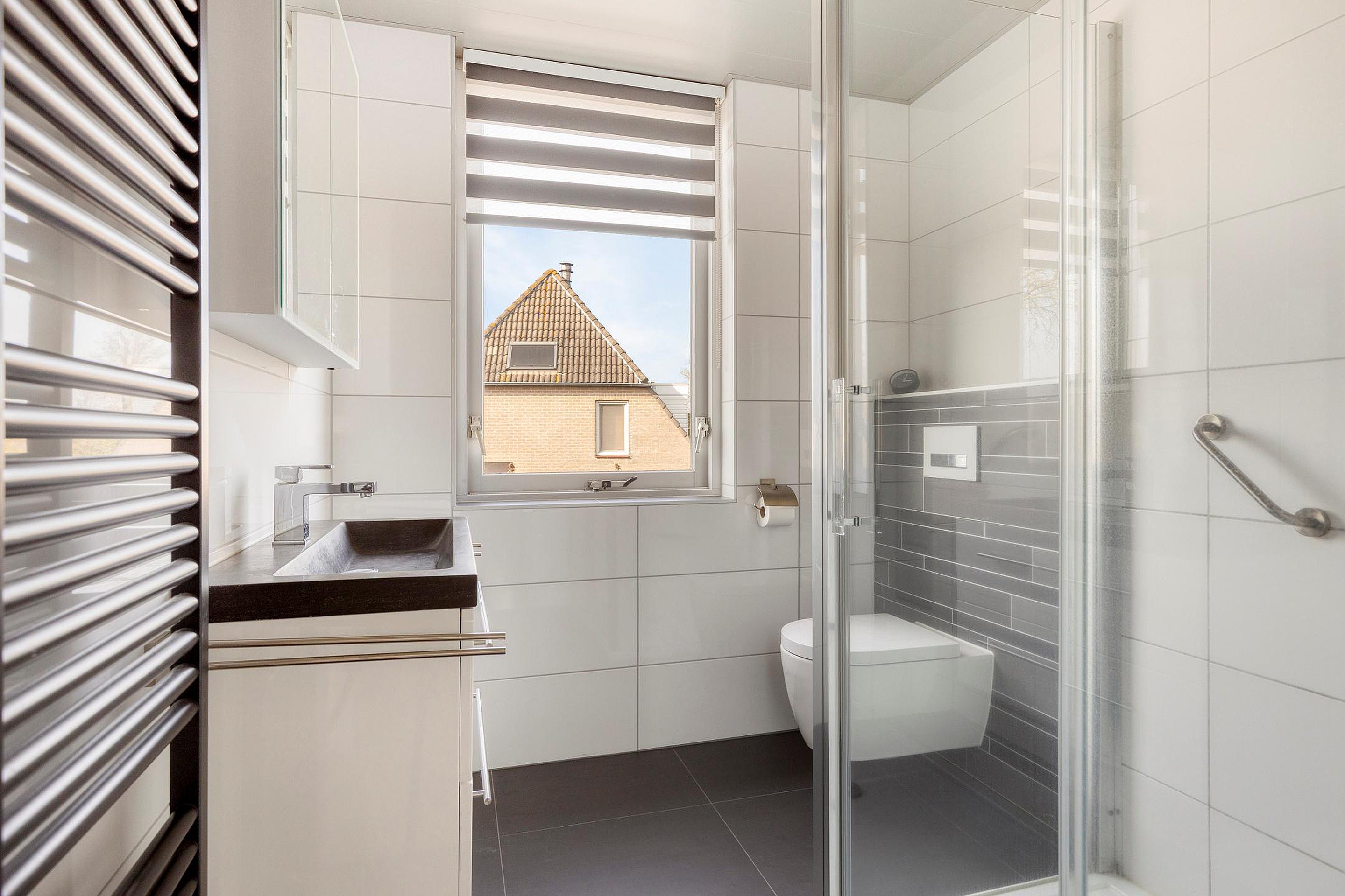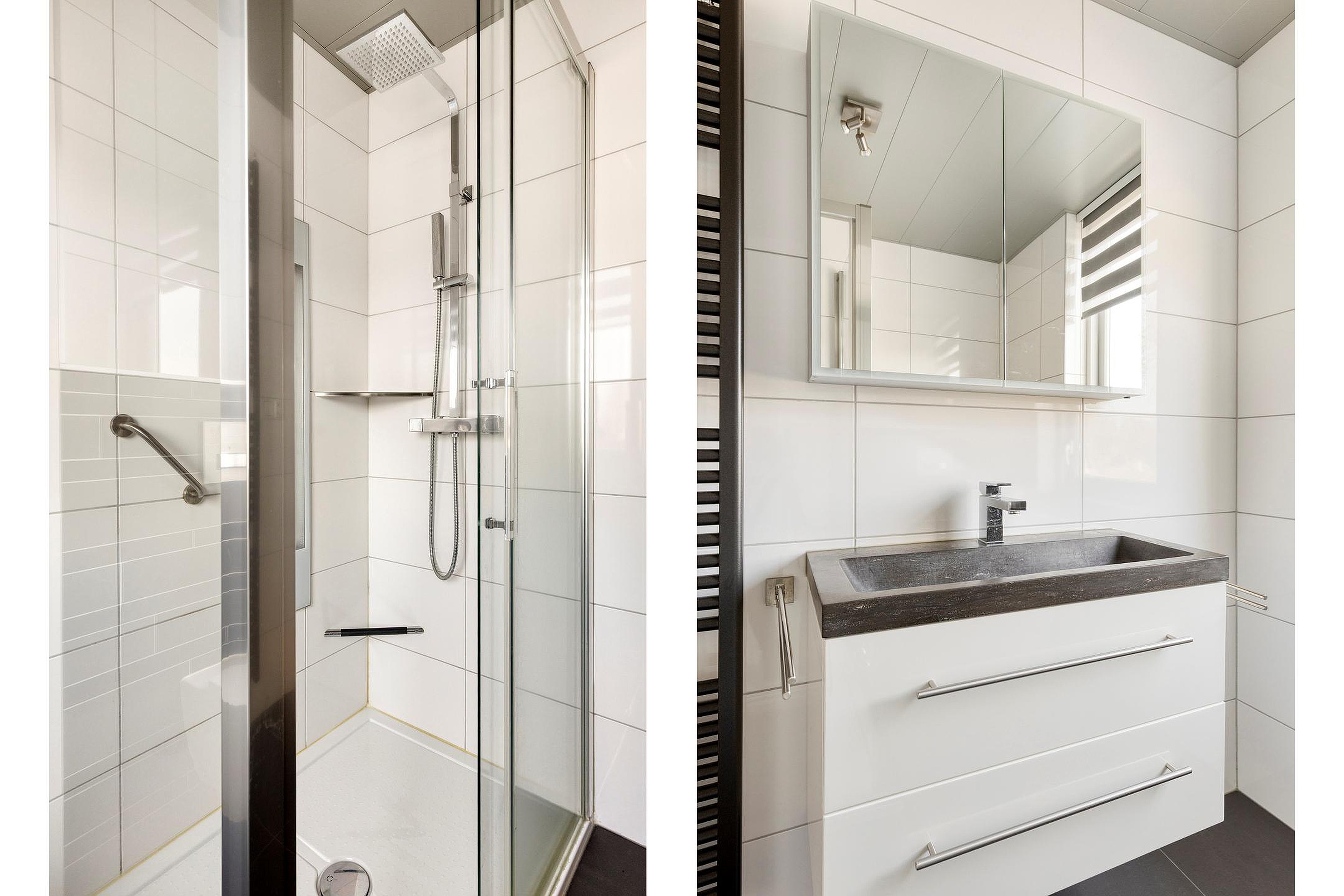 Eerste verdieping Overloop, 3 slaapkamers en de modern ingerichte badkamer met ruime inloopdouche met sunshower, wastafel in meubel en het 2e toilet.