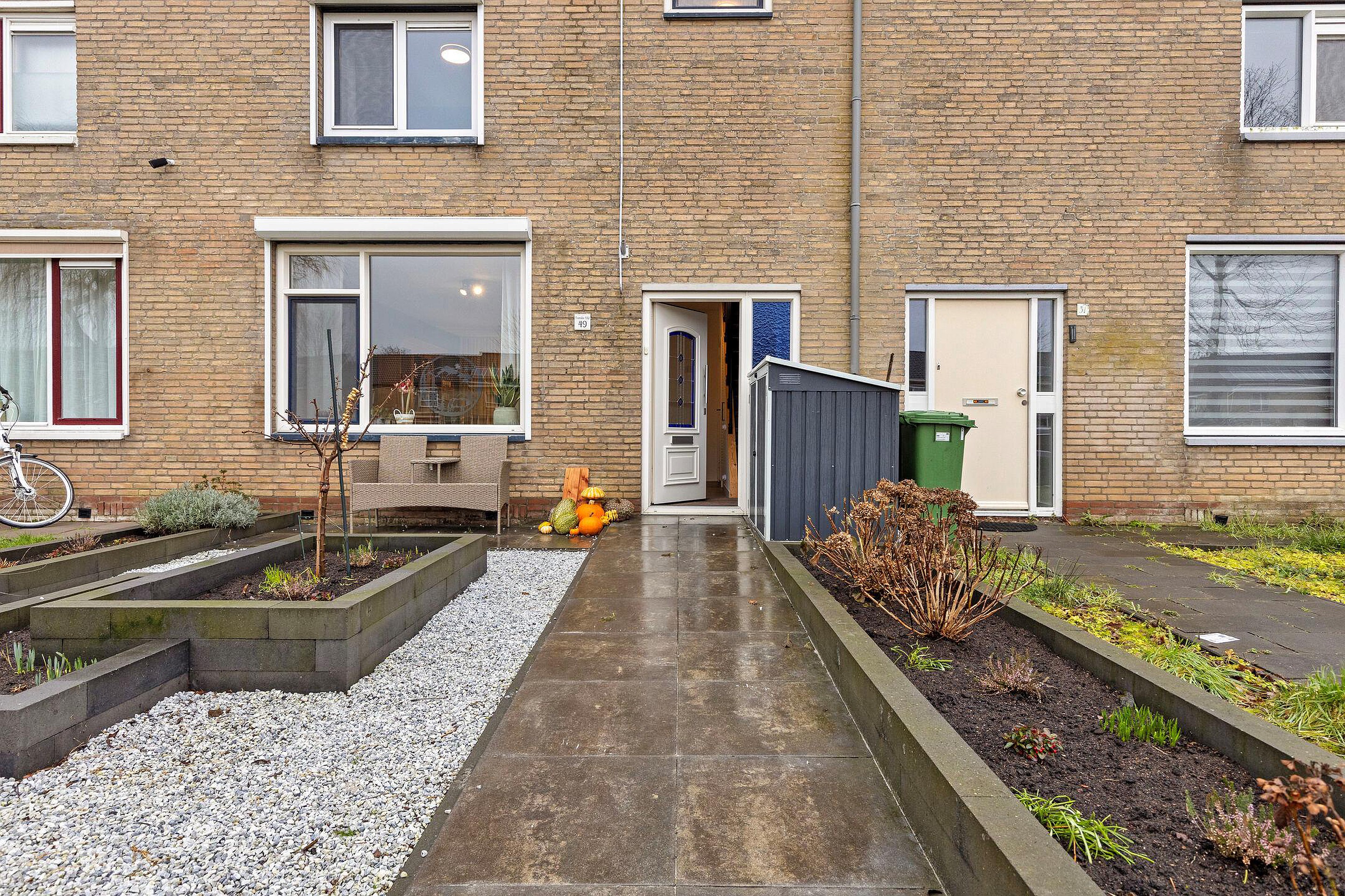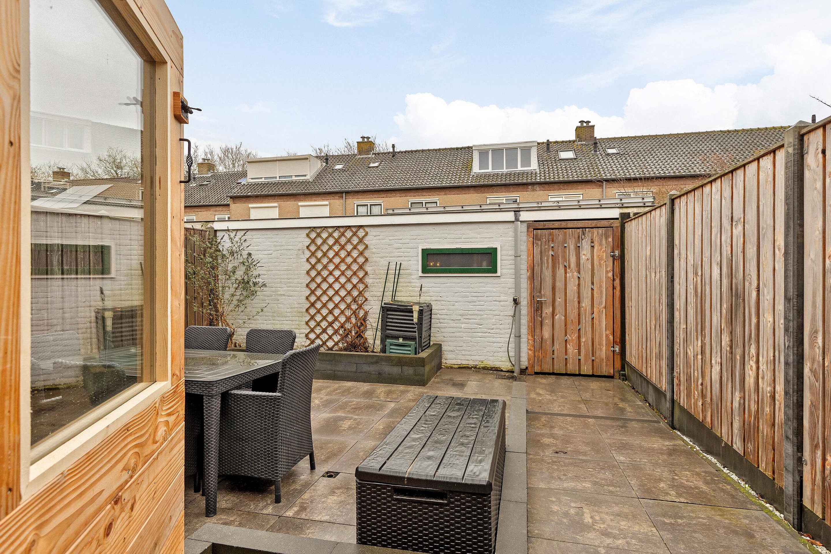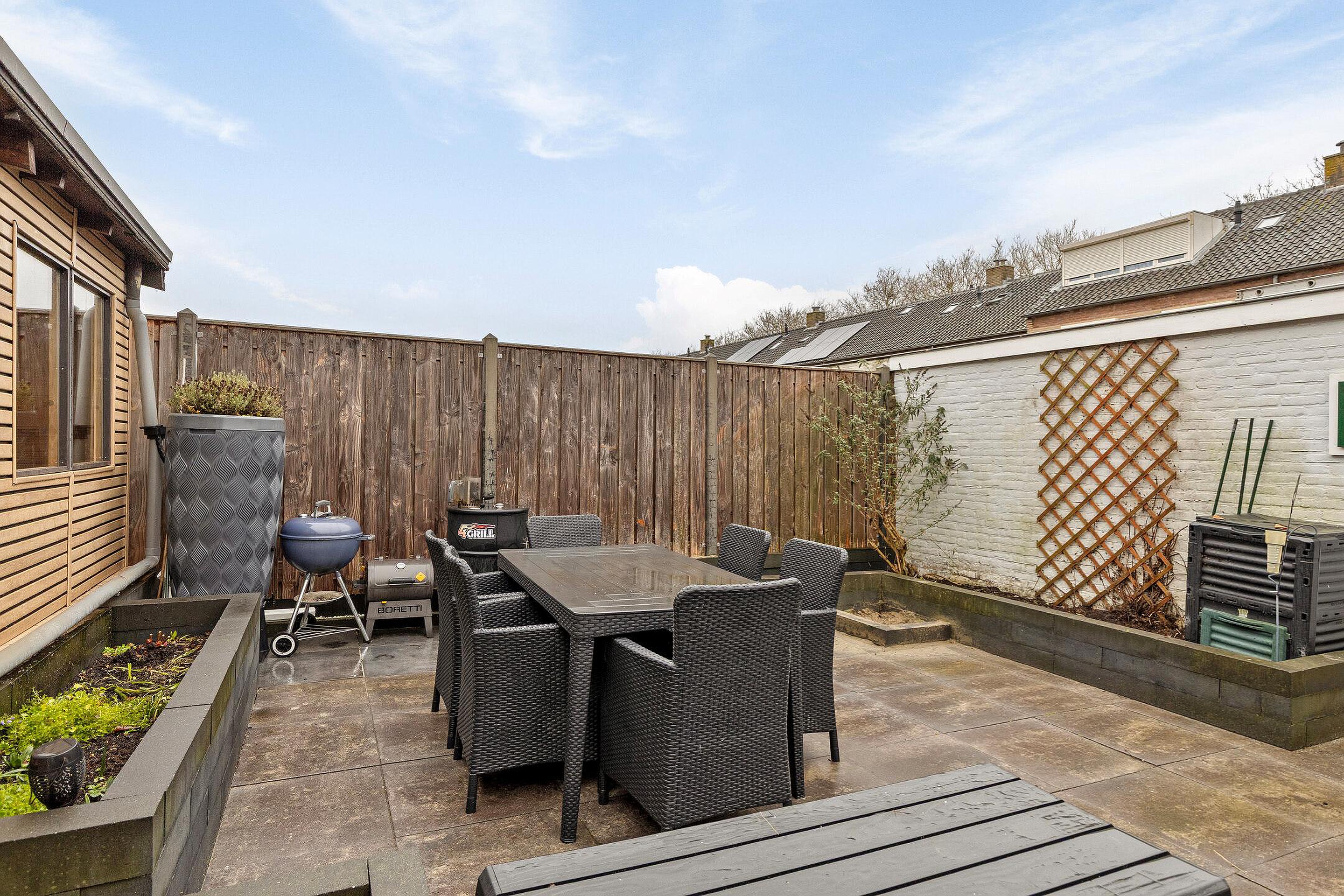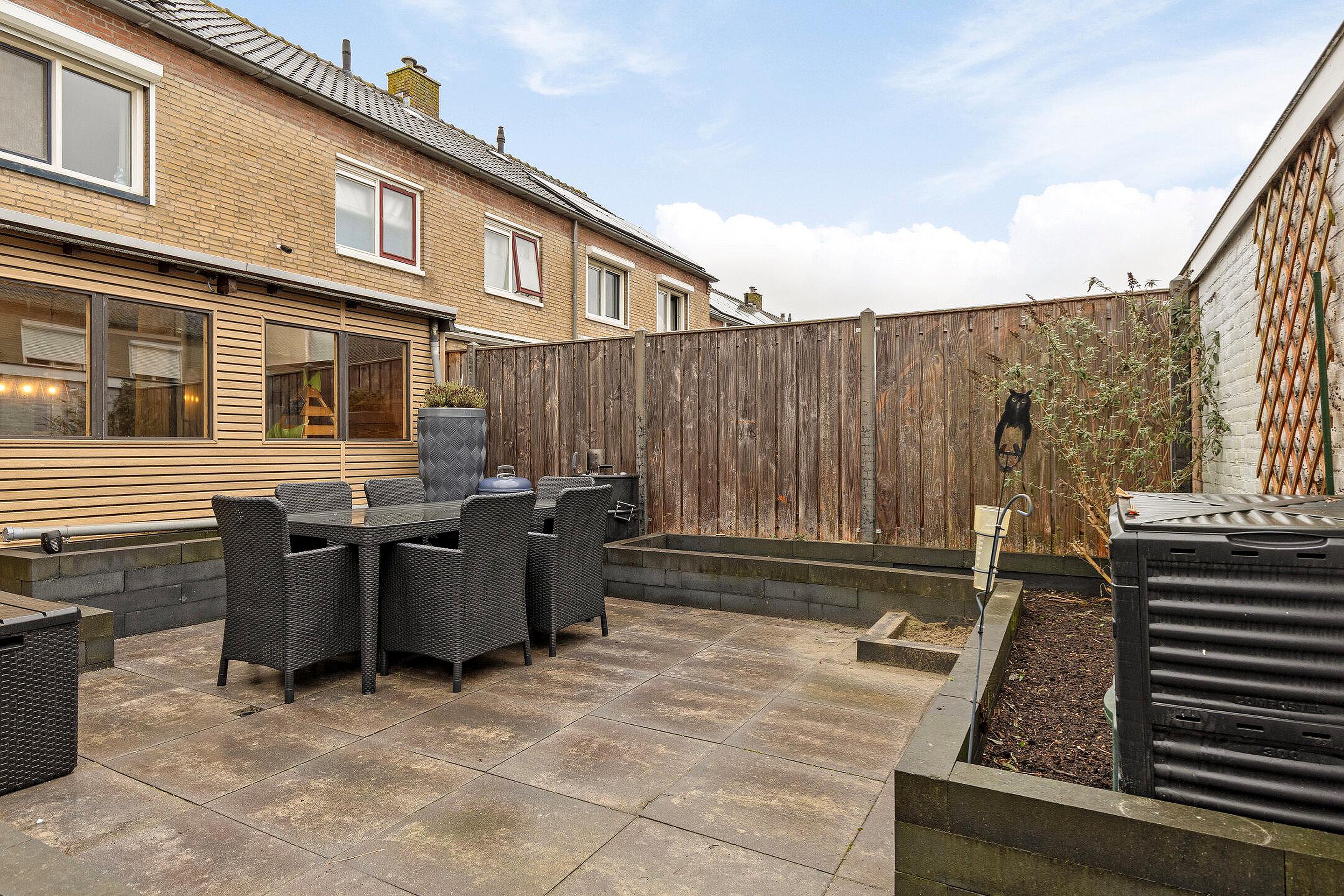 De verzorgde tuin is zowel aan de voor- als achterzijde fraai aangelegd met sierbestrating en plantenborders. De achtertuin is gelegen op het zuidoosten en biedt volop privacy. Achterin de tuin staat een praktische stenen berging (ca. 8 m2), ideaal voor fietsen en extra opslag.
