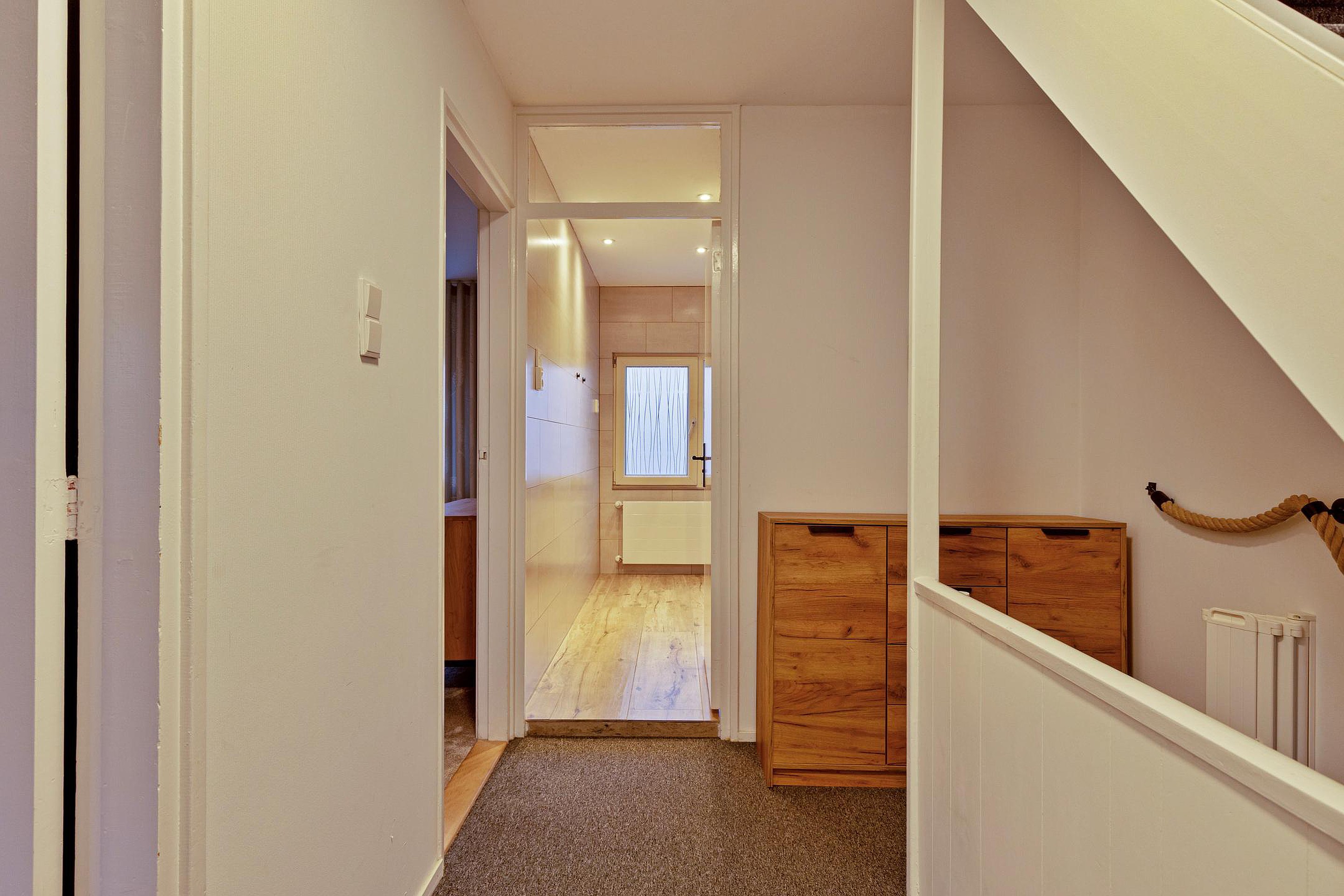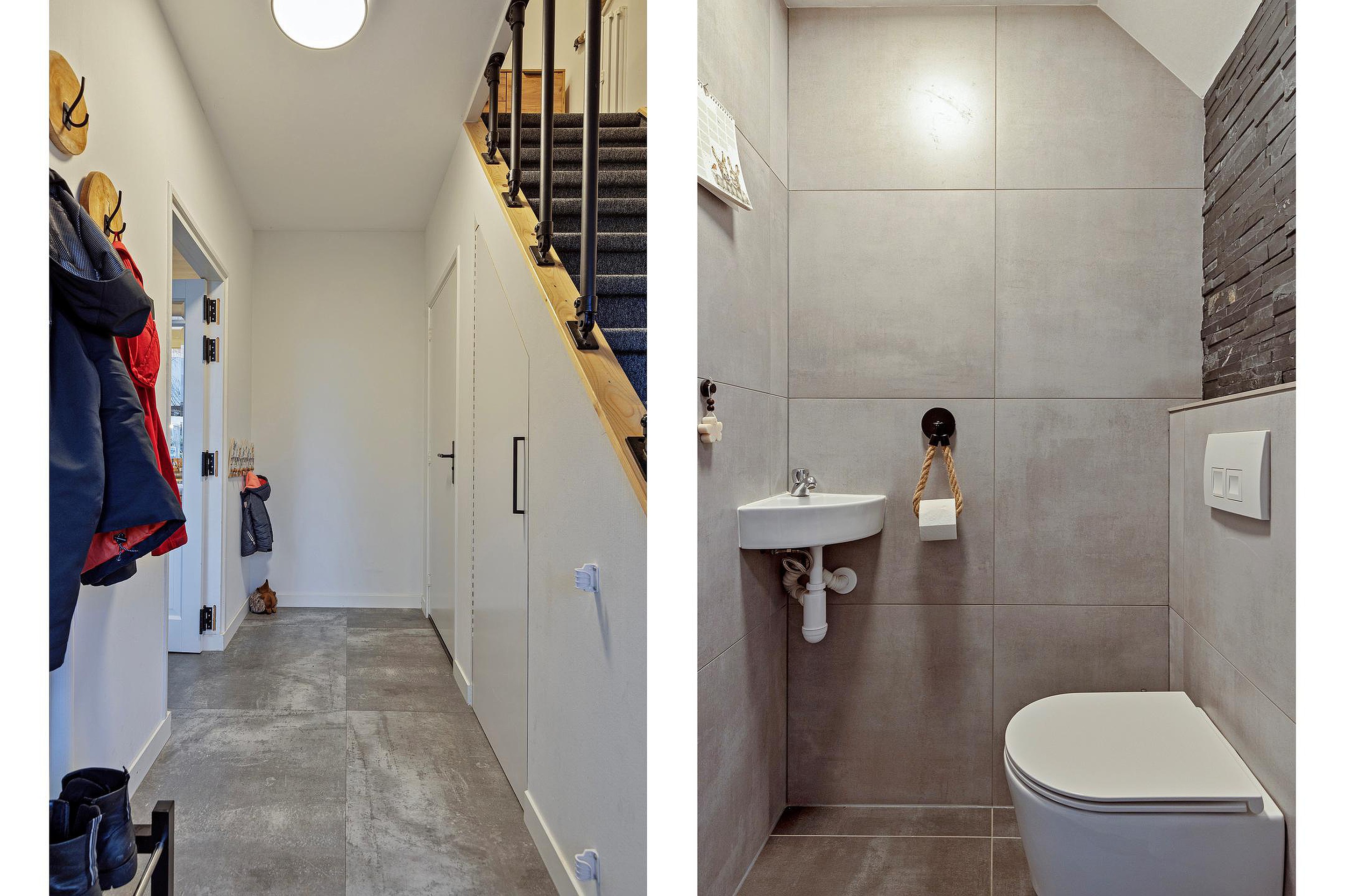 U komt de woning binnen in de ruime hal met meterkast, toilet en trapopgang. Het toilet is modern uitgevoerd met een hangtoilet en een fonteintje.