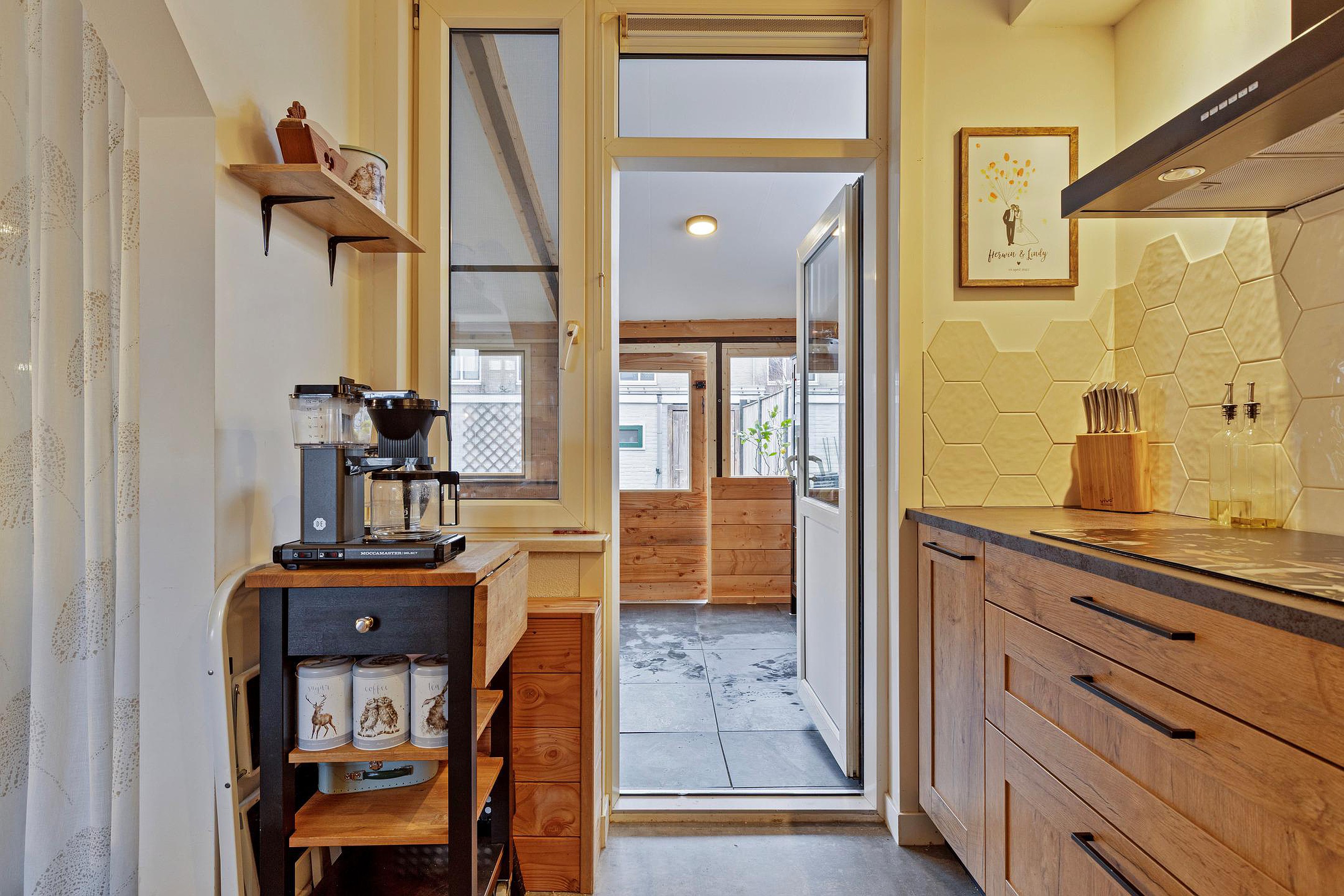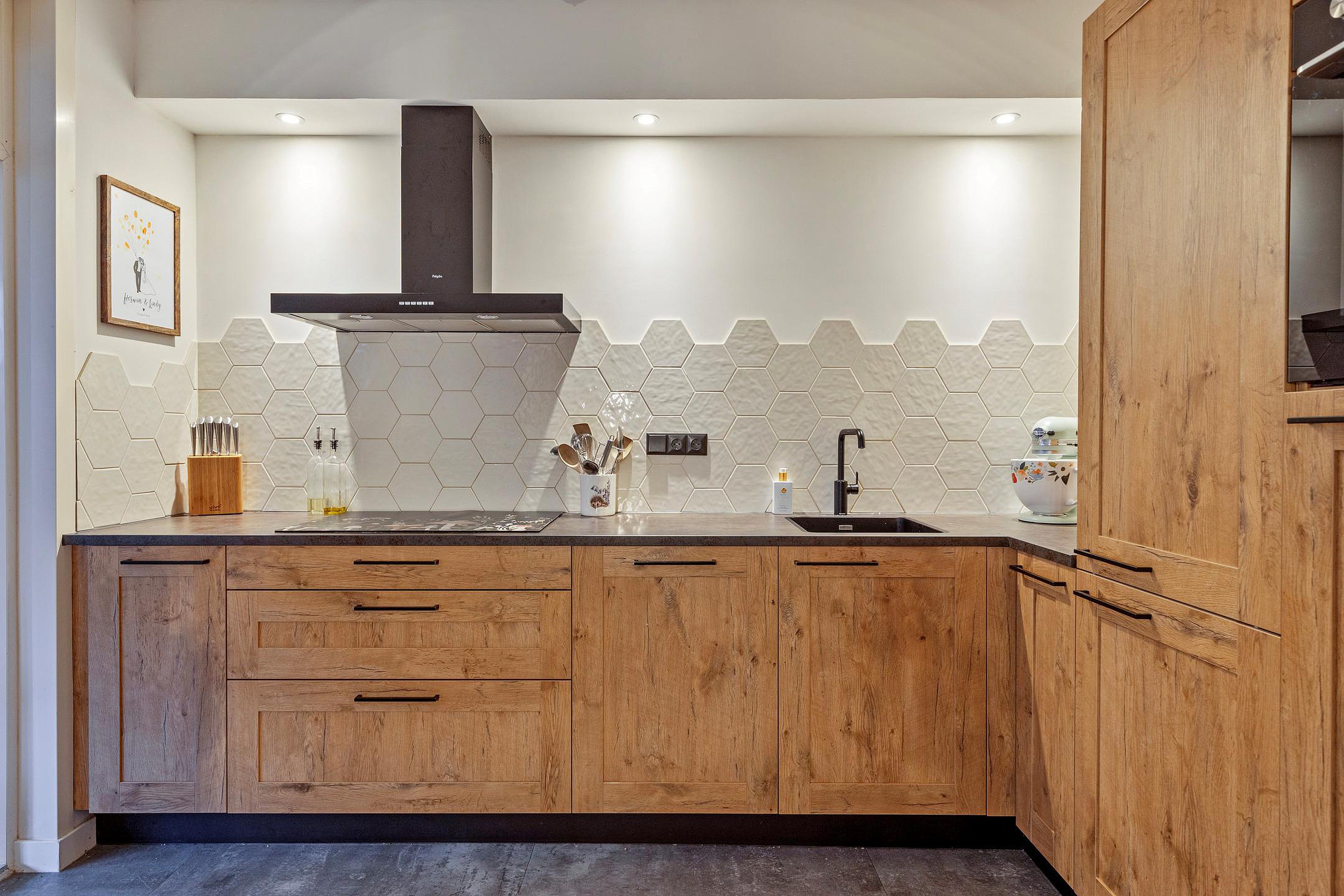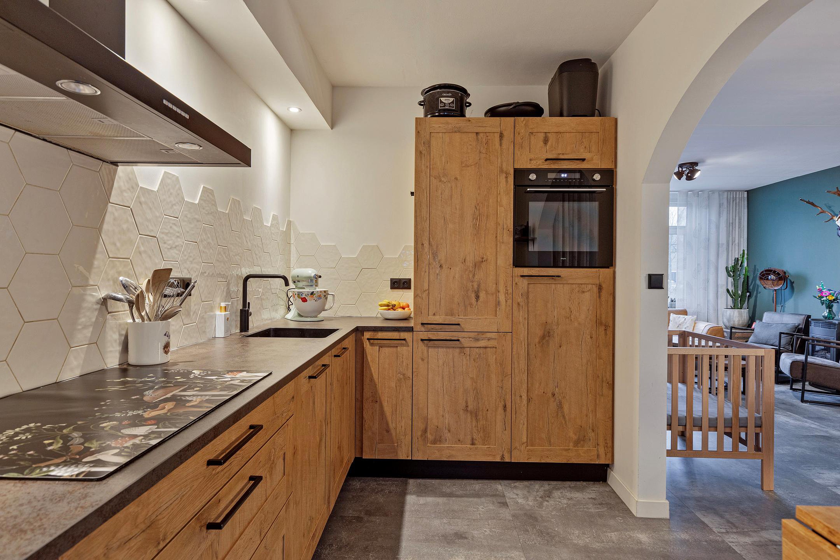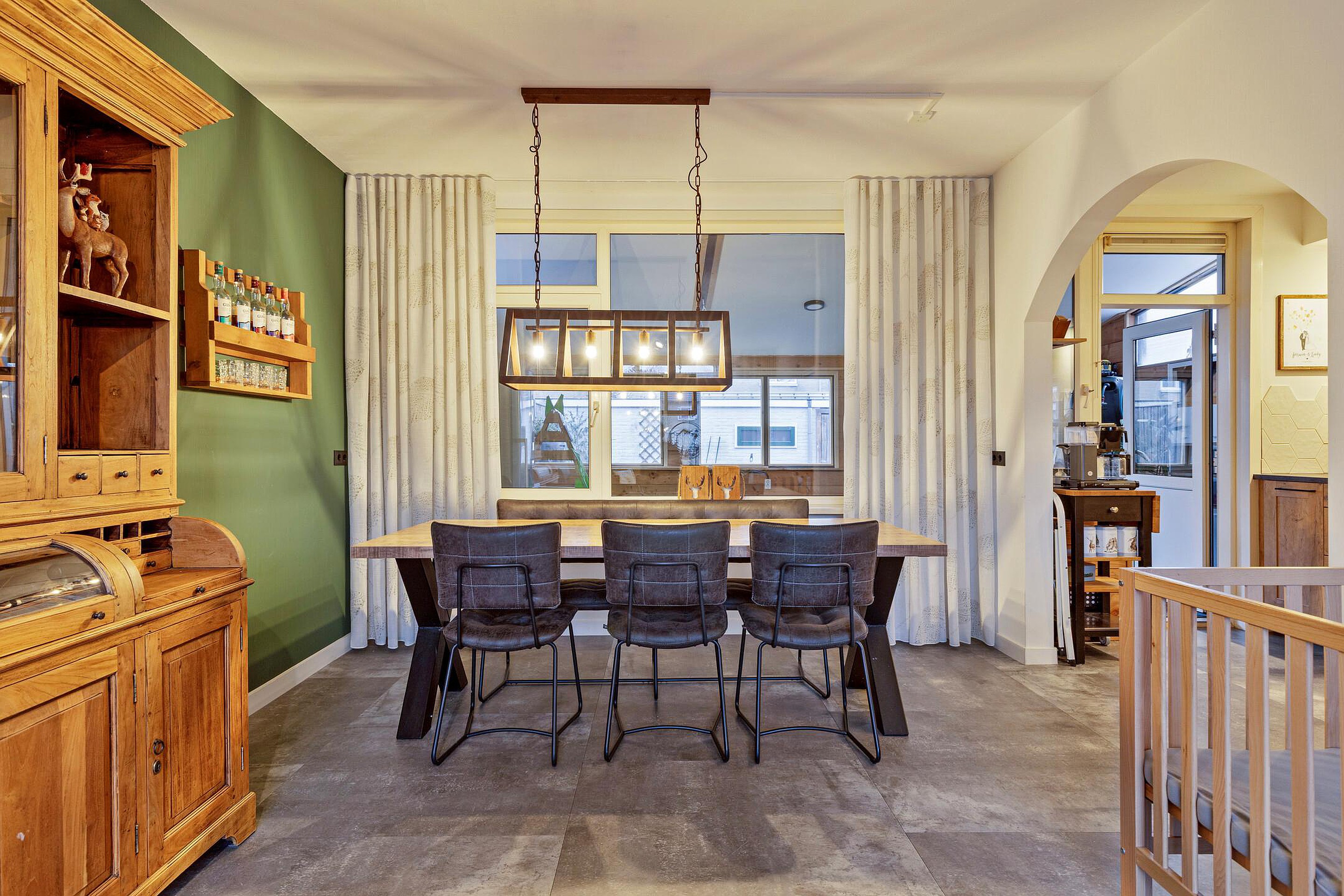 De lichte en sfeervolle woonkamer beschikt over een comfortabele zithoek en een gezellige eethoek. De open verbinding met de keuken zorgt voor een fijne ruimtelijke beleving. De keuken is voorzien van een fraaie, moderne keukenopstelling met alle wenselijke inbouwapparatuur, waaronder een kookplaat, afzuigkap, combioven, vaatwasser en koelkast.