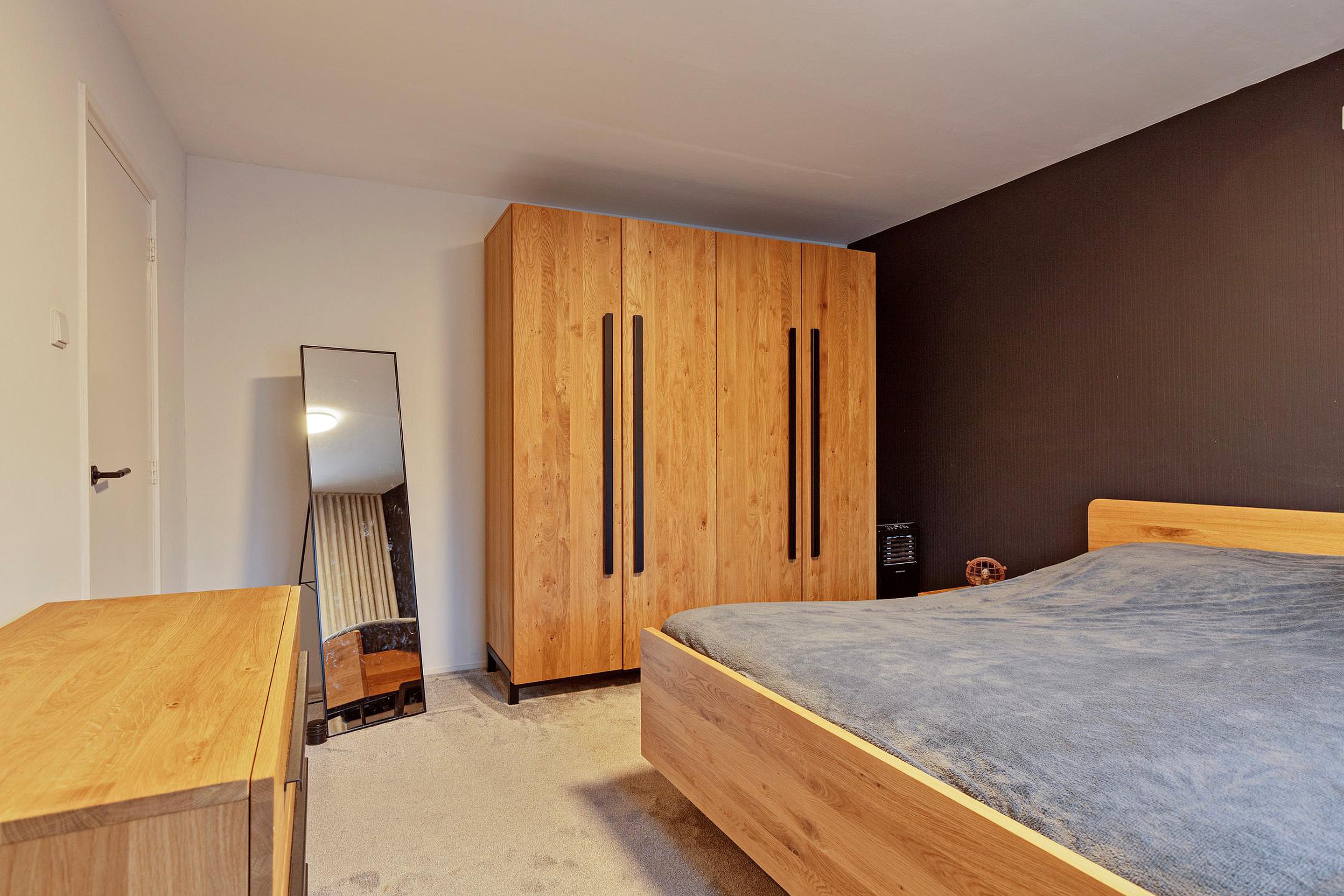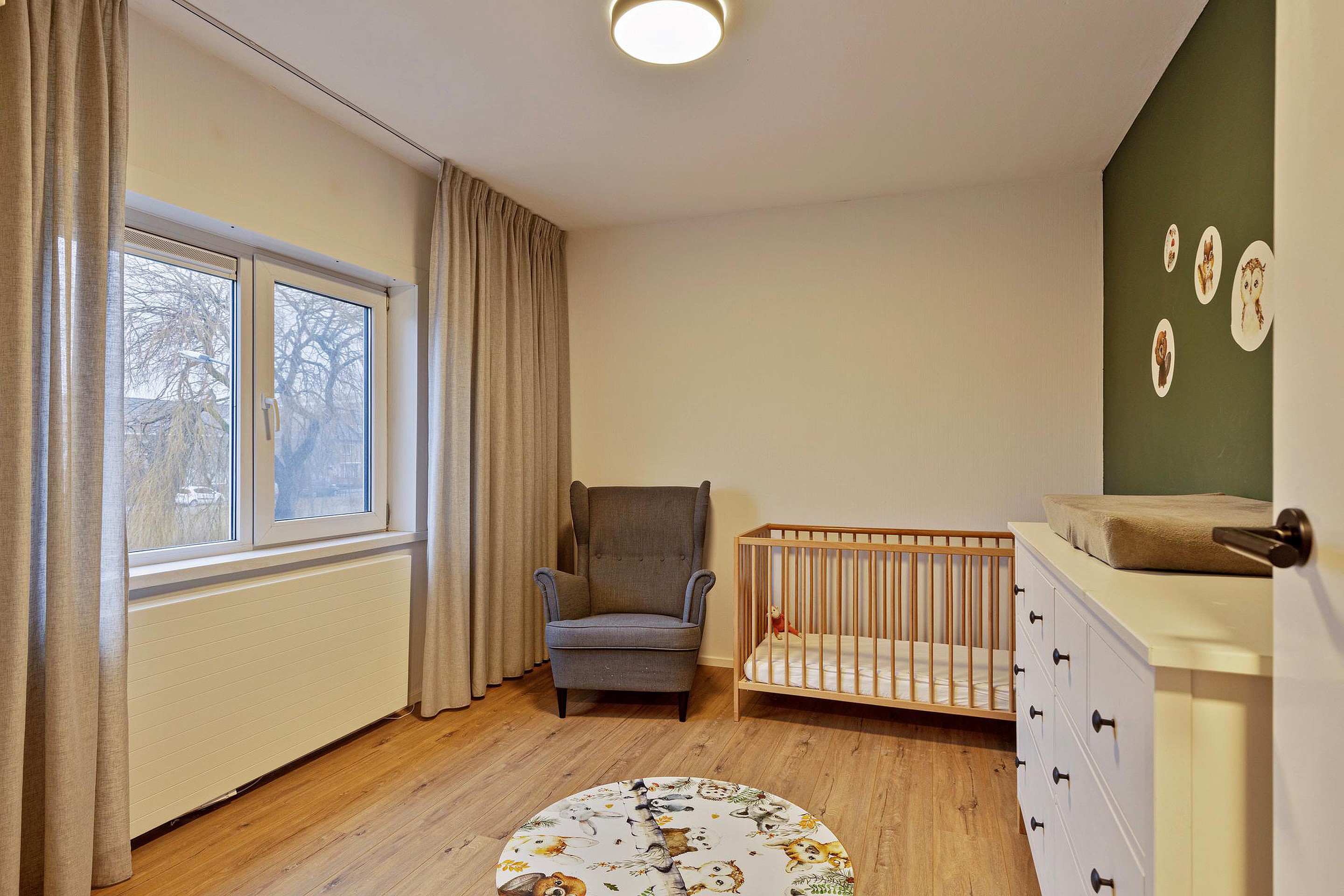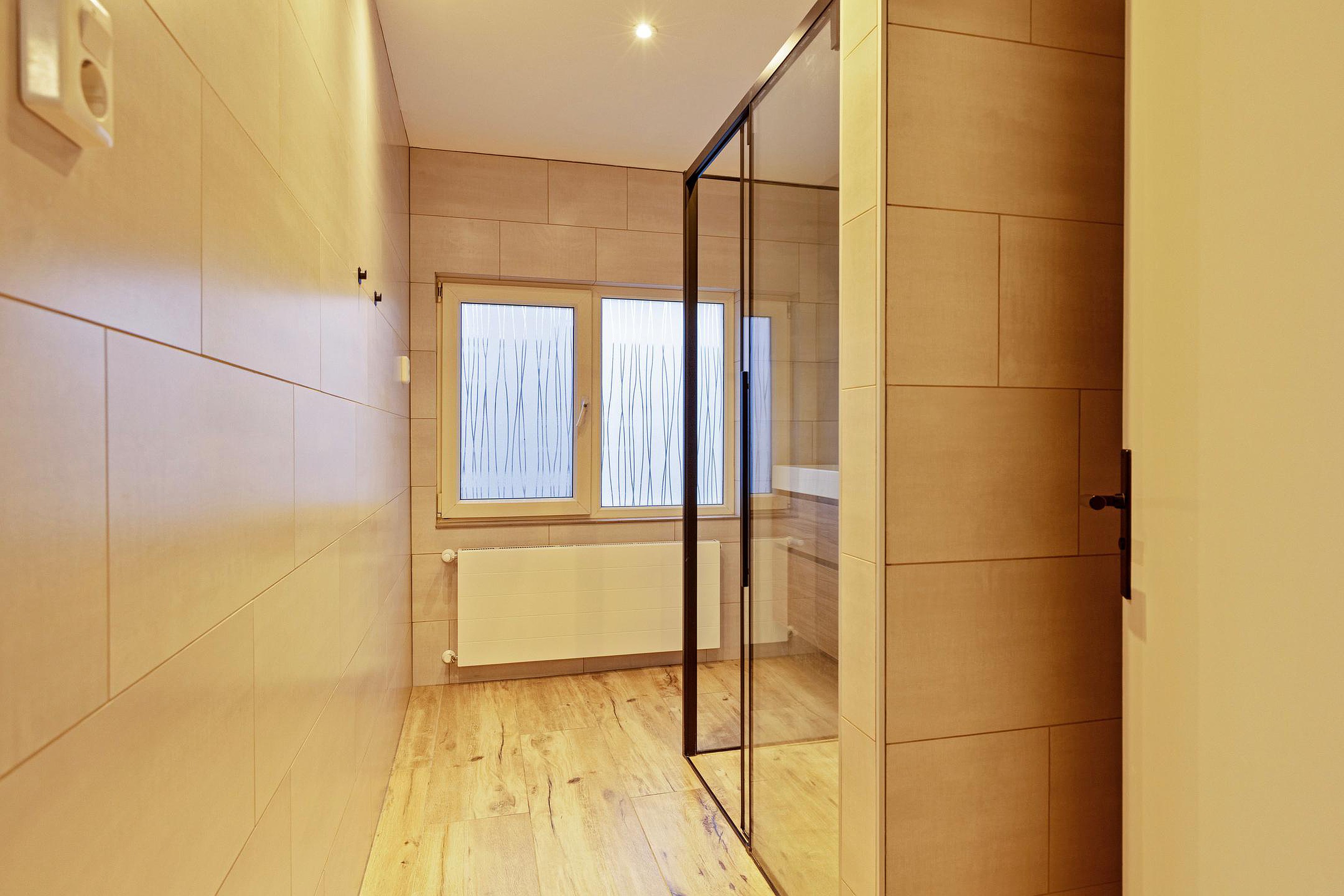 Op de eerste verdieping vindt u een overloop, twee ruime slaapkamers, een aparte wasruimte en een ruime, modern afgewerkte badkamer (2024). De badkamer, gerealiseerd in een voormalige slaapkamer, is uitgevoerd met een douche, toilet en een stijlvol badkamermeubel en is voorzien van vloerverwarming.