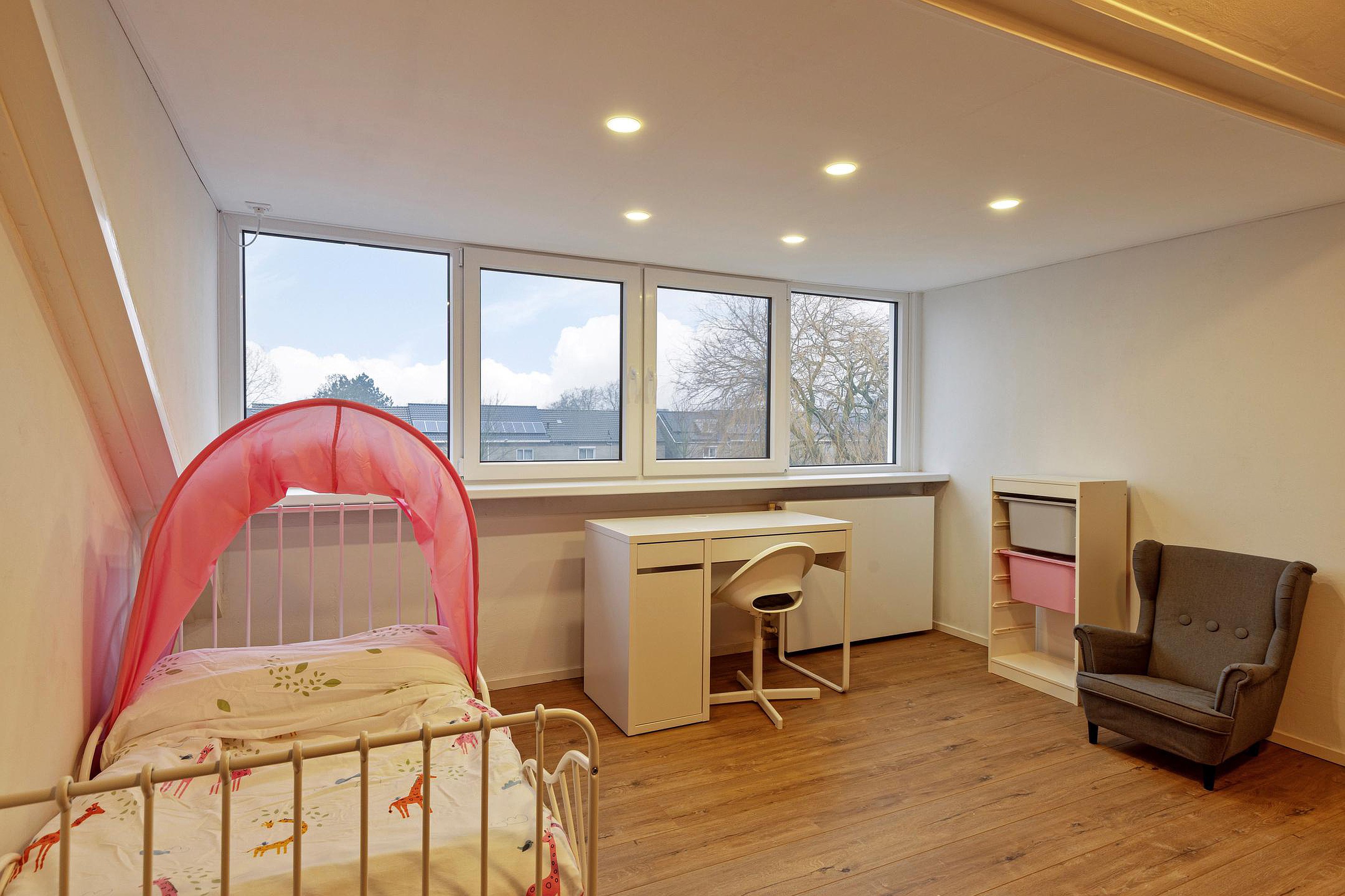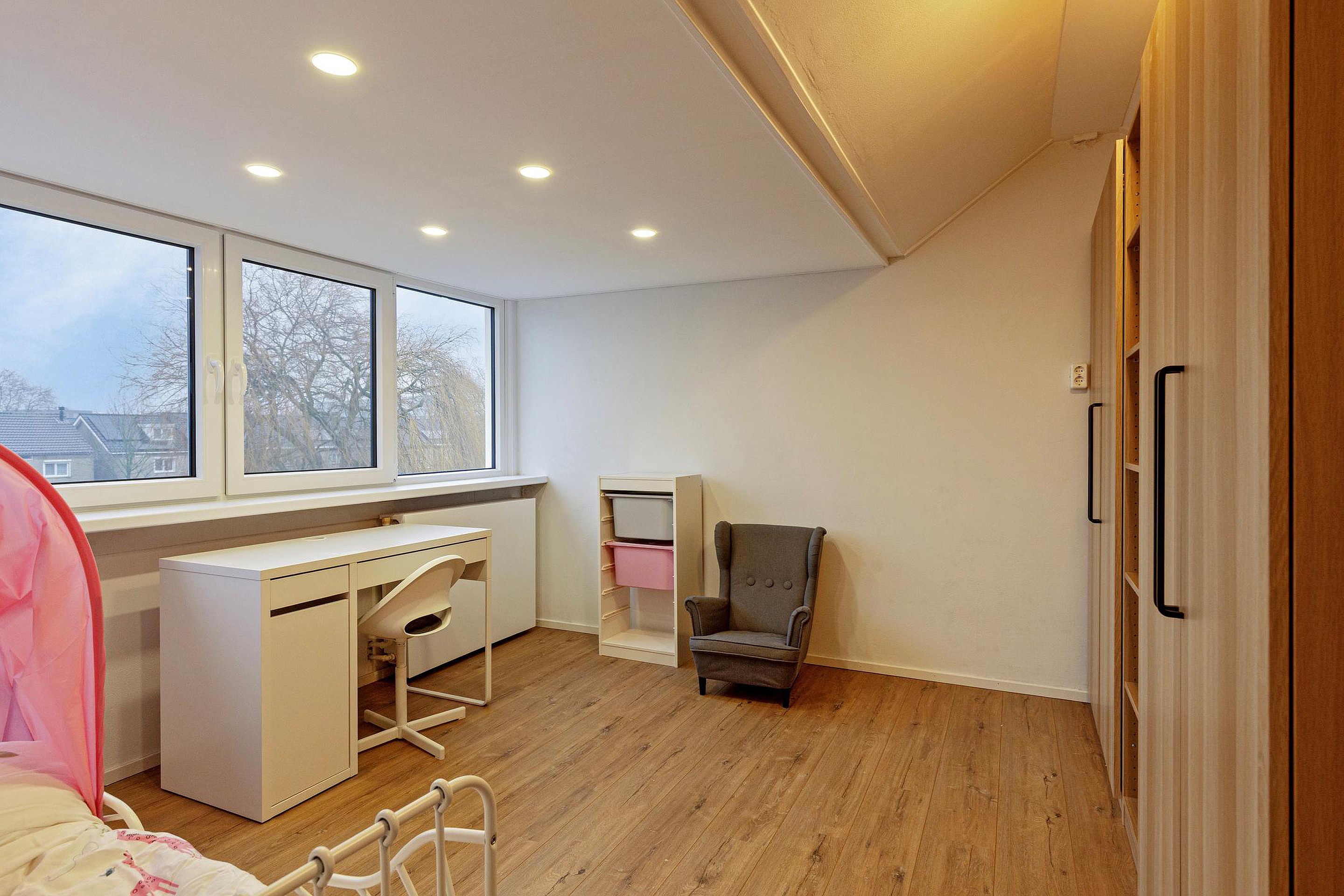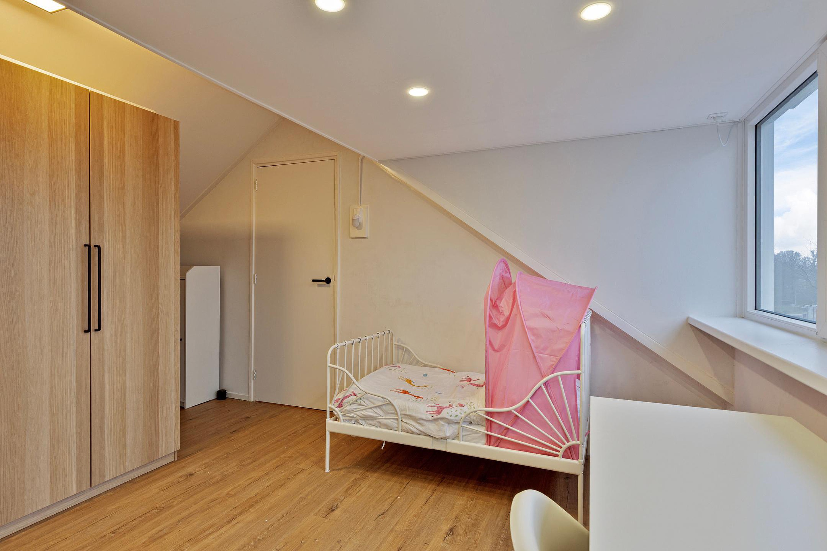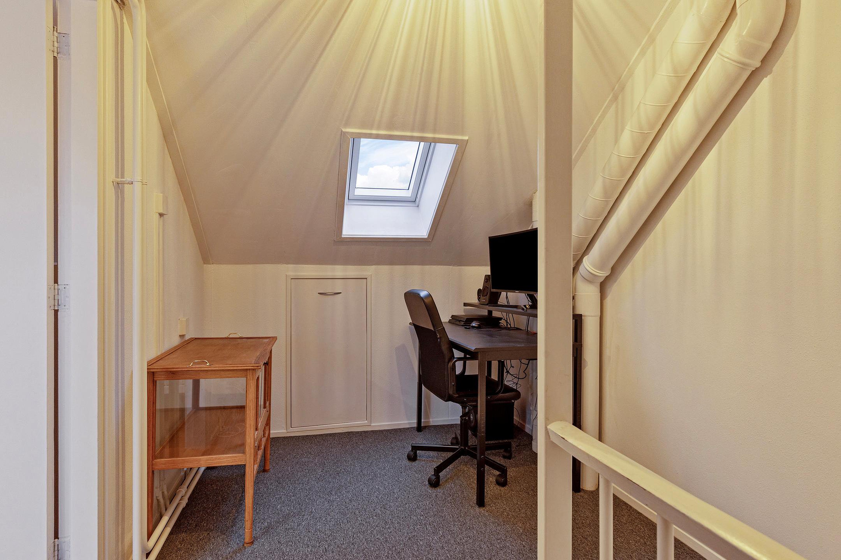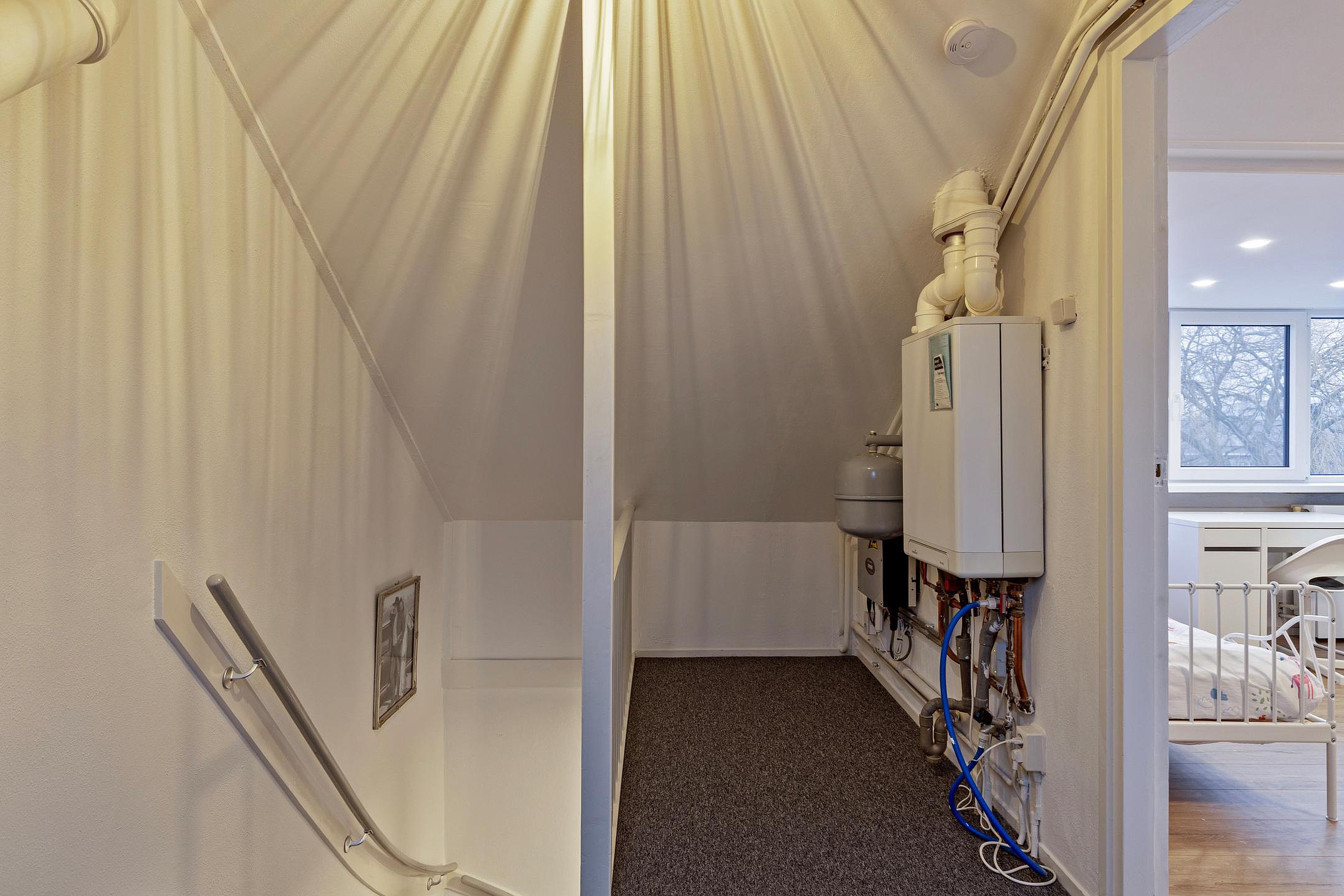 De tweede verdieping beschikt over een overloop met cv-opstelling (Intergas, 2015) en een ruime slaapkamer met dakkapel (2025), wat zorgt voor extra licht en ruimte. Daarnaast is er vaste bergruimte aanwezig.