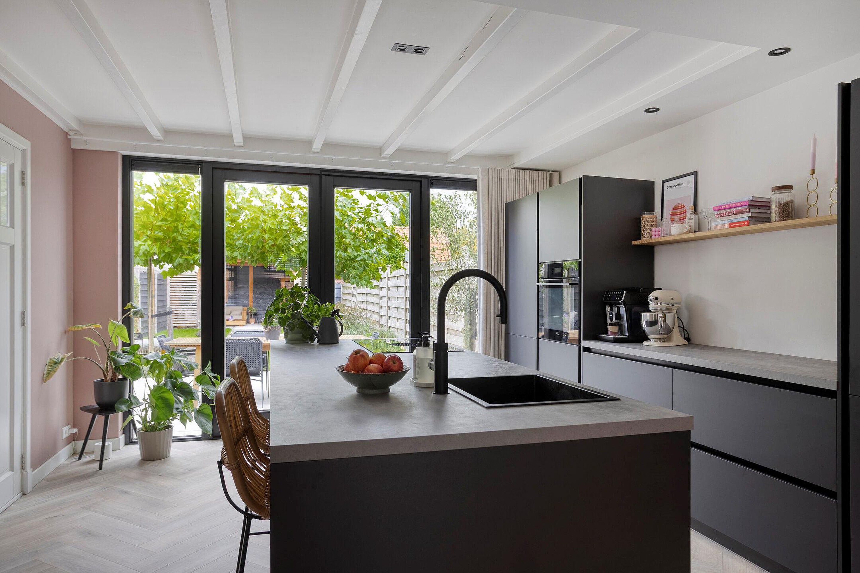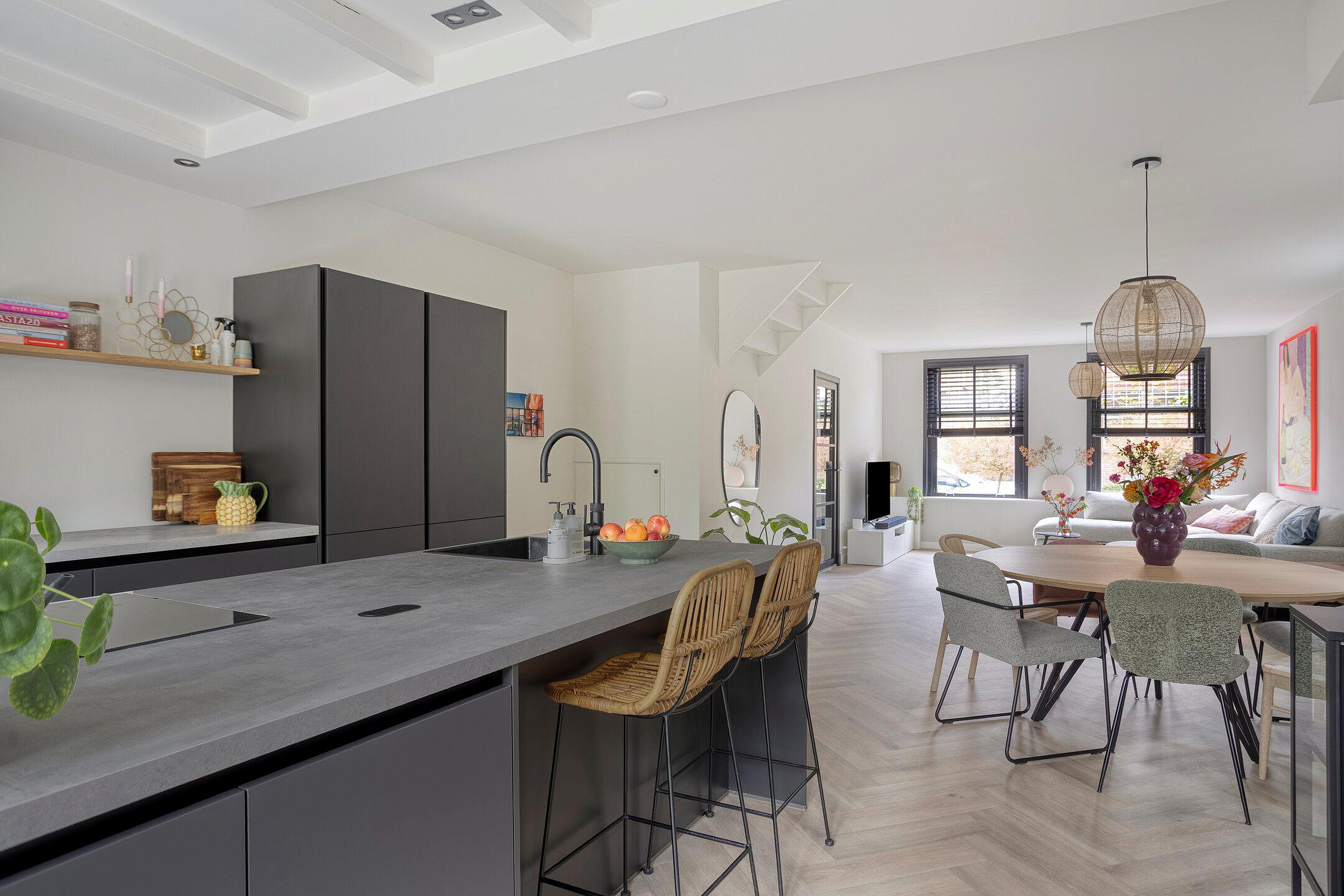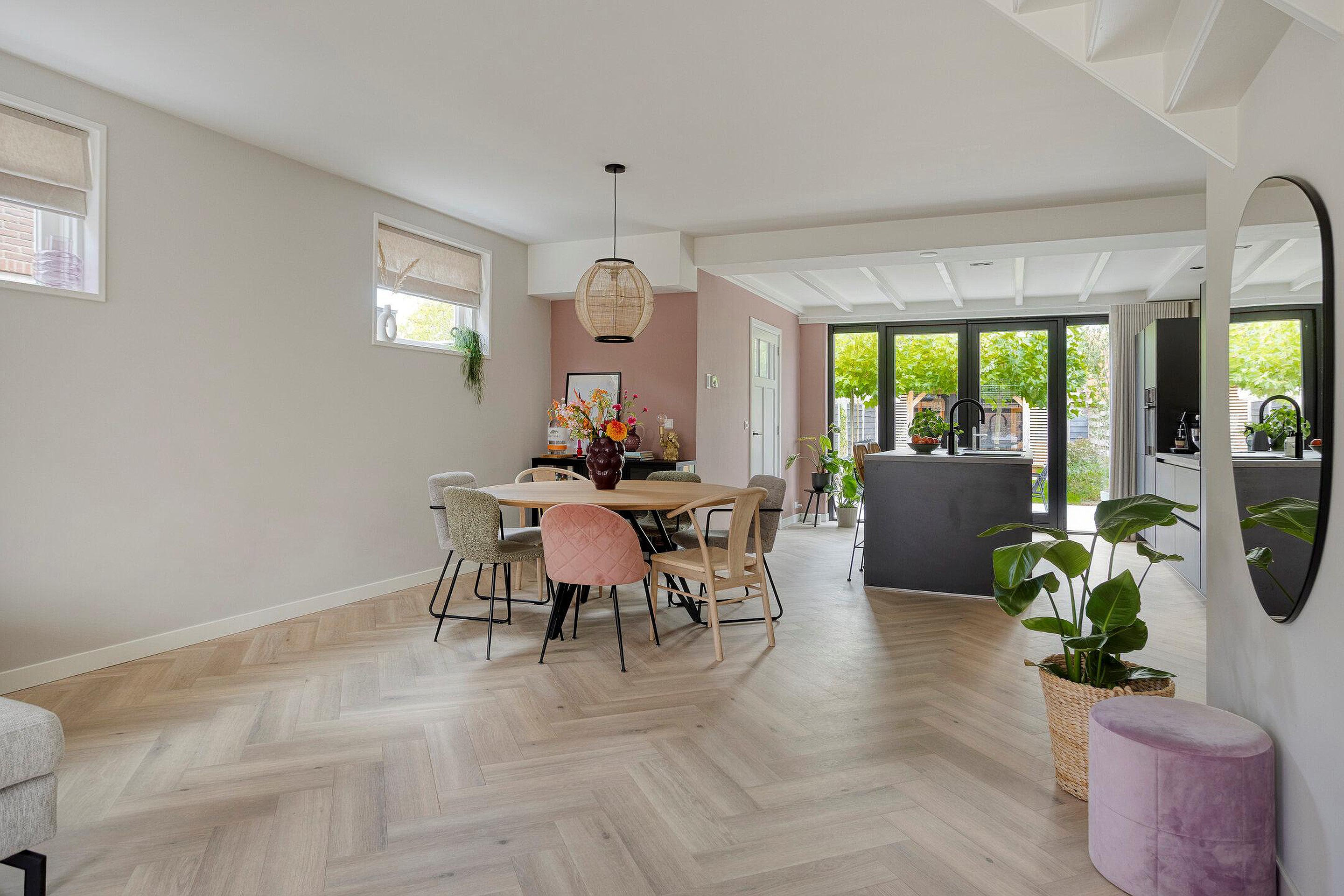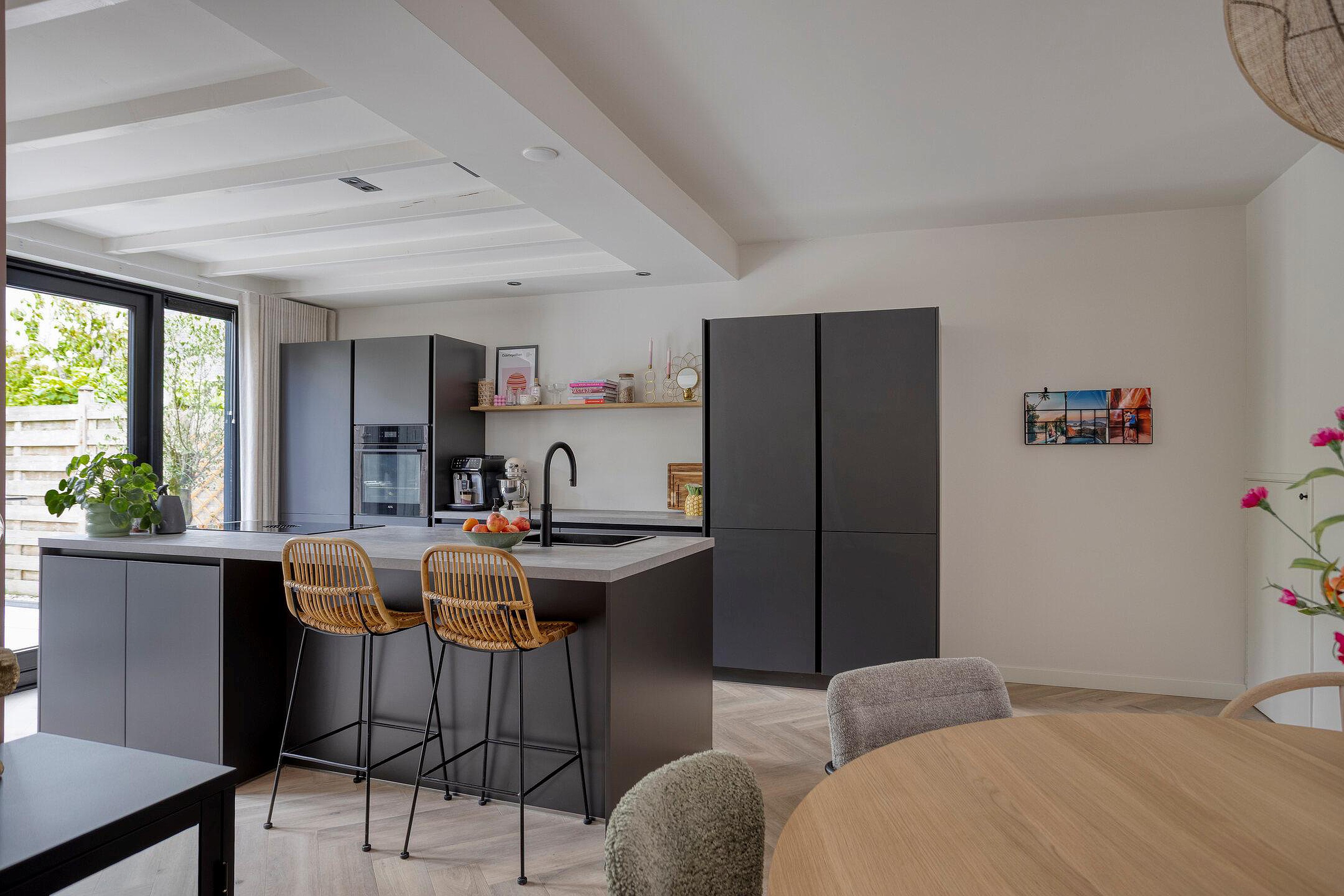 Stap binnen en ervaar de ruimte. De royale woonkamer is vergroot door een uitbouw en baadt in het licht dankzij de grote raampartijen en openslaande deuren naar de tuin. De visgraat PVC-vloer met vloerverwarming loopt drempelloos door en vormt de perfecte basis voor de strakke inrichting.