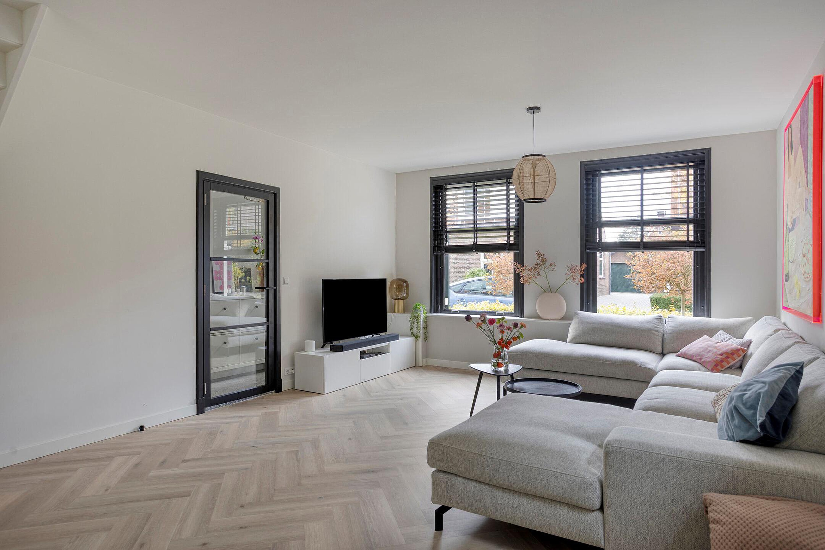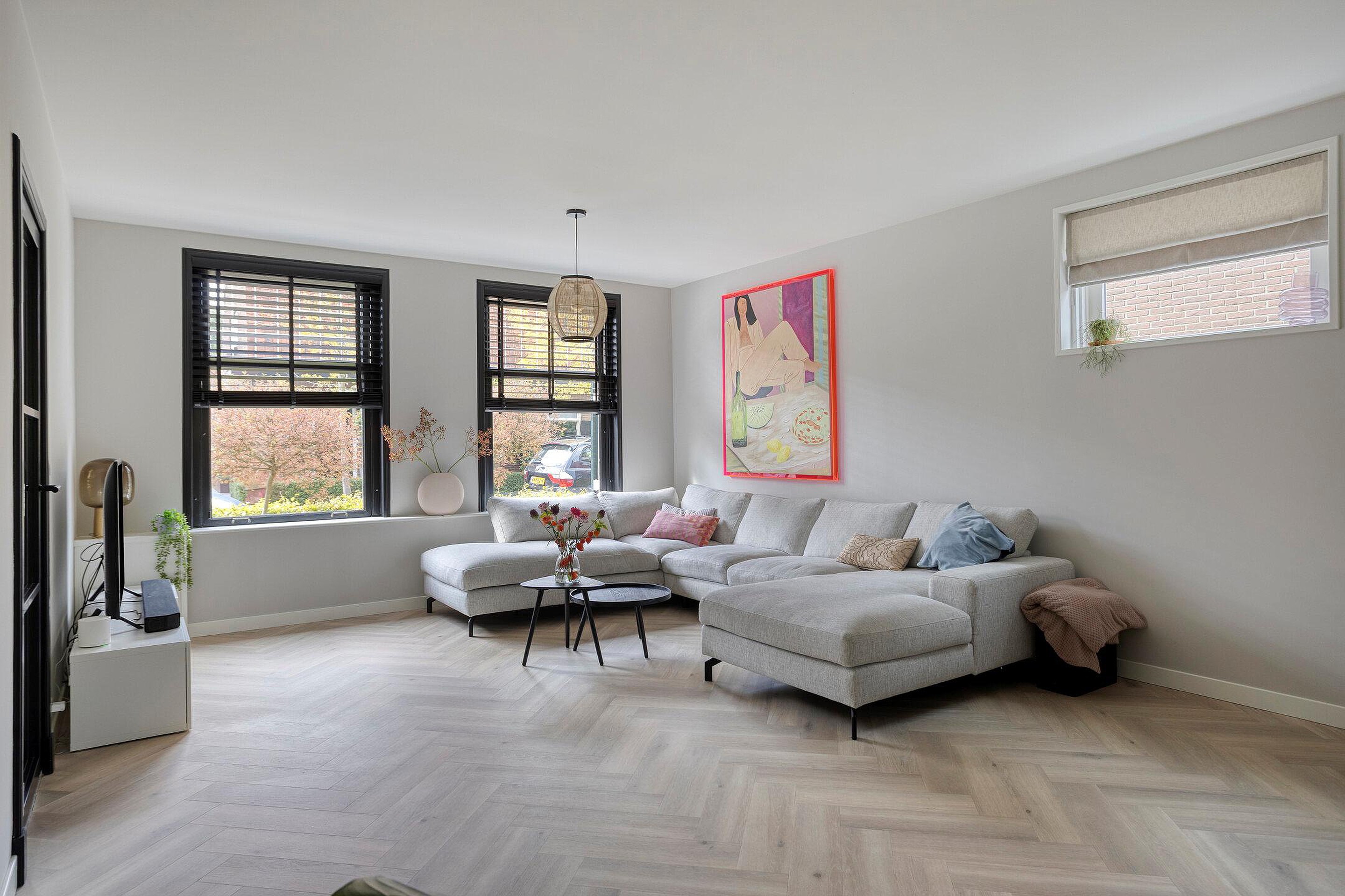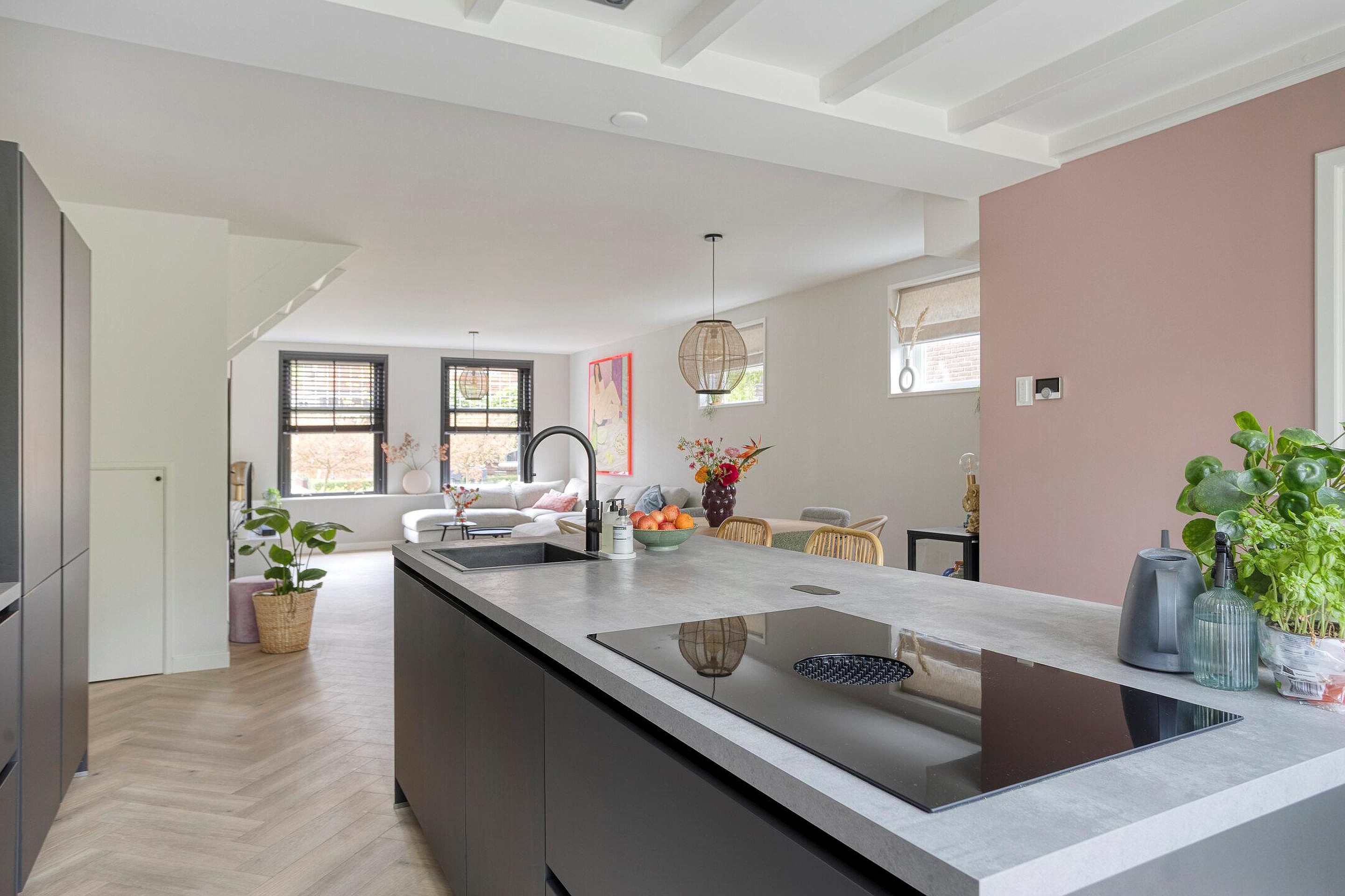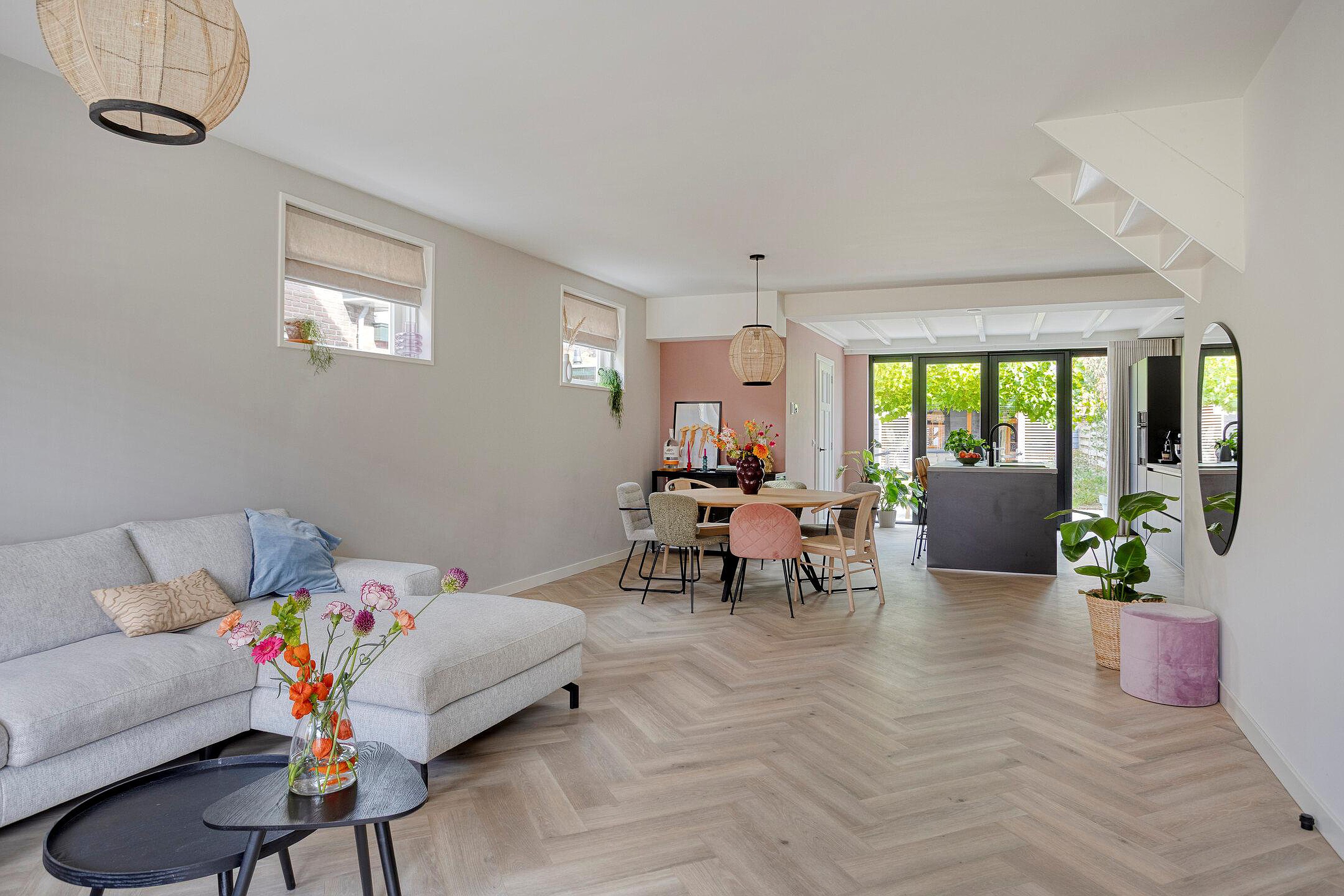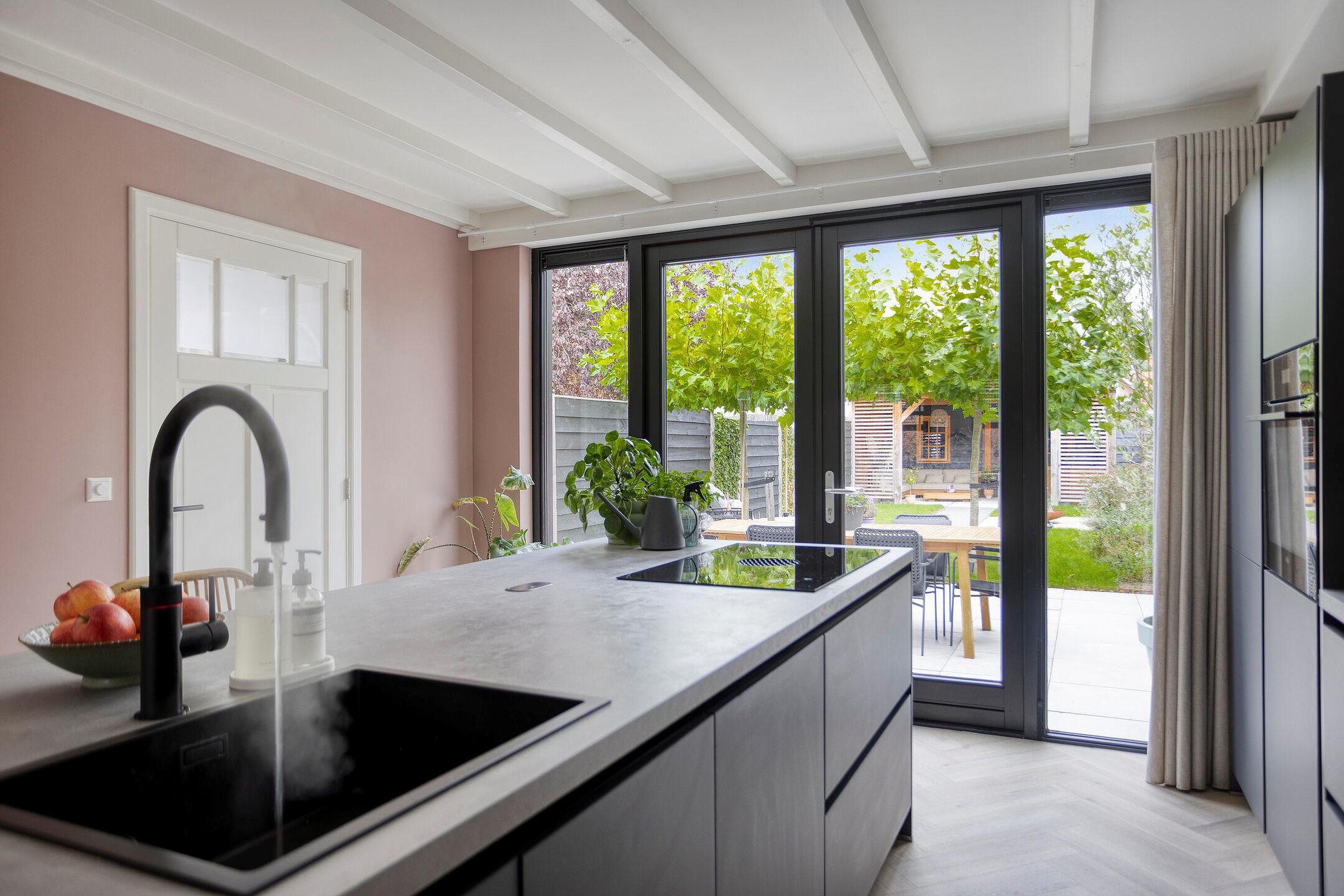 Stap binnen en ervaar de ruimte. De royale woonkamer is vergroot door een uitbouw en baadt in het licht dankzij de grote raampartijen en openslaande deuren naar de tuin. De visgraat PVC-vloer met vloerverwarming loopt drempelloos door en vormt de perfecte basis voor de strakke inrichting.